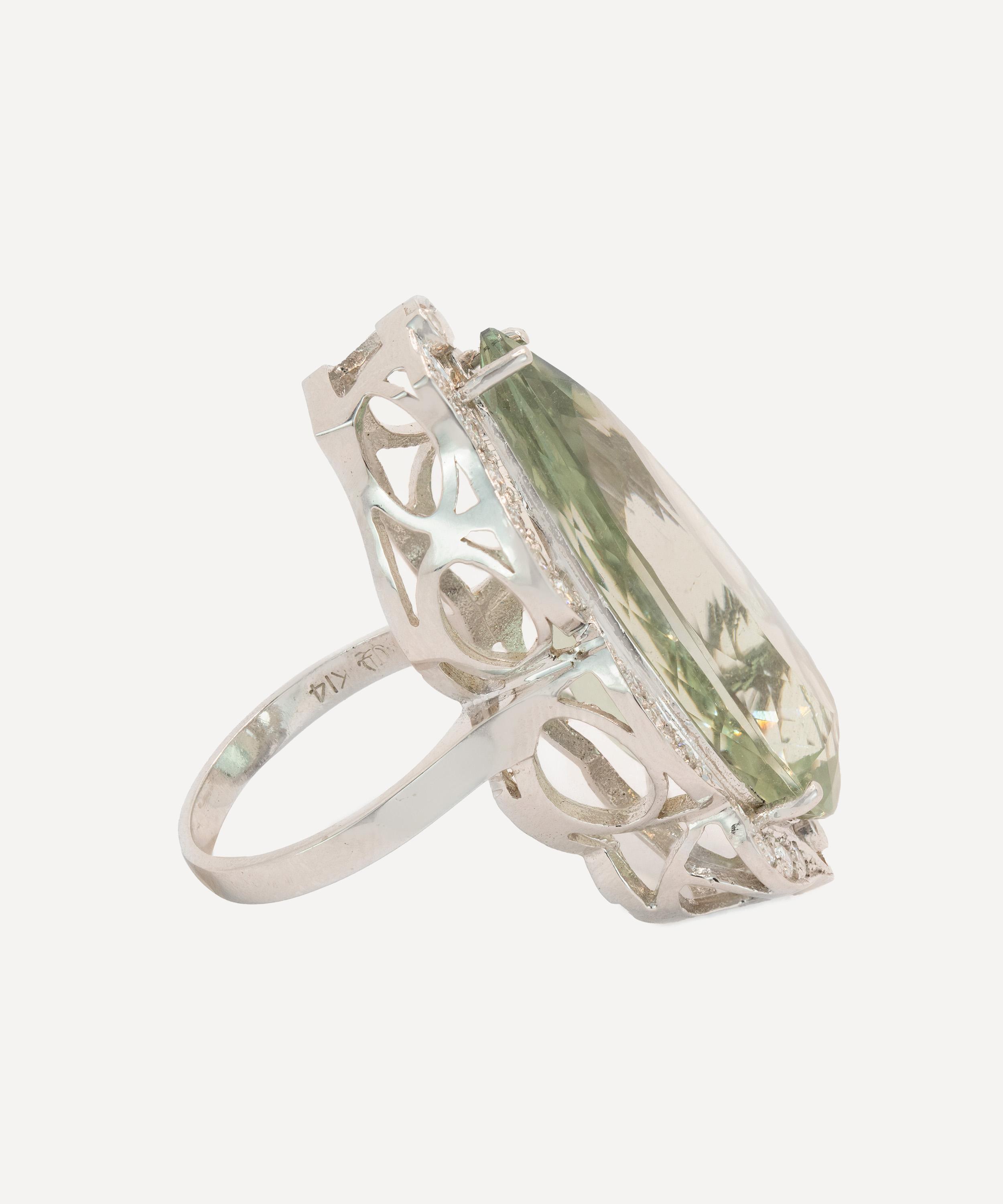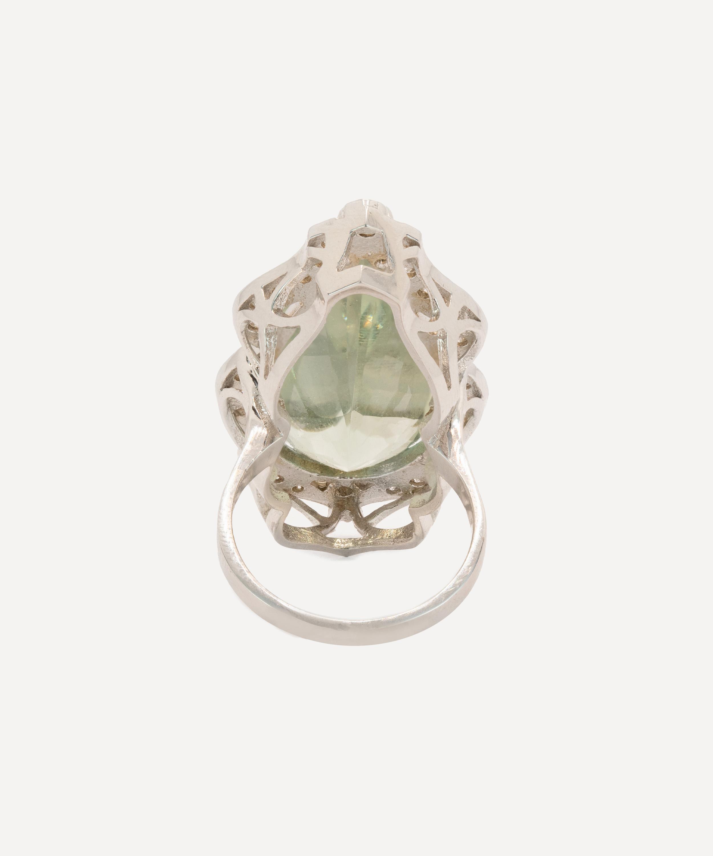 Rendered in 14ct white gold, it features a large pear-shaped prasiolite, framed by a scroll-like cluster of round brilliant cut diamonds. The setting is elevated on an ornate gallery, with a simple polished band to balance the elaborate top. Whether worn as a statement of refinement or a whisper of vintage charm, it will steal the spotlight and elevate every ensemble with its undeniable presence.
