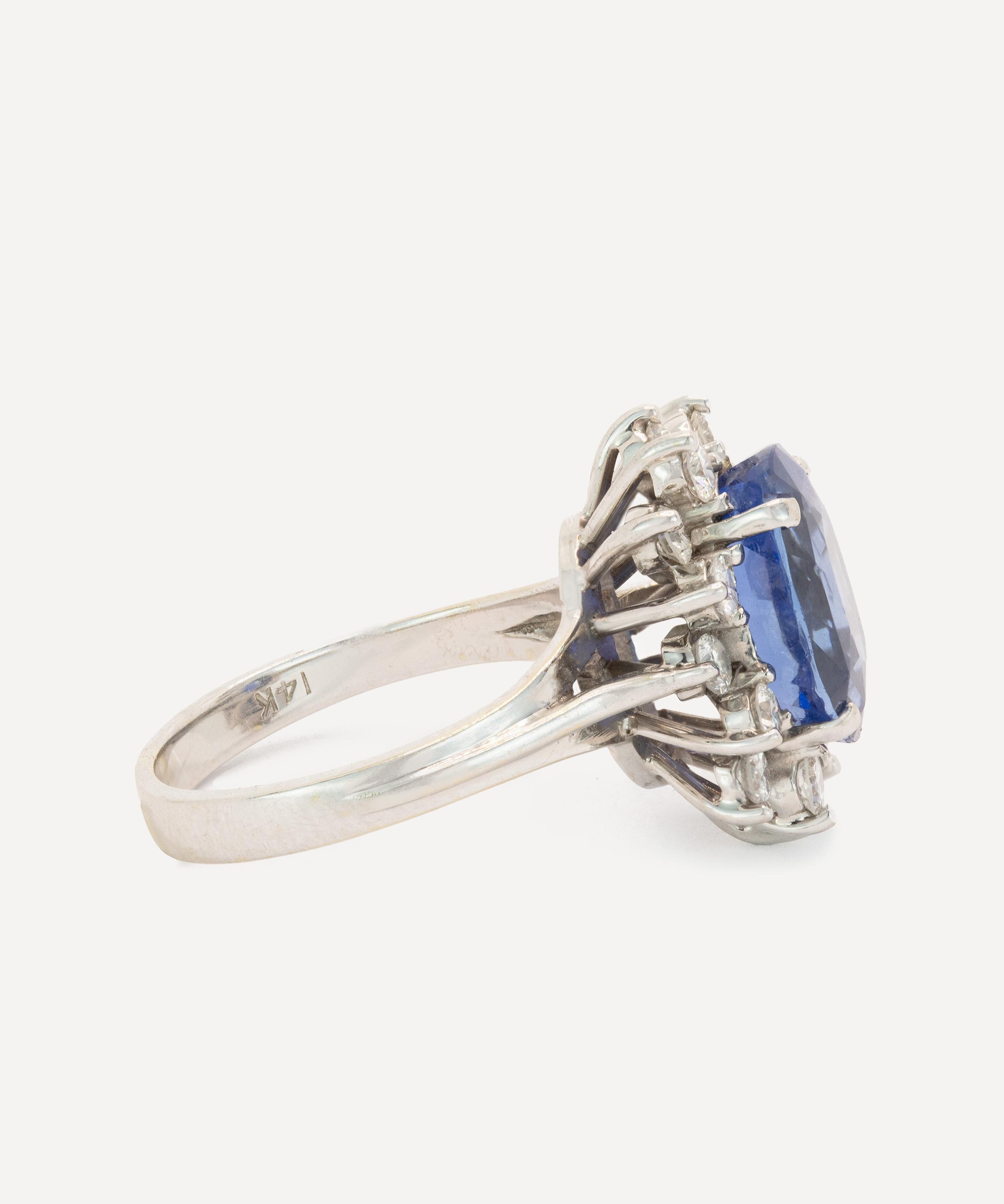 Rendered in 14ct white gold, it features an oval cut sapphire of exceptional quality, encircled by sixteen round brilliant cut diamonds, arranged on two alternating levels for added dimension and brilliance. The design is finished with bevelled shoulders and a polished band, creating a classic and elegant silhouette. Whether worn as a statement of refinement or a whisper of vintage charm, it will steal the spotlight and elevate every ensemble with its undeniable presence.