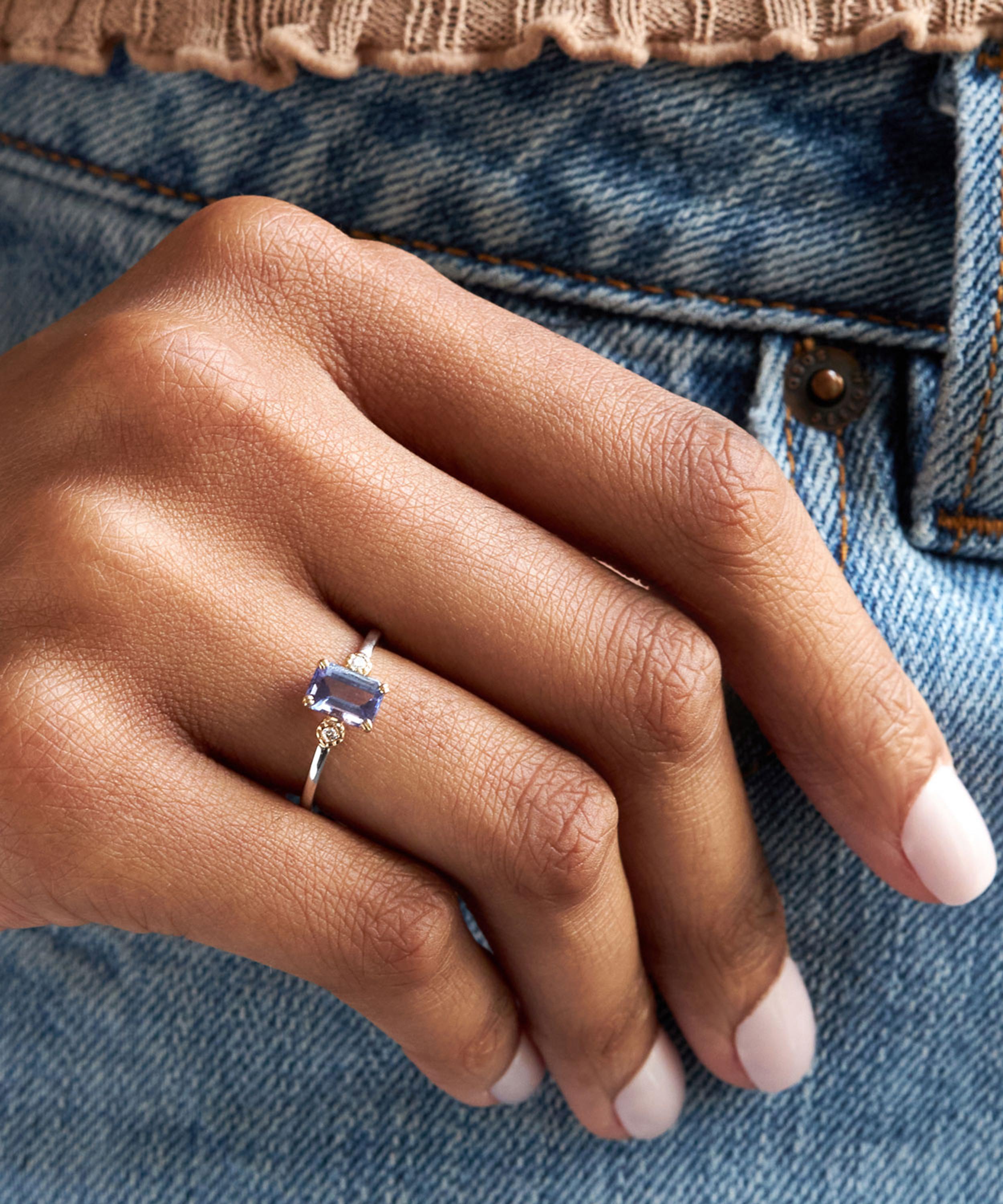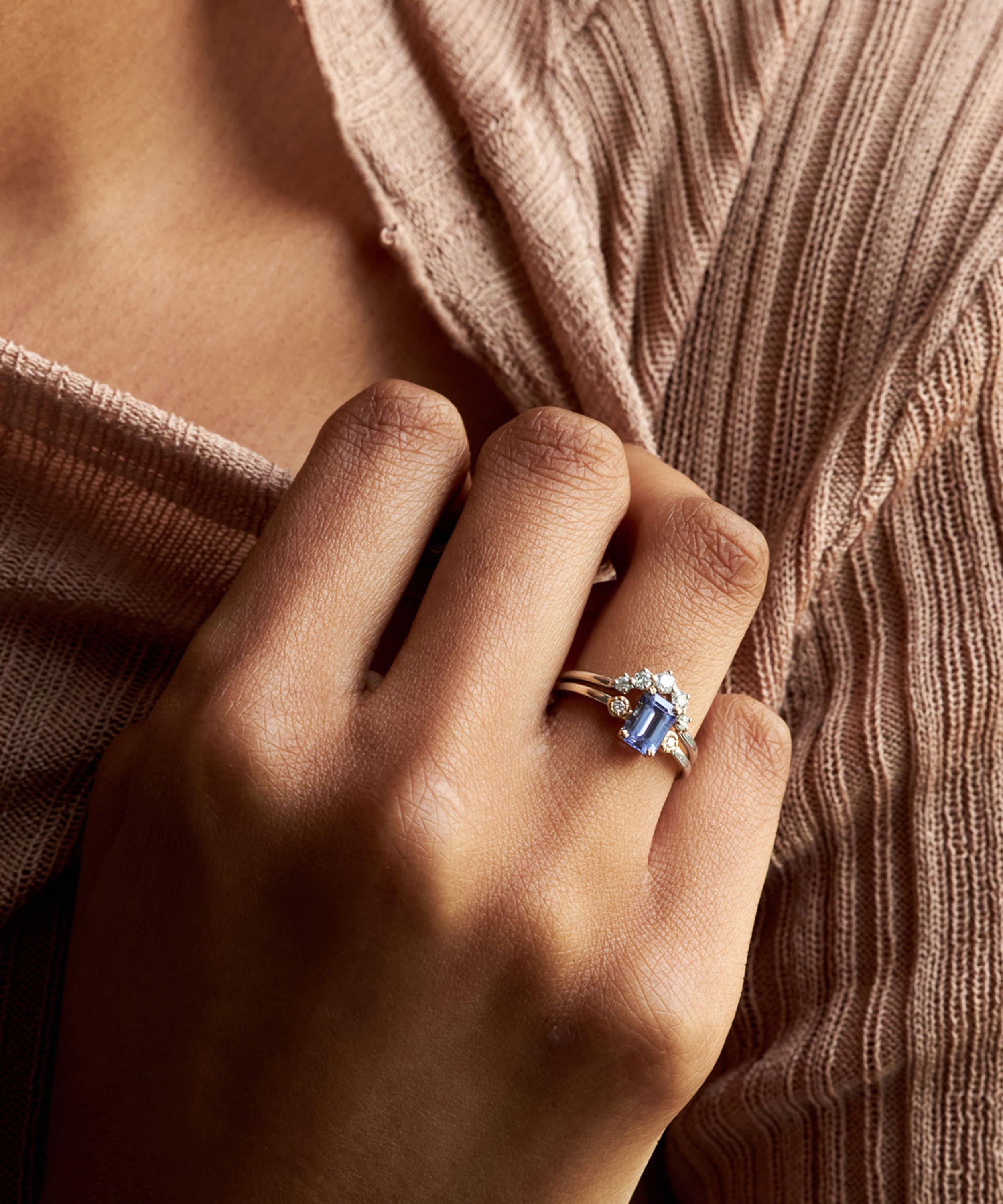 Heighten the impact of your ring curation with Dinny Hall’s unique Violet ring – inspired by the British flower meadow. Crafted from 14ct white gold, its beautiful design emanates Spring all year round, composed of a mesmerising, emerald-cut tanzanite in a 14ct gold setting, flanked by a brilliant-cut diamond on each shoulder.