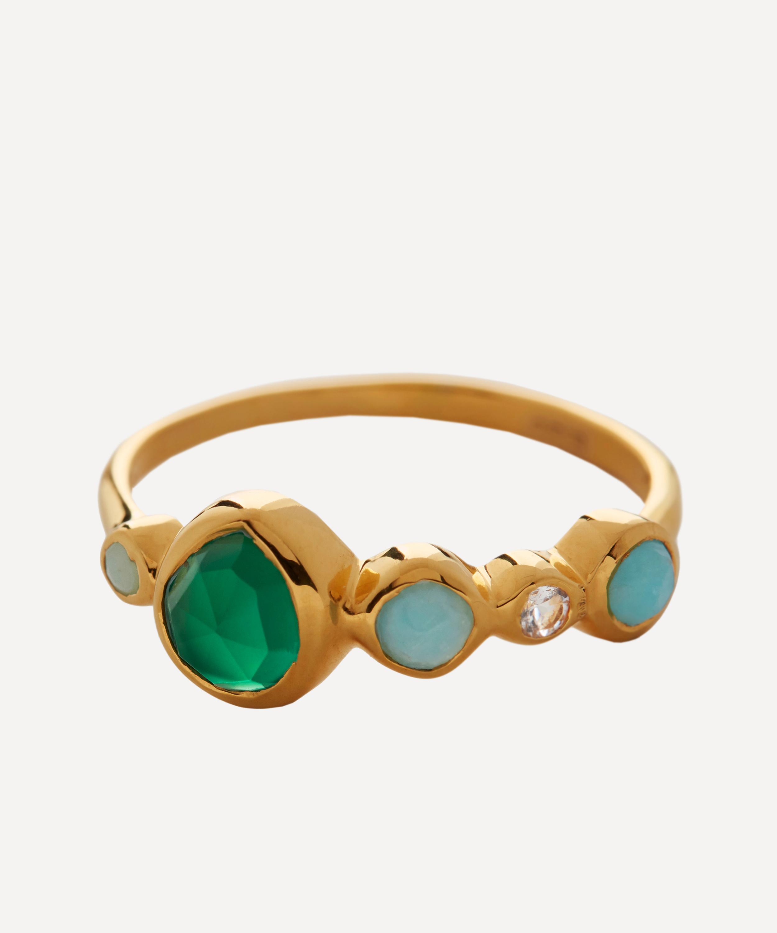 Crafted from sterling silver plated in 18ct gold vermeil, it is set with a trio of hand-cut gemstones, including green onyx, chrysoprase and clear rock crystal, for a unique finish. Each stone is nestled within a softly textured molten band, riffing on the ocean’s waves. Designed for stacking, it can also be worn as a solo piece or paired with other rings for effortless layering.