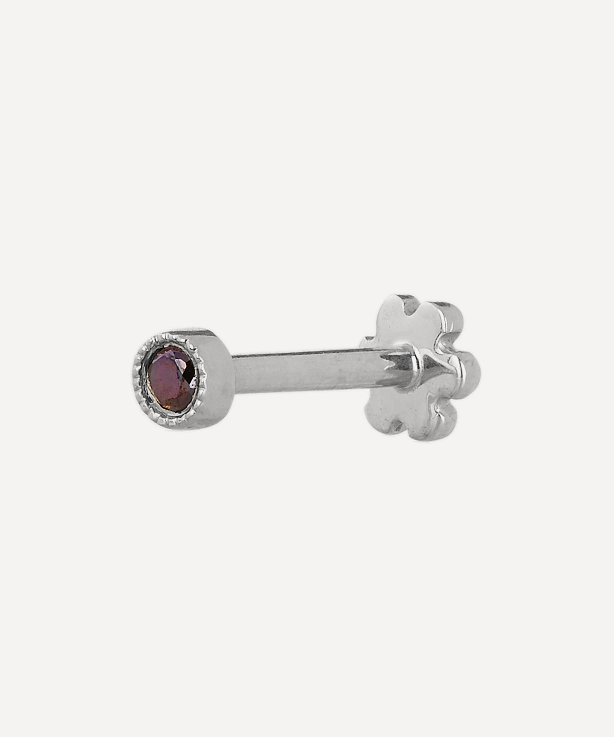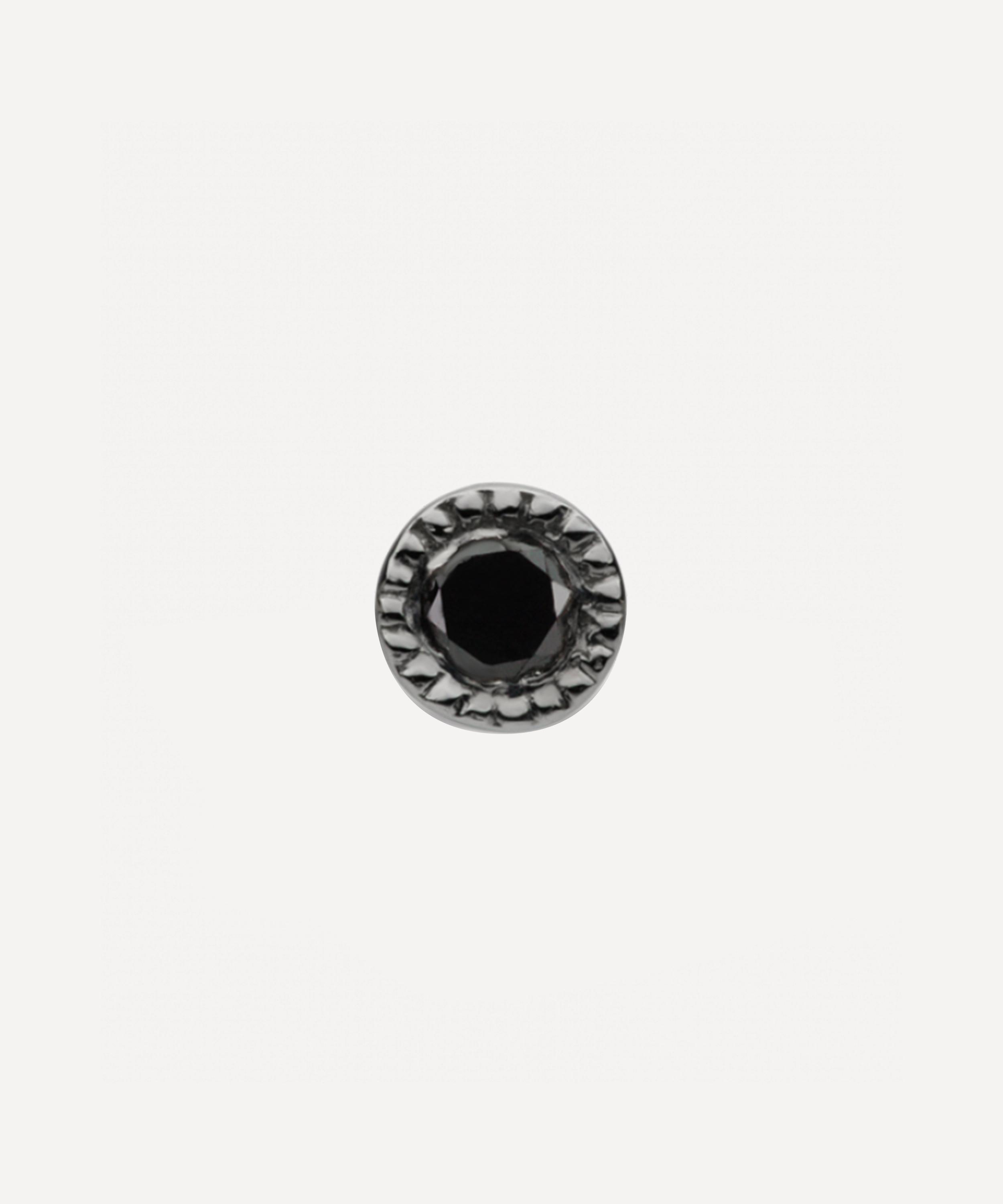 Available in multiple variations of high-polished 18 carat gold, this petite stud features a single glittering black diamond in a round bezel setting, with delicate milgrain edging adding a subtly scalloped effect. Complete with the brand's signature flower threaded backing, it styles beautifully in a range of lobe and cartilage piercings - wear it alone or alongside a contemporary cluster of studs and hoops for a subtly gothic sparkle.