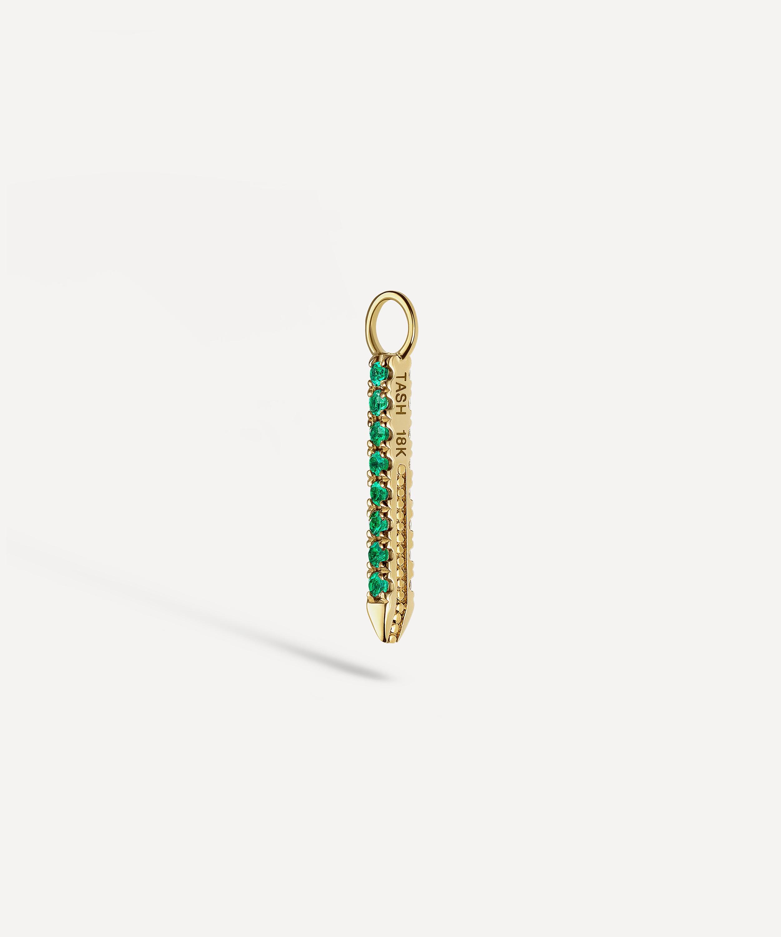 Crafted from high-polished 18 carat gold, this reversible earring charm features a short, pointed bar with eight green emeralds and eight white diamonds lining each side. Complete with a tiny top ring that can be attached at the front or back of the ear, it's perfect for transforming a classic hoop or simple stud into an elegant drop - try threading it onto a tragus, rook or helix earring for a subtly alternative finish.