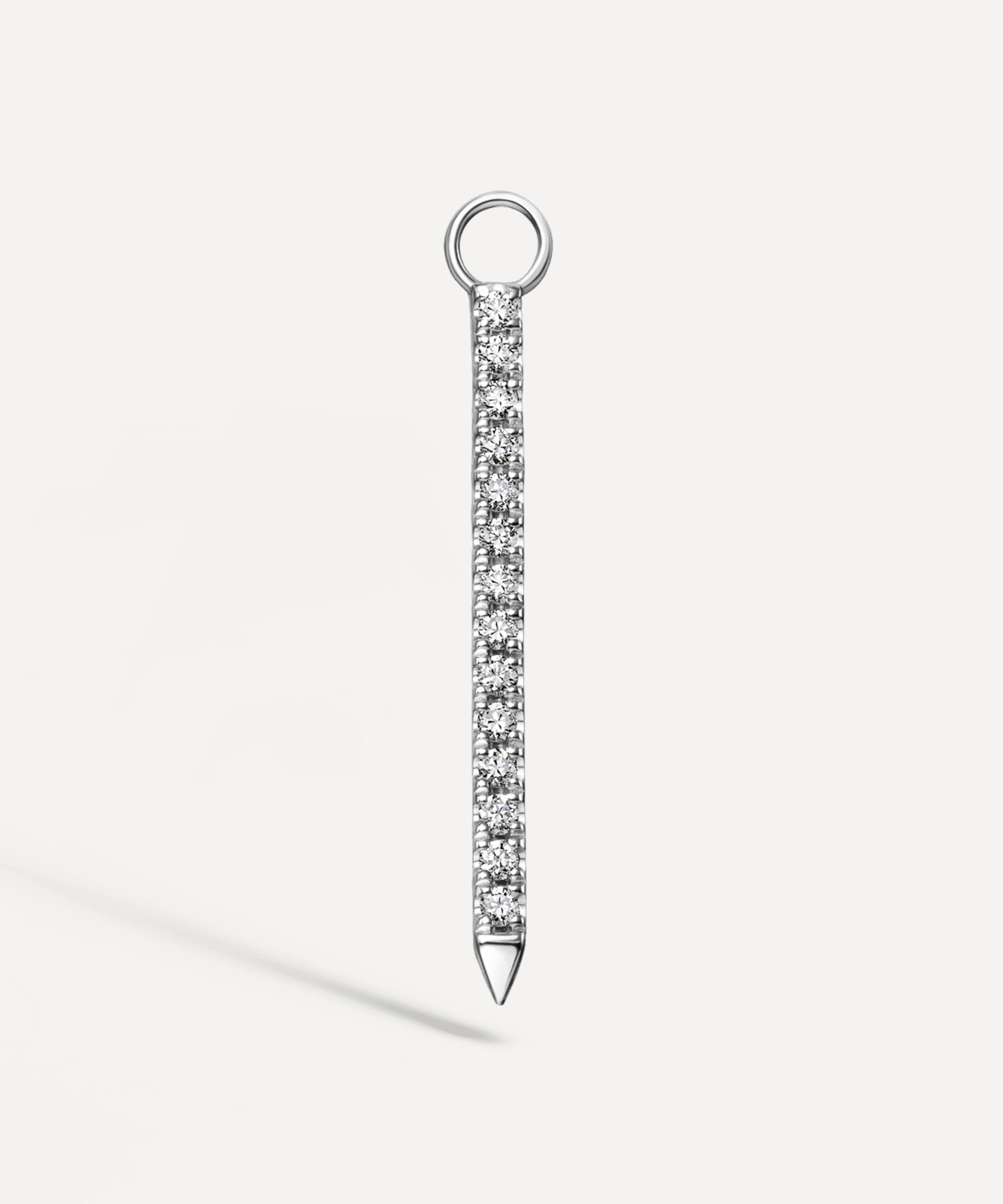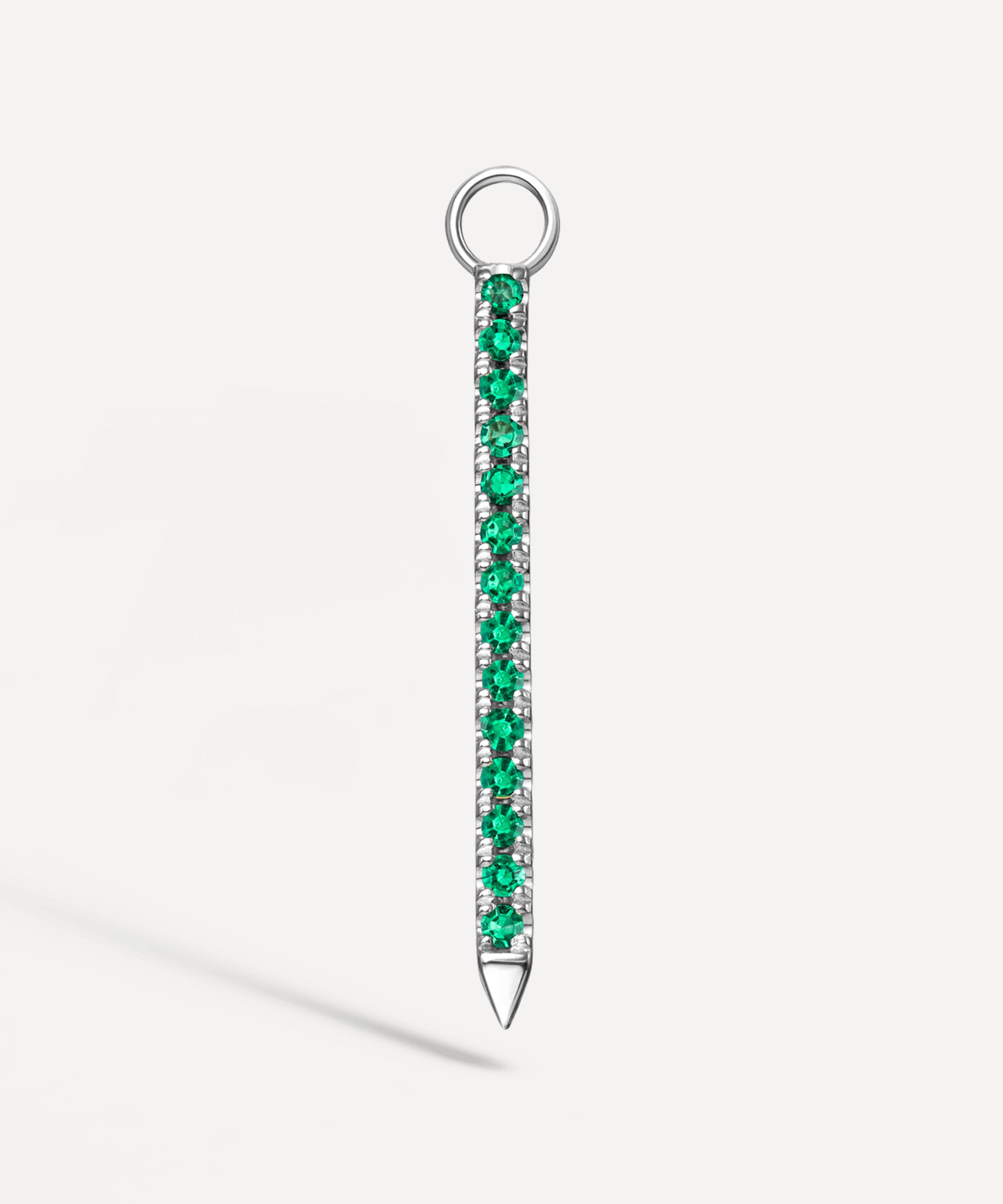 Crafted from 18 carat white gold, this reversible earring charm features a medium-length, pointed bar with 14 green emeralds and 14 white diamonds lining each side. Complete with a tiny top ring that can be attached at the front or back of the ear, it's perfect for transforming a classic hoop or simple stud into an elegant drop - try wearing it alongside one or two shorter bar charms for a striking graduated effect.