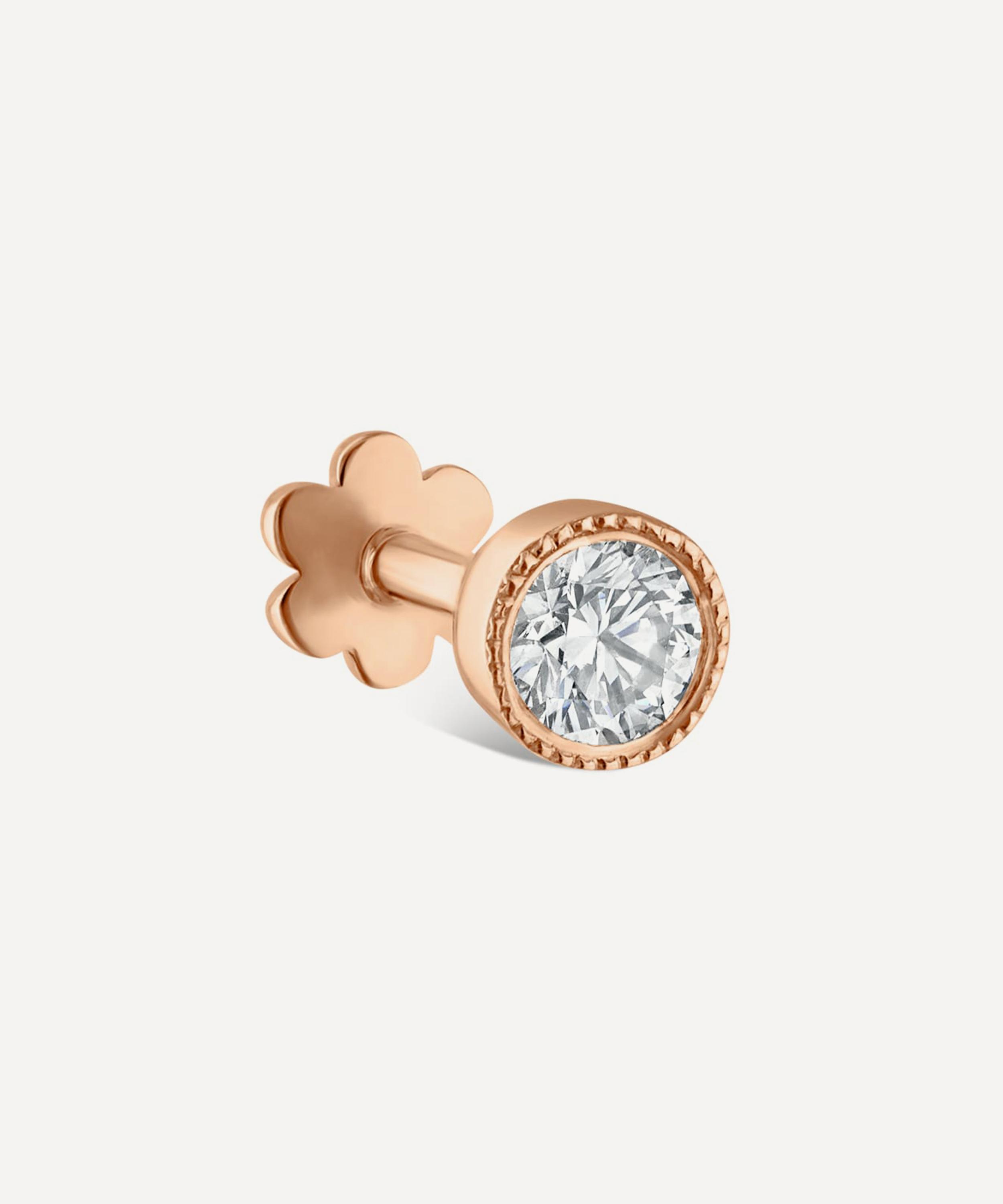 Available in multiple variations of high-polished 18 carat gold, this understated stud features a tiny 0.07-carat white diamond in a classic bezel setting, with intricate milgrain edging adding a subtly scalloped effect. Complete with the brand's signature flower threaded backing, it styles beautifully in a range of lobe and cartilage piercings - team it with several other single diamond studs for a dazzling dewdrop effect.