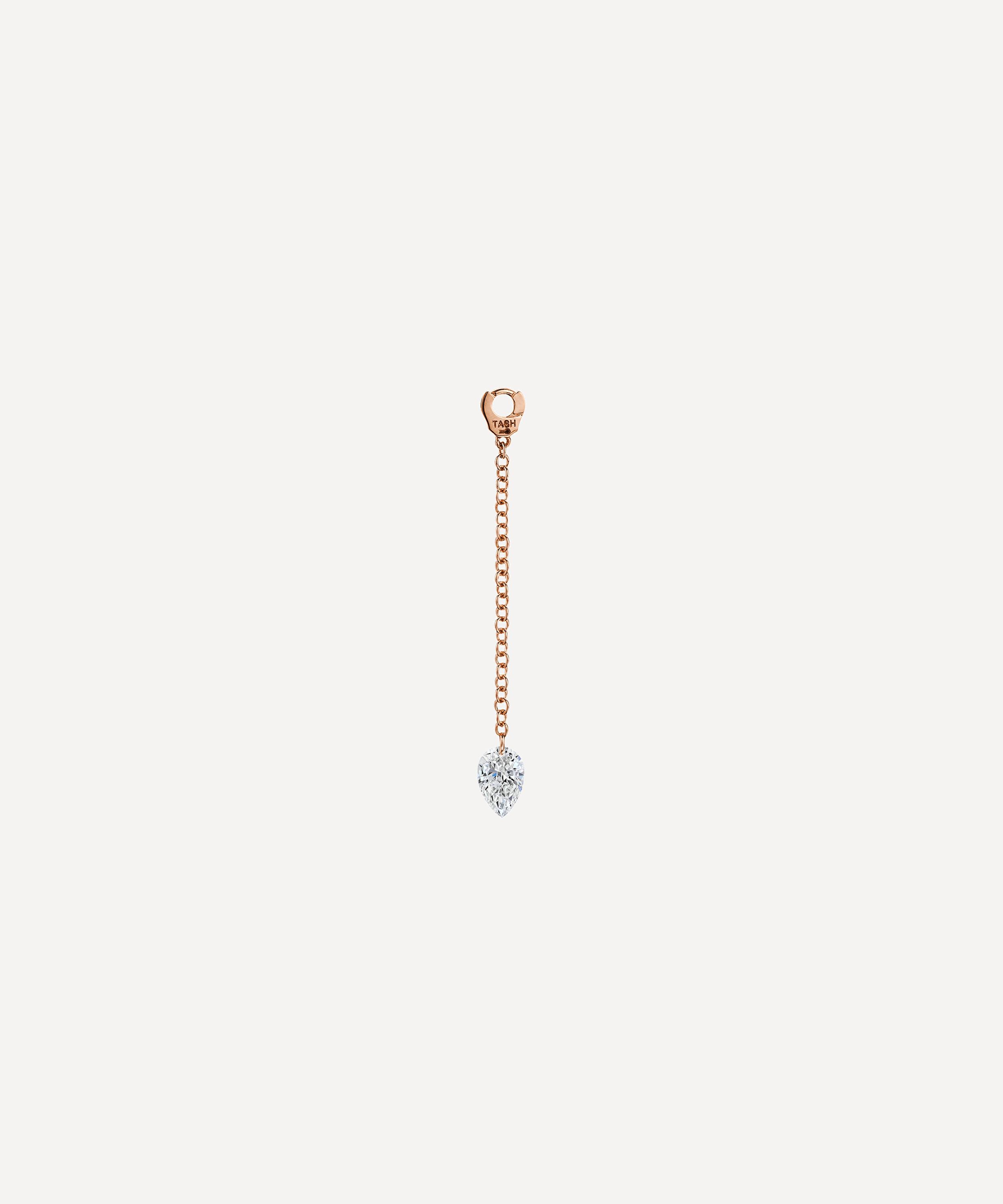 Available in multiple variations of high-polished 18 carat gold, this earring charm features a 0.18-carat, pear cut white diamond, floating on a short trace chain for a swinging pendulum effect. Complete with a signature handcuff jump ring that can be attached at the front or back of the earlobe, it is designed to fit a range of different earrings - perfect for transforming a classic hoop or simple stud into an elegant drop.