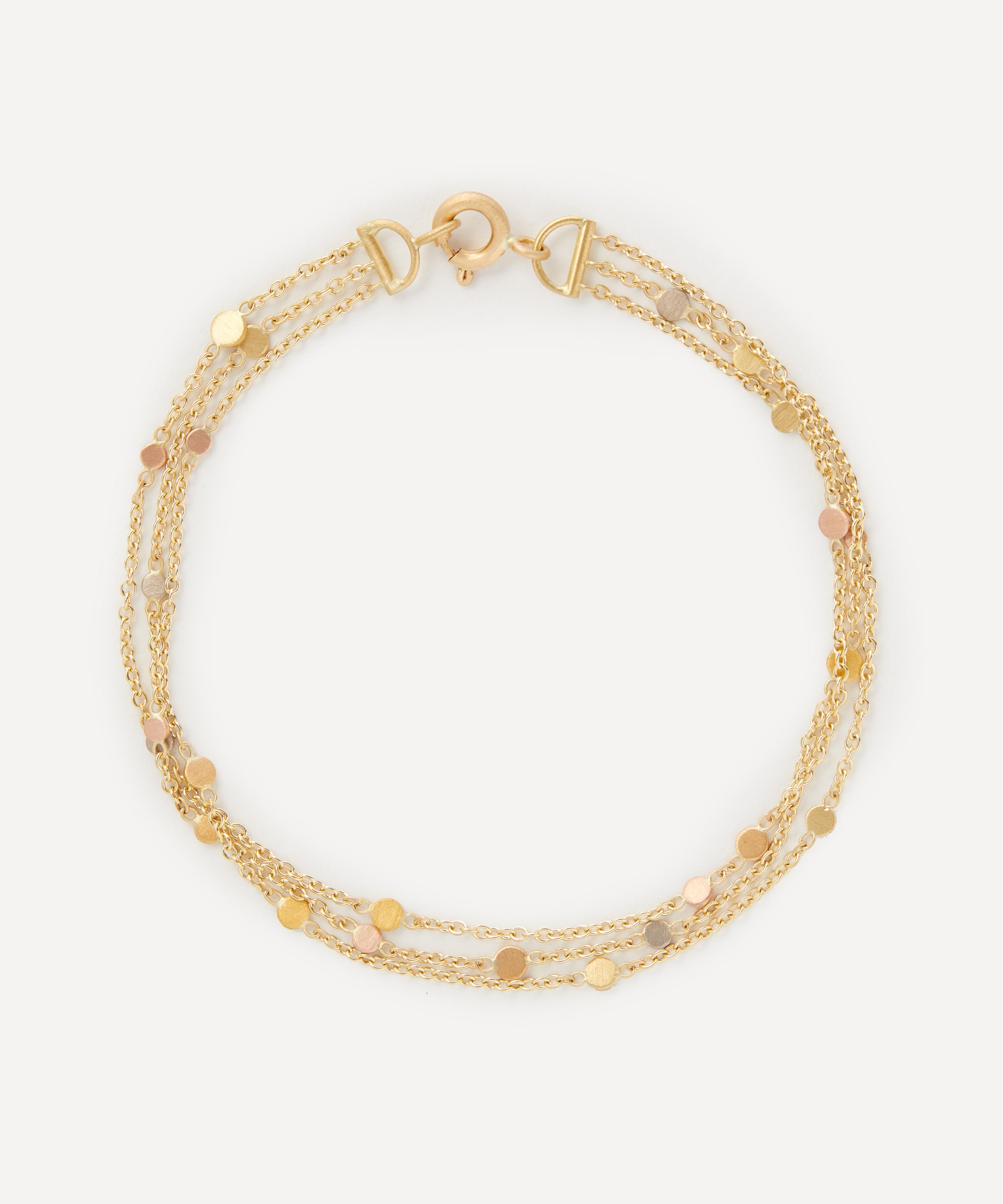 Sia Taylor's designs reflect a preoccupation with the natural world through her fresh interpretations of organic shapes and silhouettes. Handcrafted in the designer's London studio, this bracelet features a trio of fine trace chains with tiny gold, rose gold, white gold and platinum dot charms scattered across each one. An understated addition to any jewellery curation, it styles beautifully alone or stacked with other favourites.