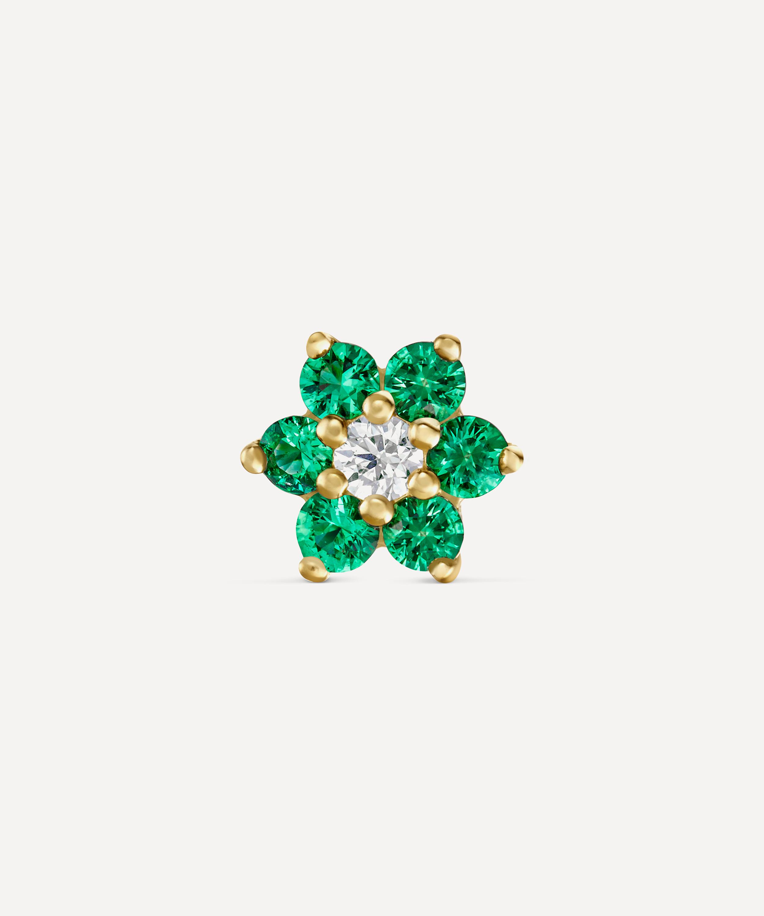 Crafted from 18 carat gold, this subtly sparkling stud features an emerald set flower with one lustrous diamond fitted at the centre. Complete with the brand's signature flower threaded backing, it styles beautifully in a range of lobe and cartilage piercings - wear it alone or alongside a contemporary cluster of studs and hoops for a memorable everyday look.
