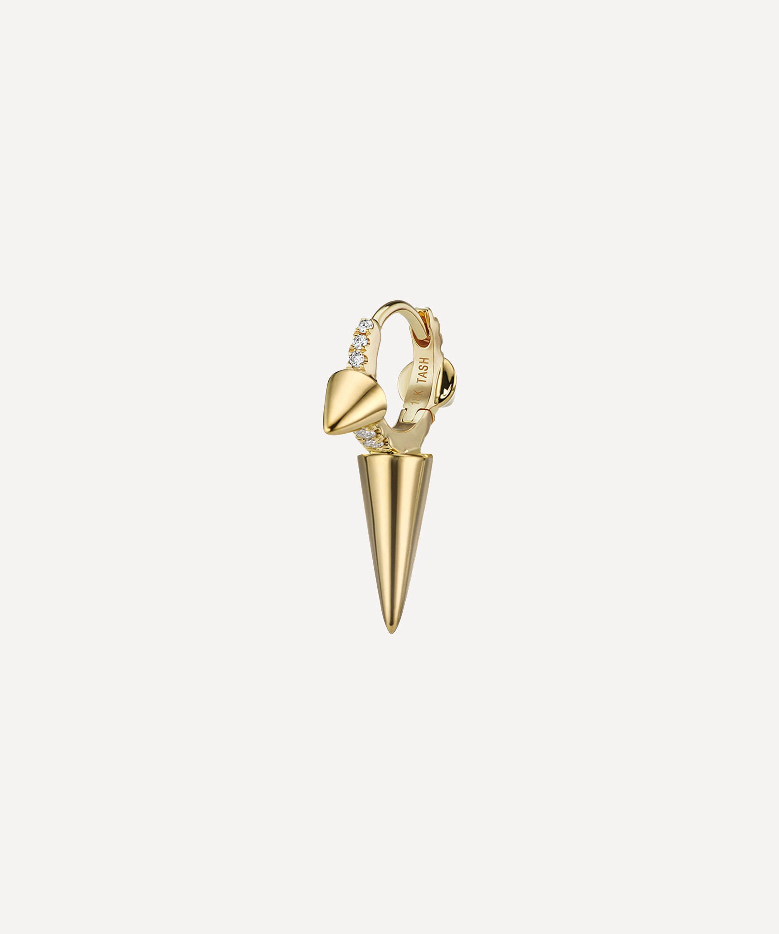 Available in multiple variations of high-polished 18 carat gold, this spiked hoop is set with a single row of glittering white diamonds along the outer edge for a dazzling, 360-degree sparkle. Complete with a convenient clicker fastening, it styles beautifully in any lobe piercing, with the long central spike creating a dramatic, punk-inspired drop. Try yours with diamond-encrusted studs and stacks of huggie hoops for the full Tash effect.