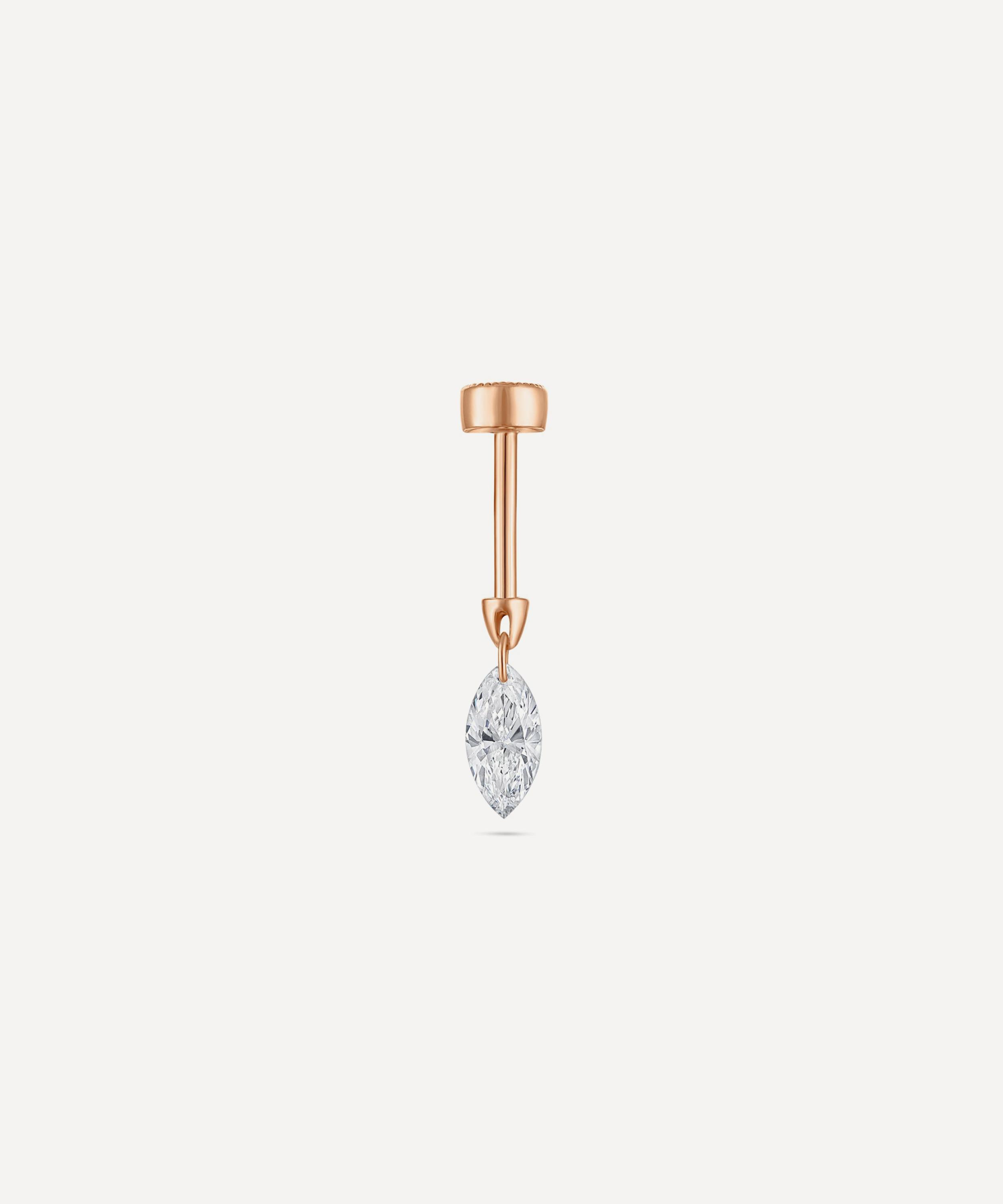 Available in multiple variations of high-polished 18 carat gold, this single stud earring features a small pointed spike with a 0.22-carat, marquise cut white diamond charm that appears as if it's floating thanks to a discreet jump ring attachment. Complete with a diamond-encrusted threaded backing, it styles beautifully in a range of lobe and cartilage piercings - team it with several of the designer's signature single diamond studs for a dazzling dewdrop effect.