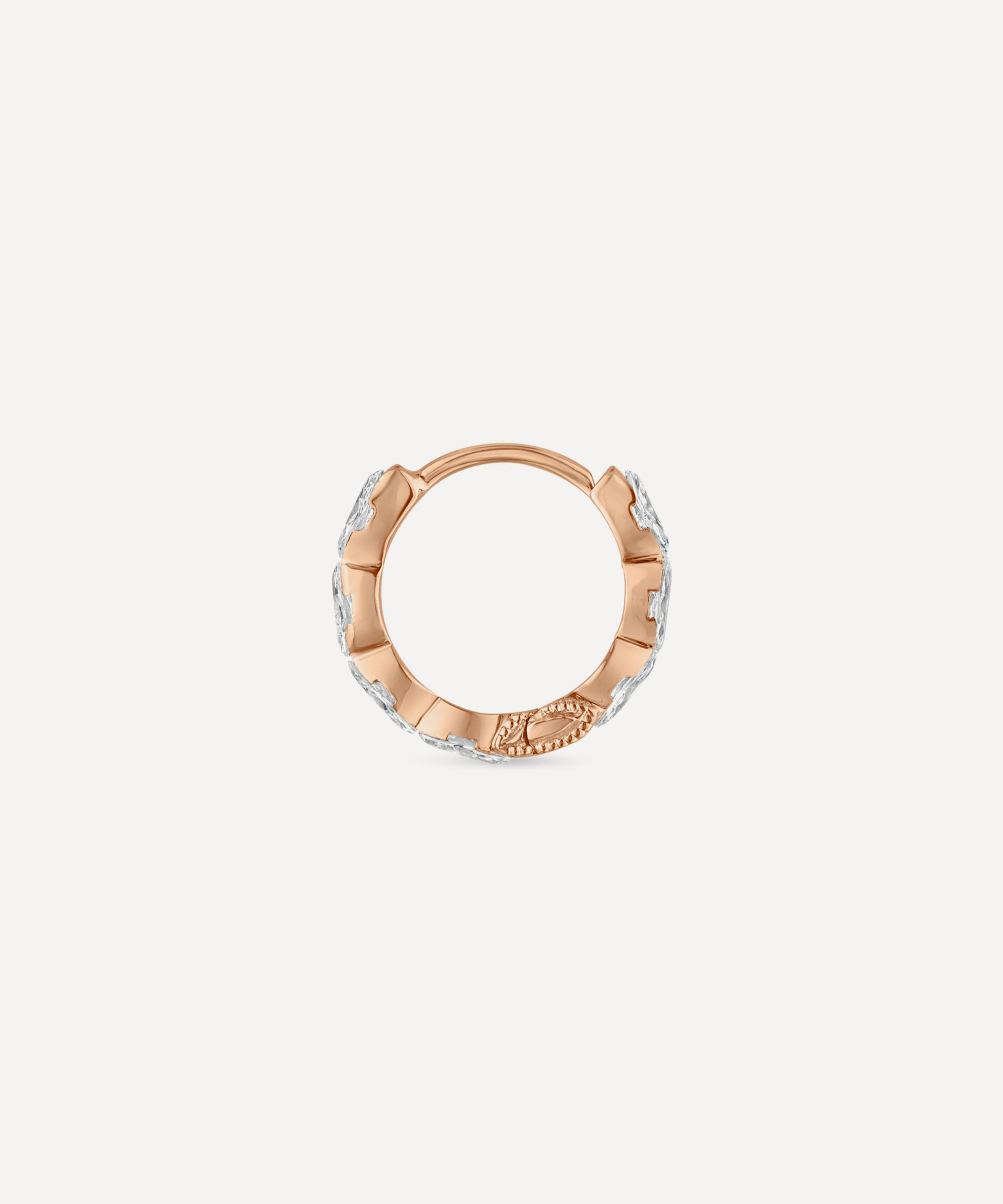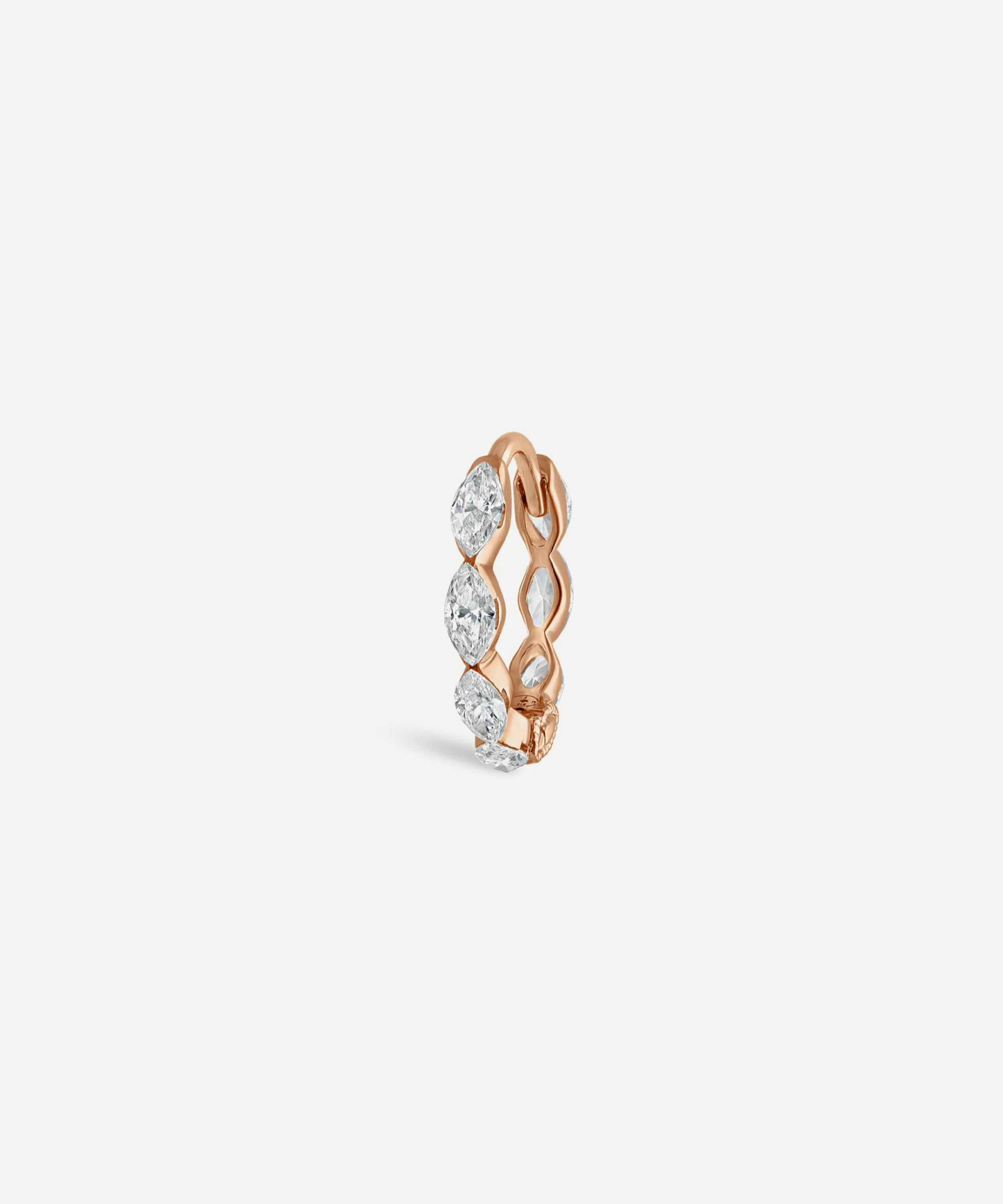 Available in multiple variations of high-polished 18 carat gold, this single hoop features seven glittering marquise cut white diamonds, presented in invisible settings for a subtly scalloped finish. Complete with a convenient clicker fastening, it styles beautifully in both helix and lobe piercings, with the helix offering a slightly looser fit. Try yours with diamond-encrusted studs and stacks of huggie hoops for the full Tash effect.