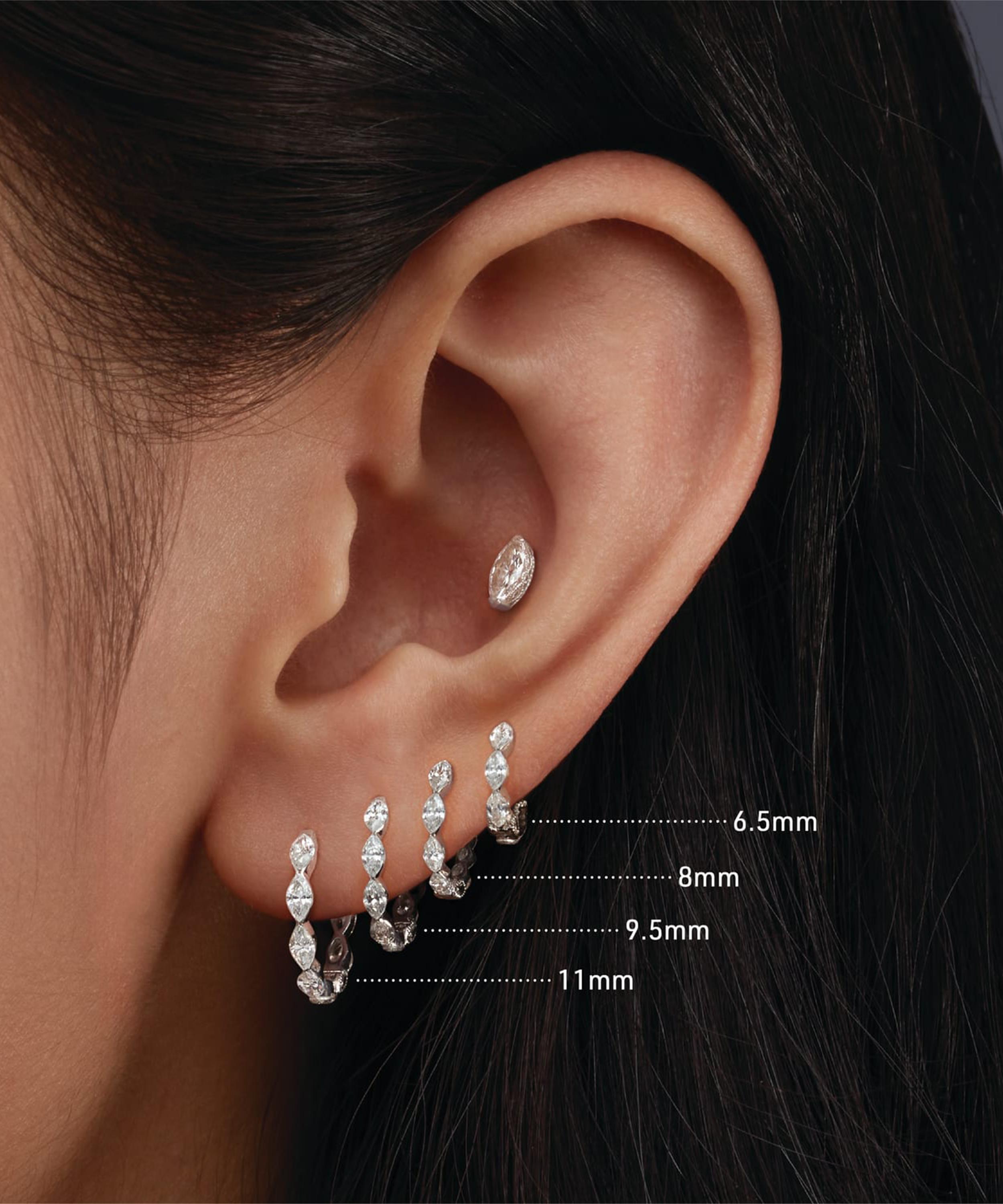 Available in multiple variations of high-polished 18 carat gold, this single hoop features seven glittering marquise cut white diamonds, presented in invisible settings for a subtly scalloped finish. Complete with a convenient clicker fastening, it styles beautifully in in conch, daith, helix and lobe piercings, with the helix offering a looser fit. Try yours with diamond-encrusted studs and stacks of huggie hoops for the full Tash effect.