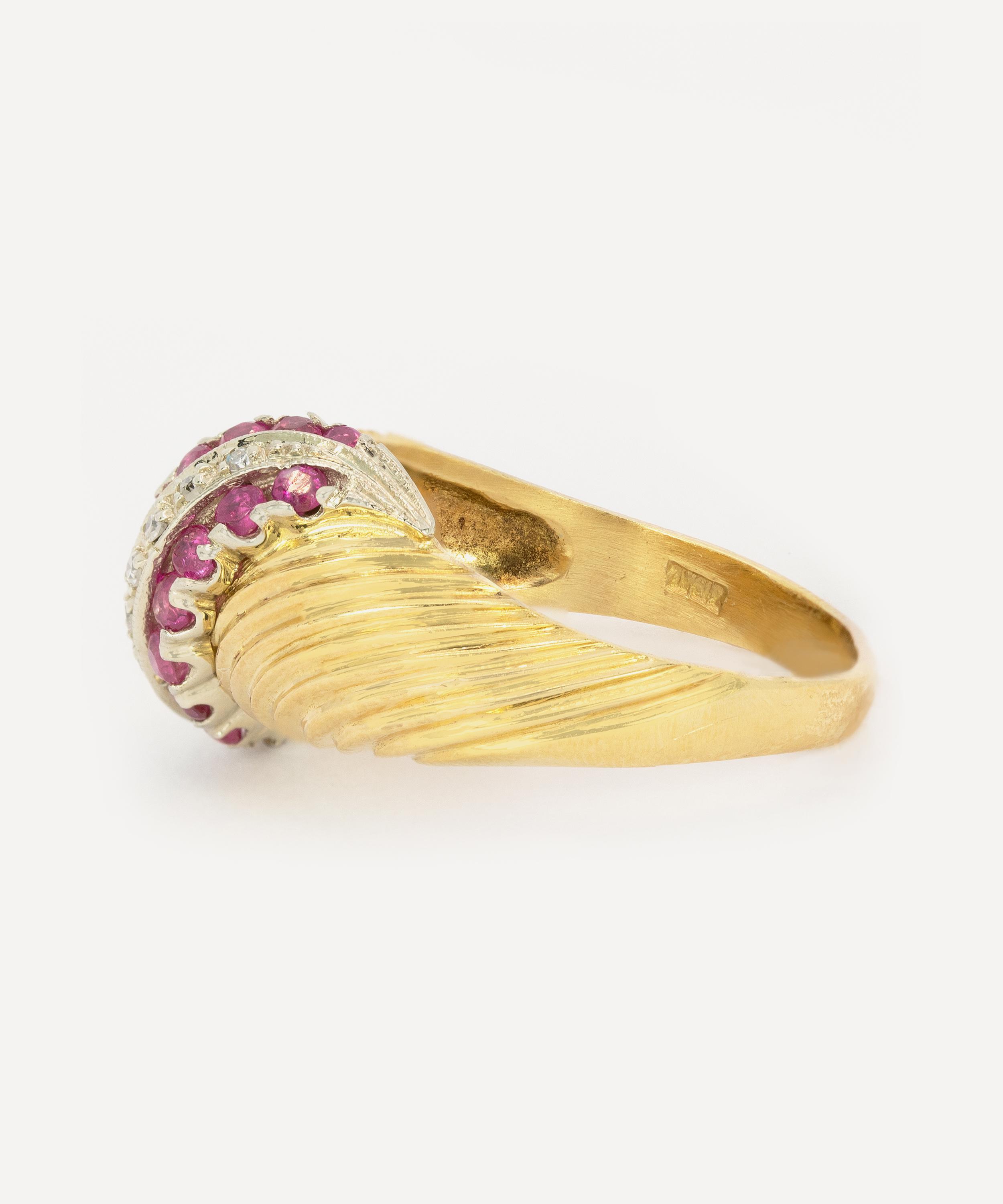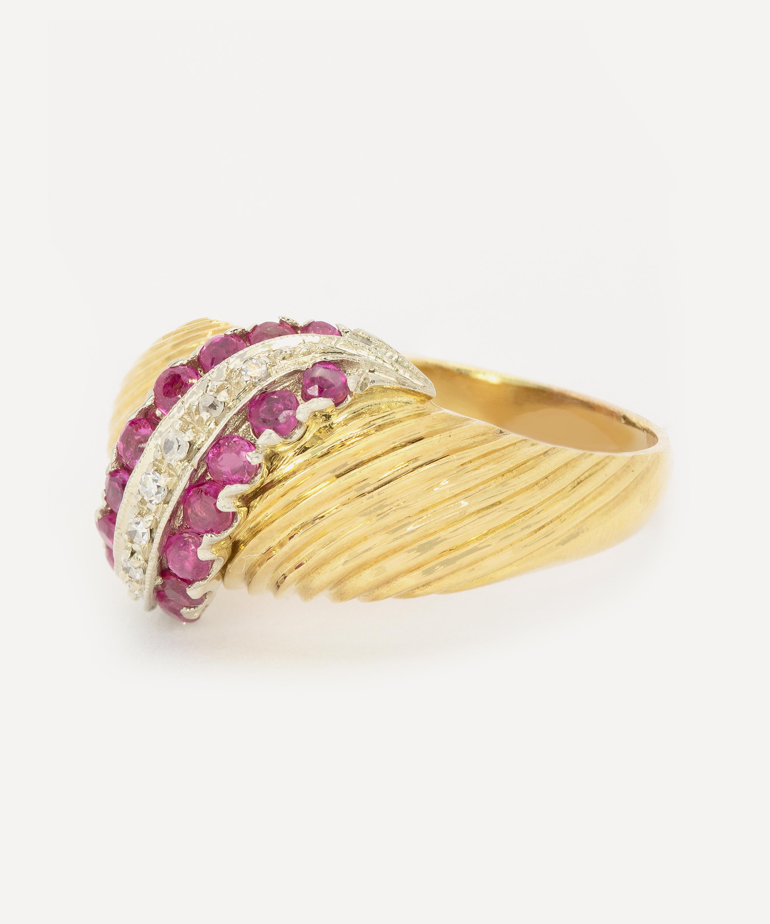 Crafted from solid 18 carat gold, this ring features a chunky, tapering band with fluted detailing and a swirl of round cut rubies and single cut white diamonds cutting across the front. An elegant example of timeless vintage jewellery, wear this piece alone to showcase its unique brilliance, or incorporate it into your existing curation and let it become the focal point of any look.
