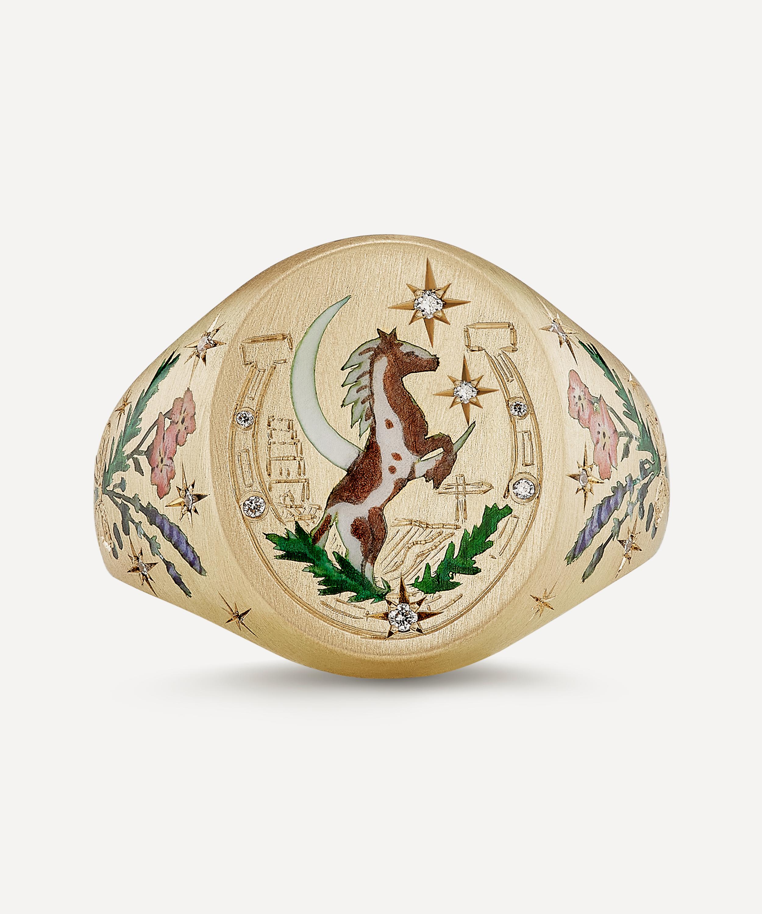 Handcrafted from frosted 18 carat gold, it features an oval-shaped face accented with an enamel horse and hand-tied bouquets of wildflowers. The miniature scene is intricately engraved with a horseshoe at the centre, finished with a star-set diamonds sky. A wearable work of art, it's perfect for gifting or adding to your own jewellery line-up - style it solo or mix and match with other favourites.