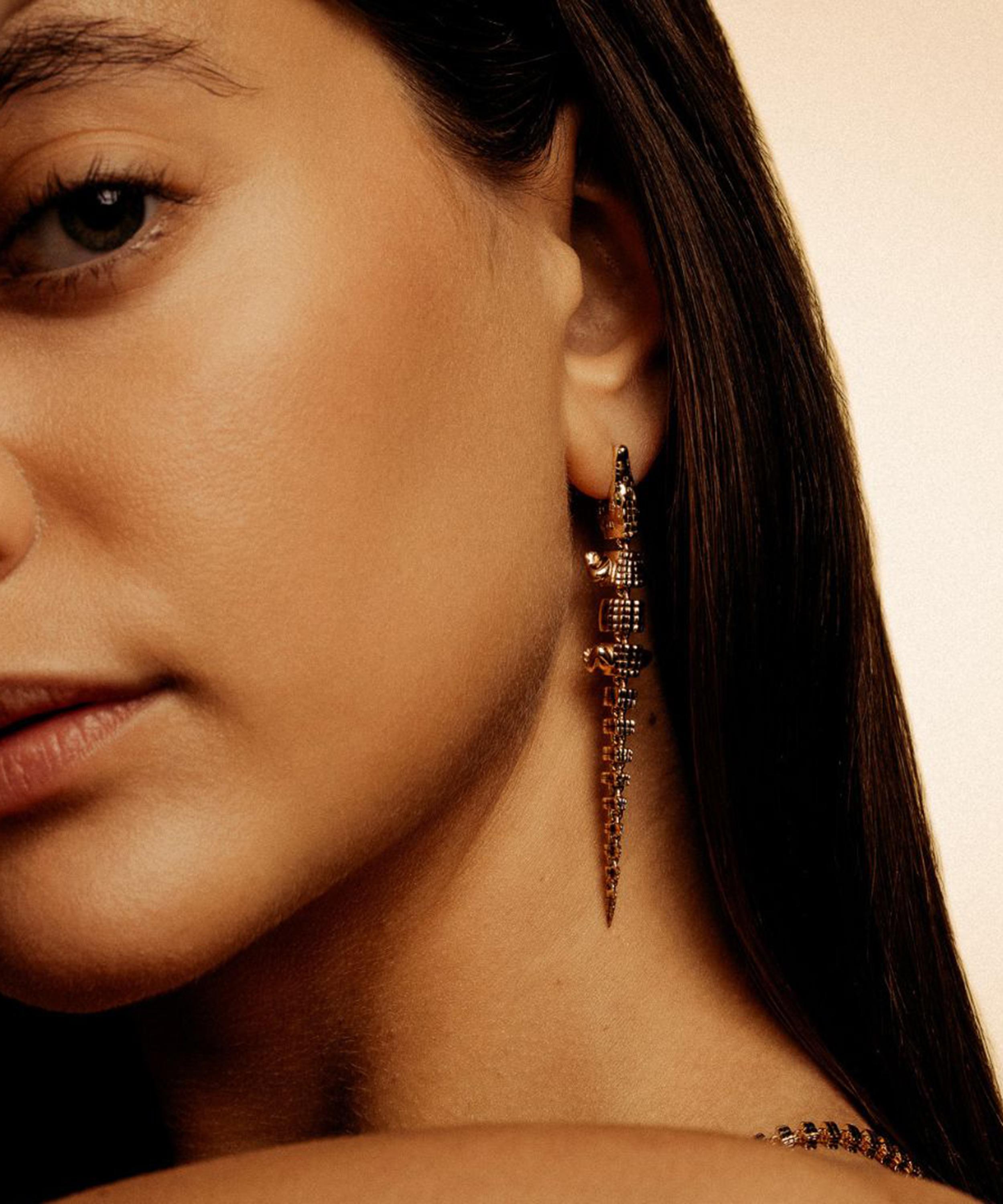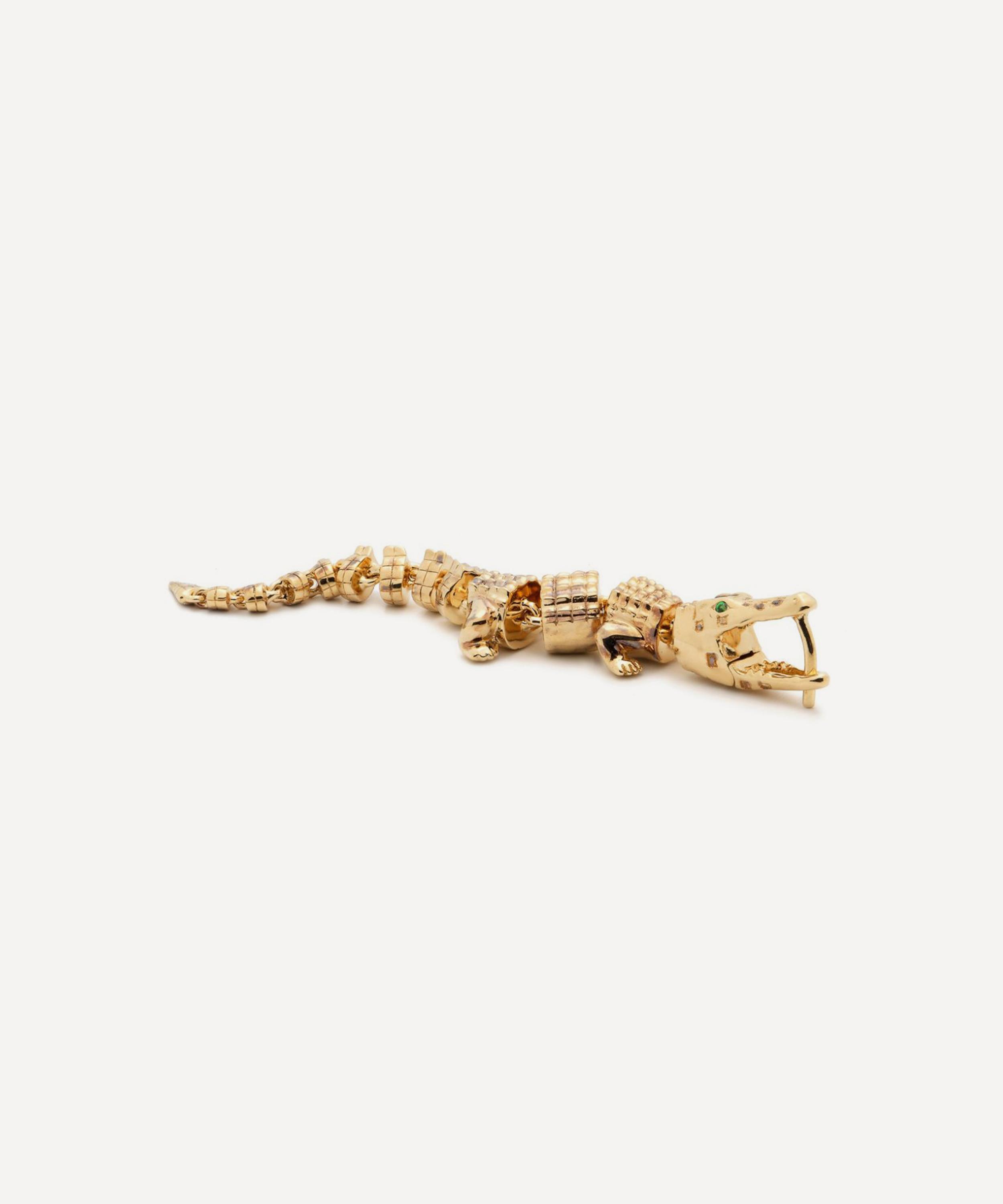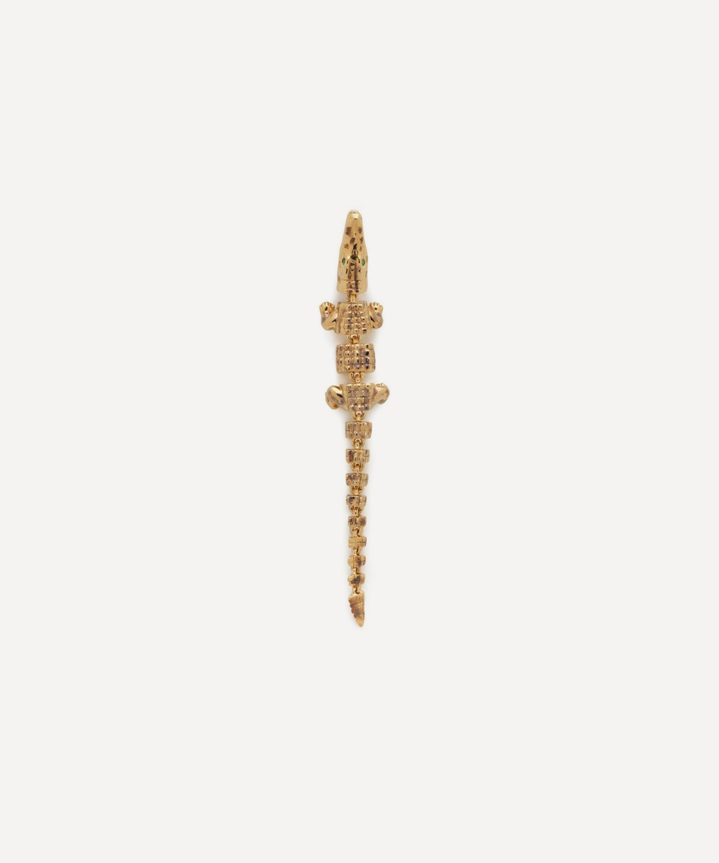 Inspired by the natural world and its endless contradictions – strength and grace, danger and beauty – this piece captures the fluidity of an alligator’s spine encased in 18ct gold. Dangling elegantly from the lobe, its sculptural body is glinting with two tsavorite set eyes, exuding a hypnotic glamour. Whether styled in a curated ear stack, as a matching pair or a pendant, wear it as a symbol of your own evolution – untamed, unapologetic, and entirely unique.