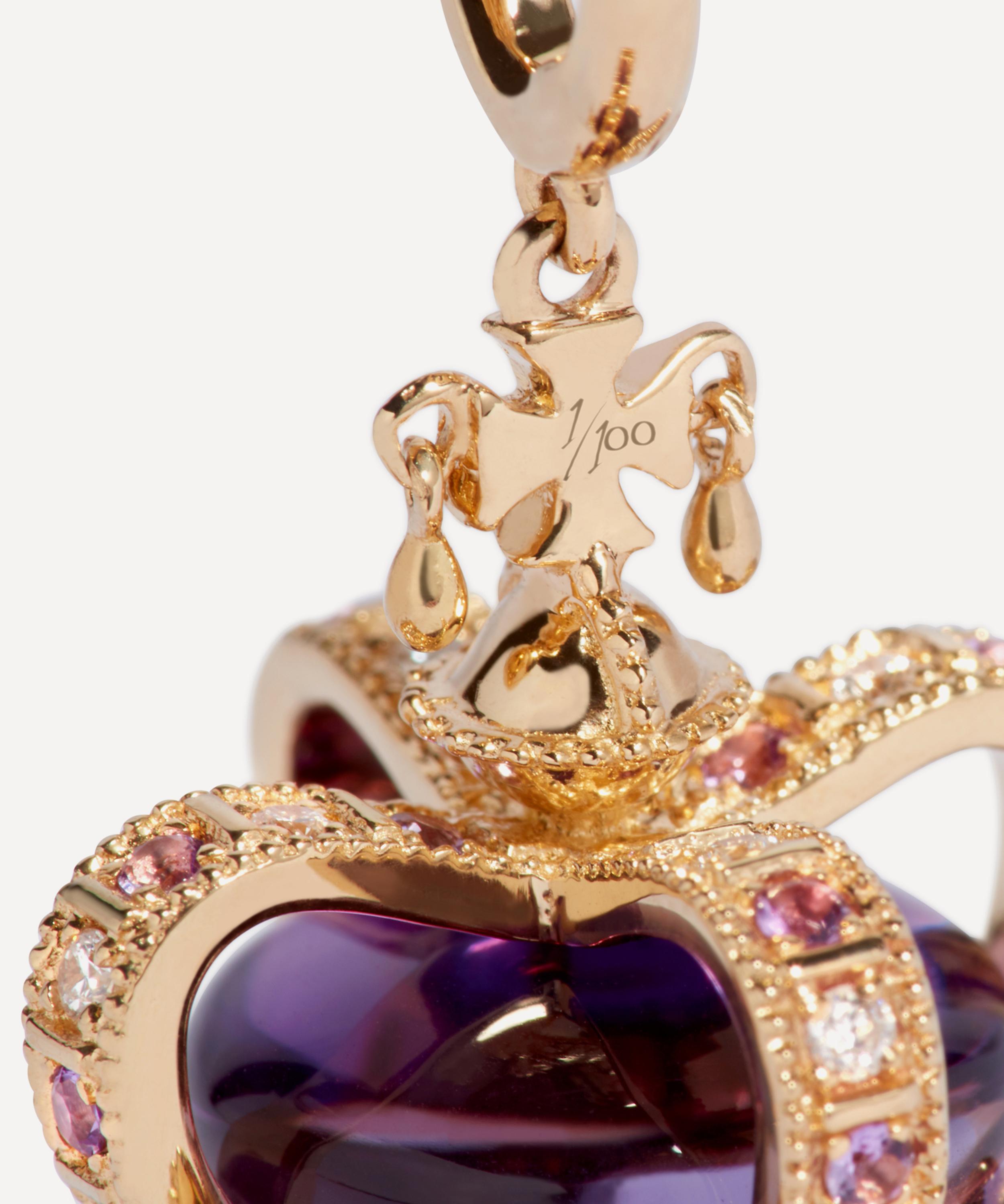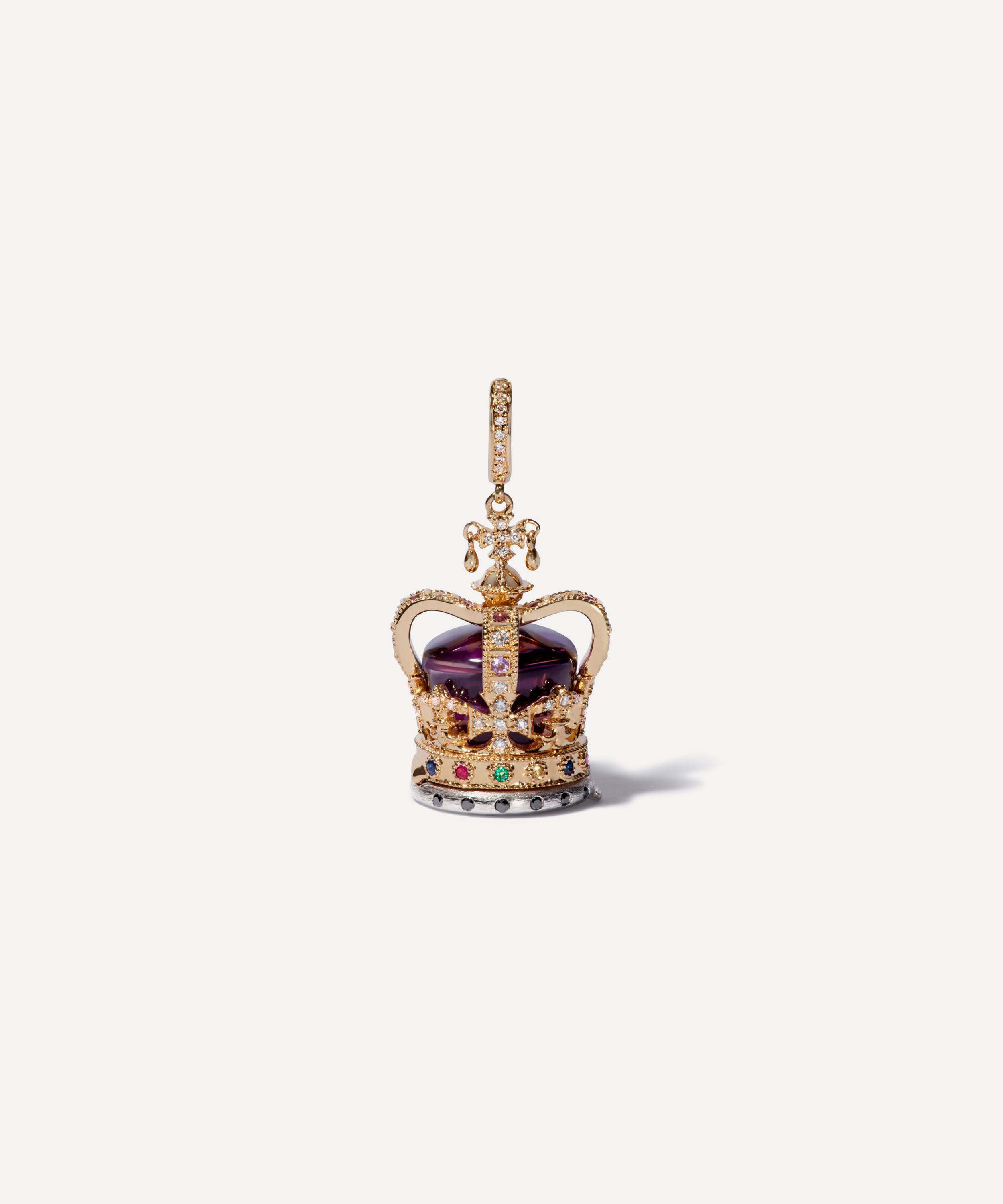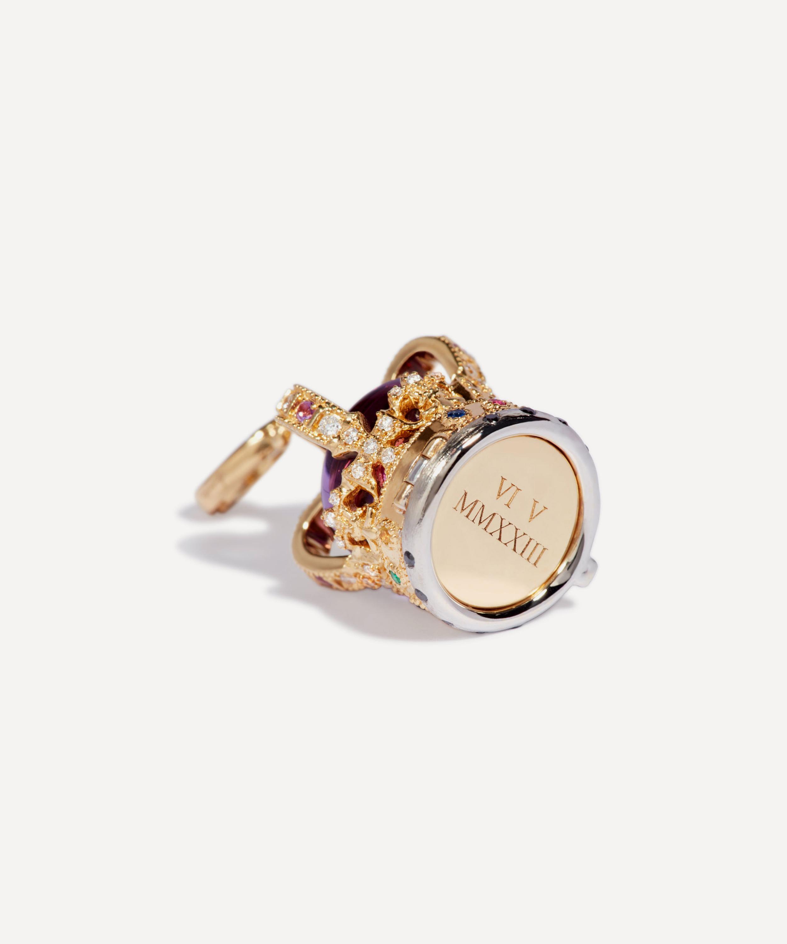 To mark the Coronation of King Charles III, Annoushka has designed this limited-edition commemorative Crown locket charm. Crafted from 18ct gold and white gold, this intricately detailed charm is a miniature representation of the St Edwards Crown – featuring a central carved amethyst surrounded by emeralds, sapphires, rubies, amethysts and diamonds. The ermine fur band is replicated by the textured white gold rim at the base. Complete with a bail clasp fitting, it can be attached to one of the brand’s chain bracelets.
