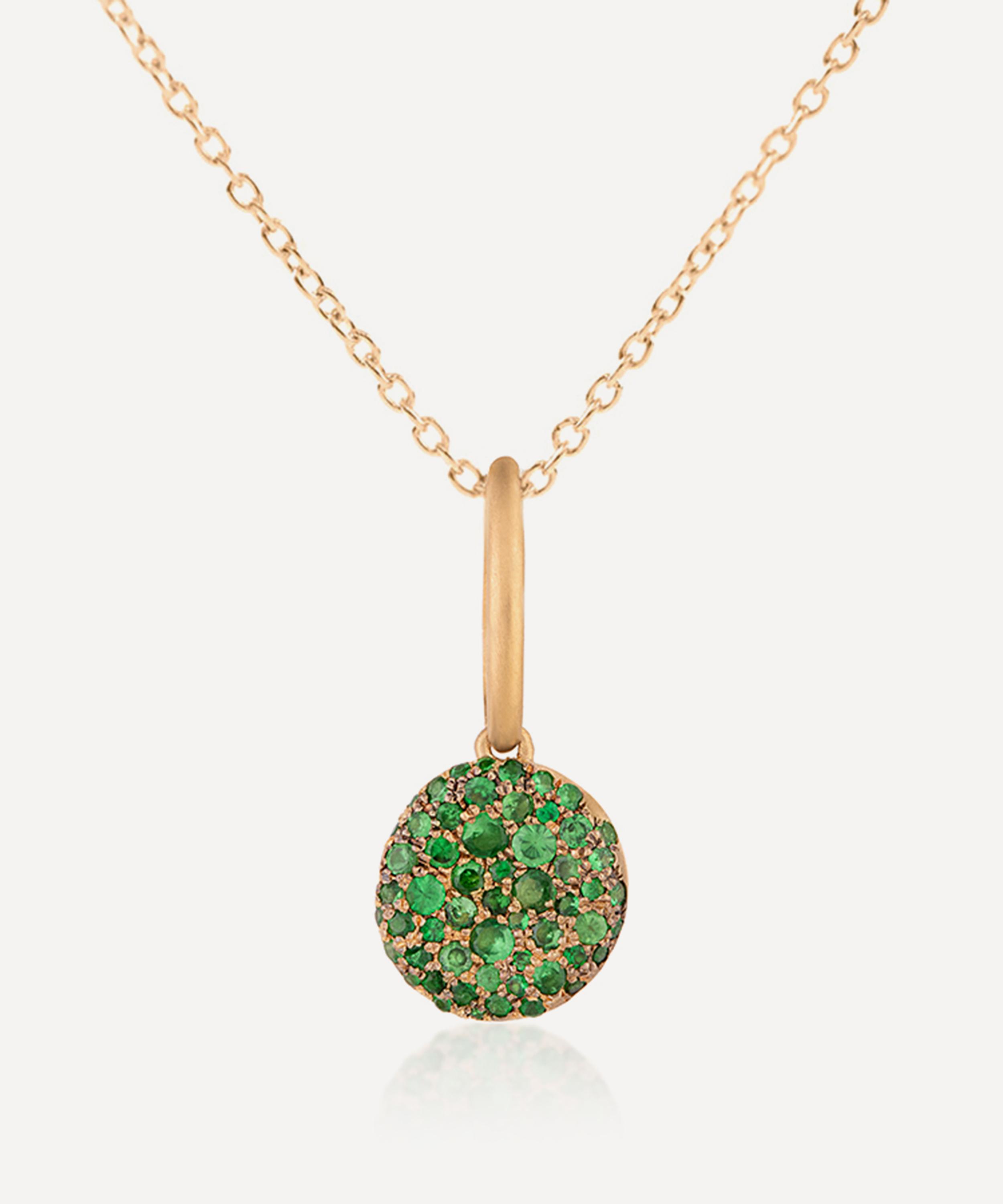 Intricately crafted from solid 18 carat gold, it features a fine link chain and a round pendant adorned with scattered green tsavorite stones in Nada’s signature pave setting. Team it with other bold feminine pieces from the designer to build your own powerful narrative of jewels.