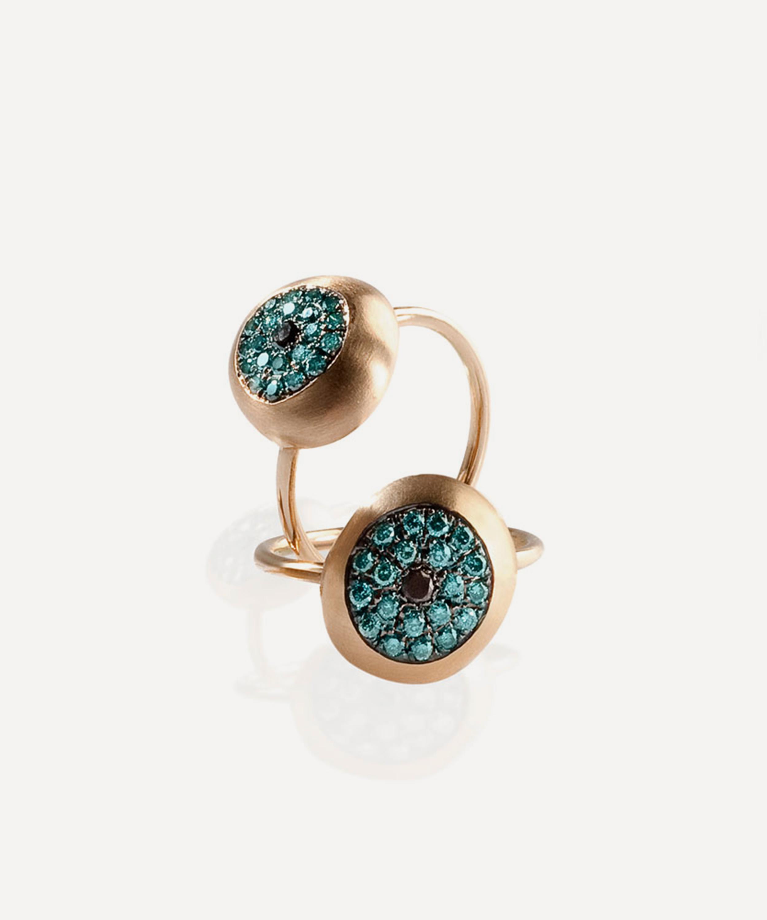 Infusing your look with a bold femininity, Nada Ghazal’s Big Healing Eye Ring will become a staple in your collection. Crafted from solid 18ct gold, it’s characterised by a slim band and a round-shaped feature adorned with black, blue, and champagne diamonds. Together, the stones create a central eye motif – known as a healing eye to give the wearer the strength to grow from within. Team it with other bold feminine pieces from the designer to build your own powerful narrative of jewels.