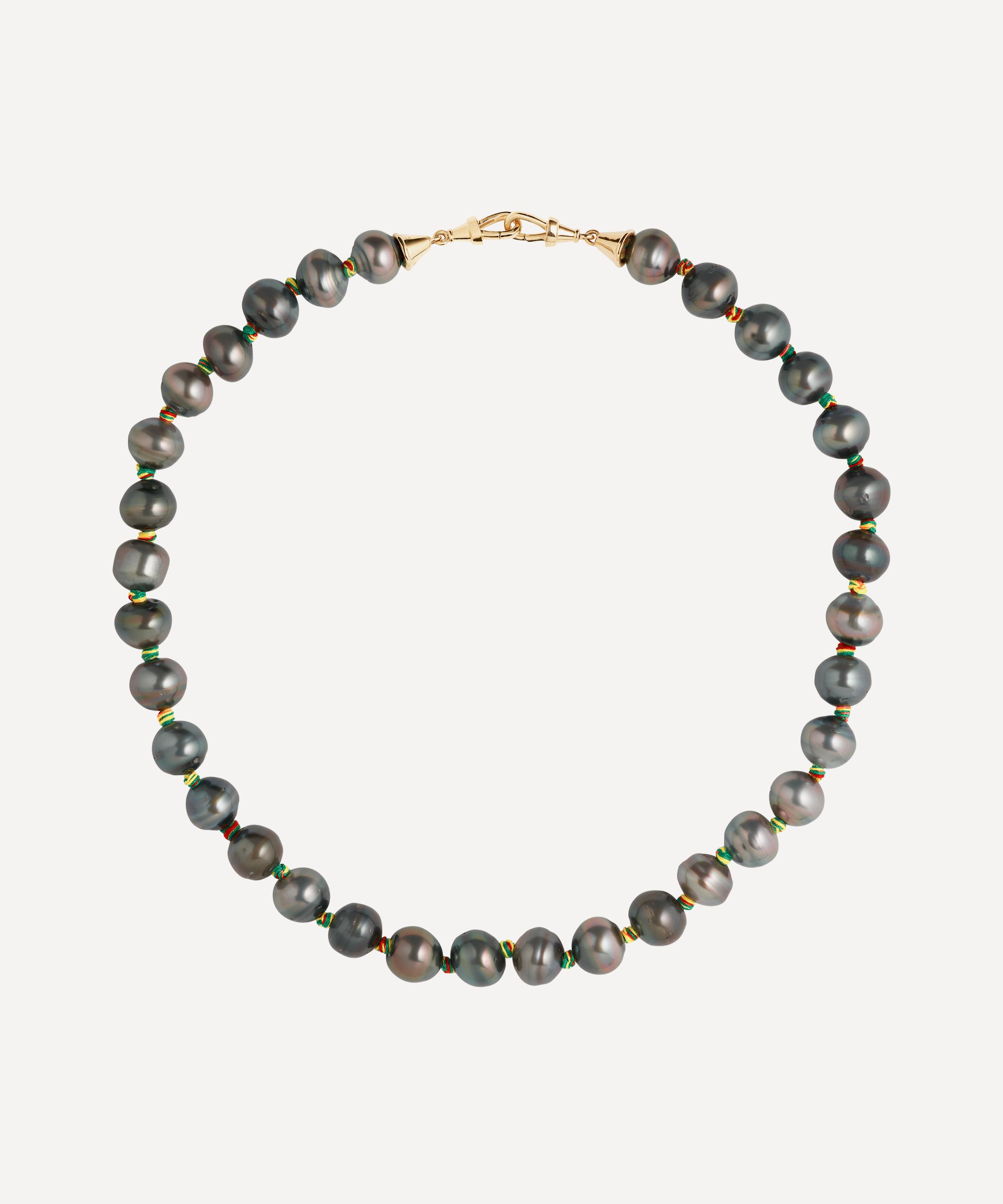 Inspired by 18th century jewellery, this necklace from Marie Lichtenberg evokes centuries of history, tradition, and culture. Crafted from 18ct gold, it features a multi-coloured mauli thread accented with black Keshi pearls. Complete with a handcuff finish at each end to be embellished with a pendant of your choice, it makes for the perfect stand-out piece in your jewellery line-up.