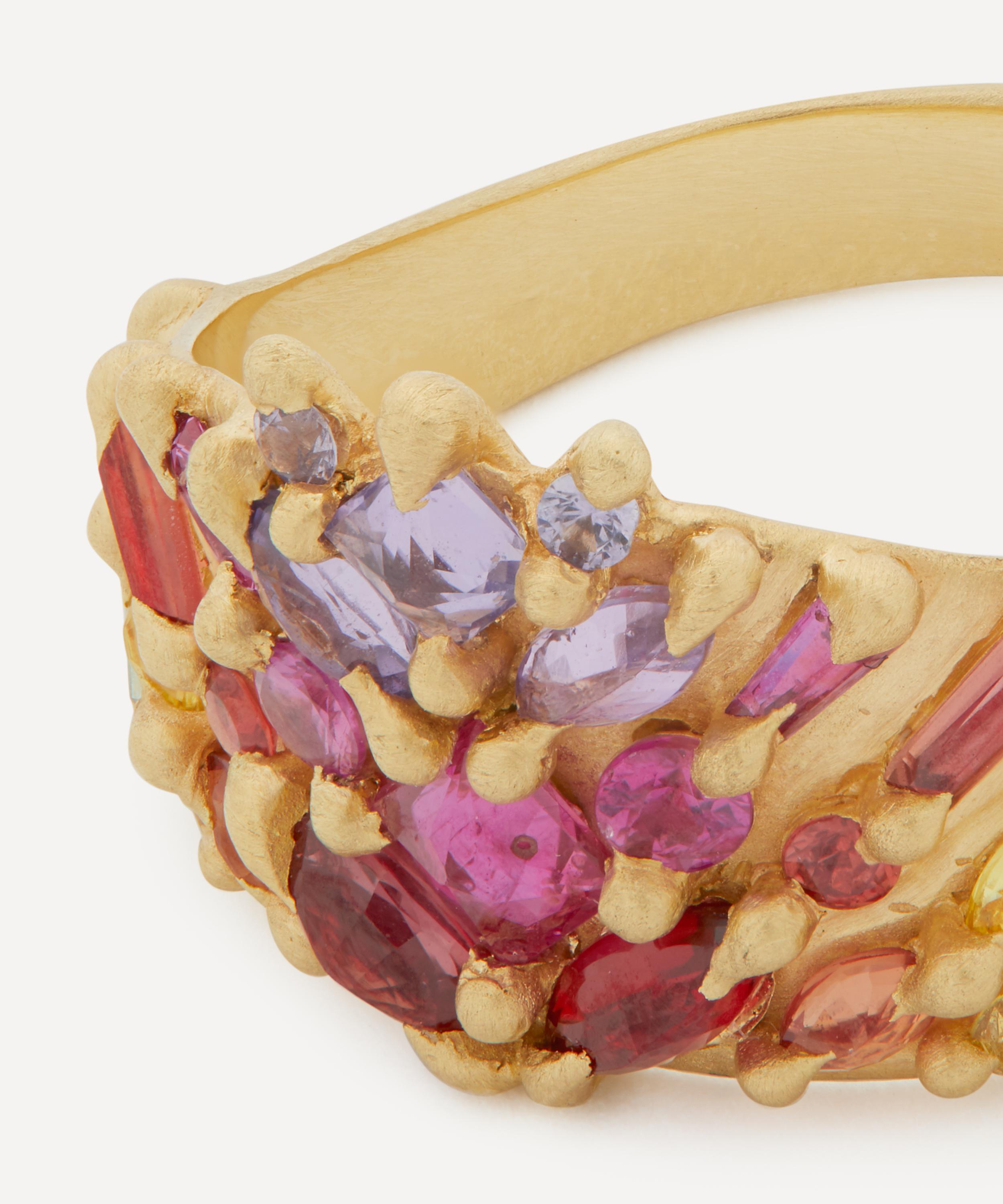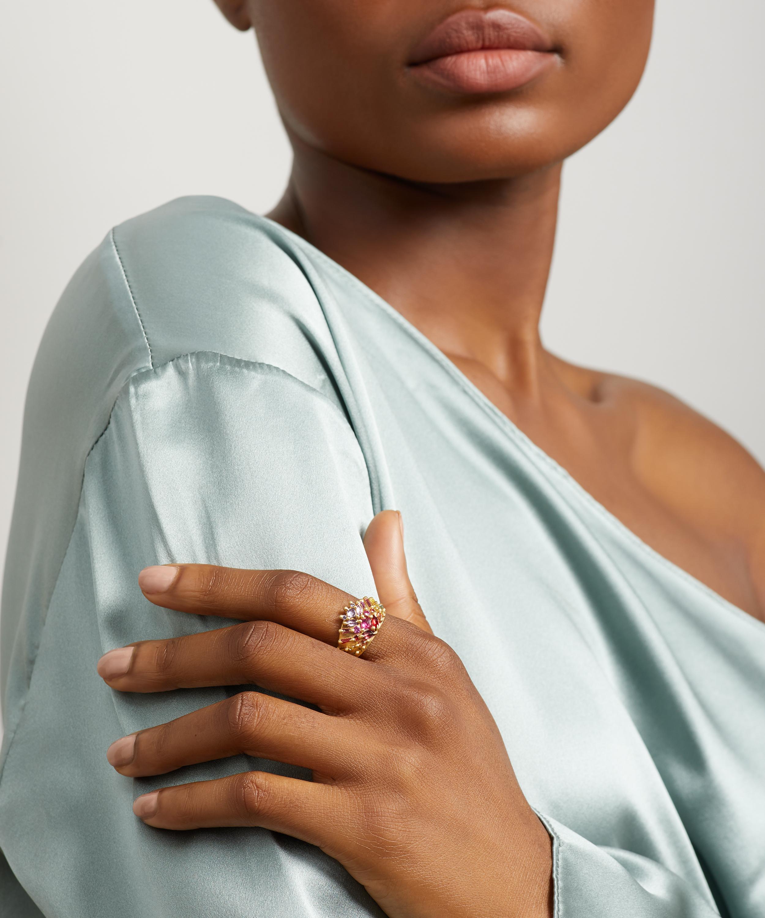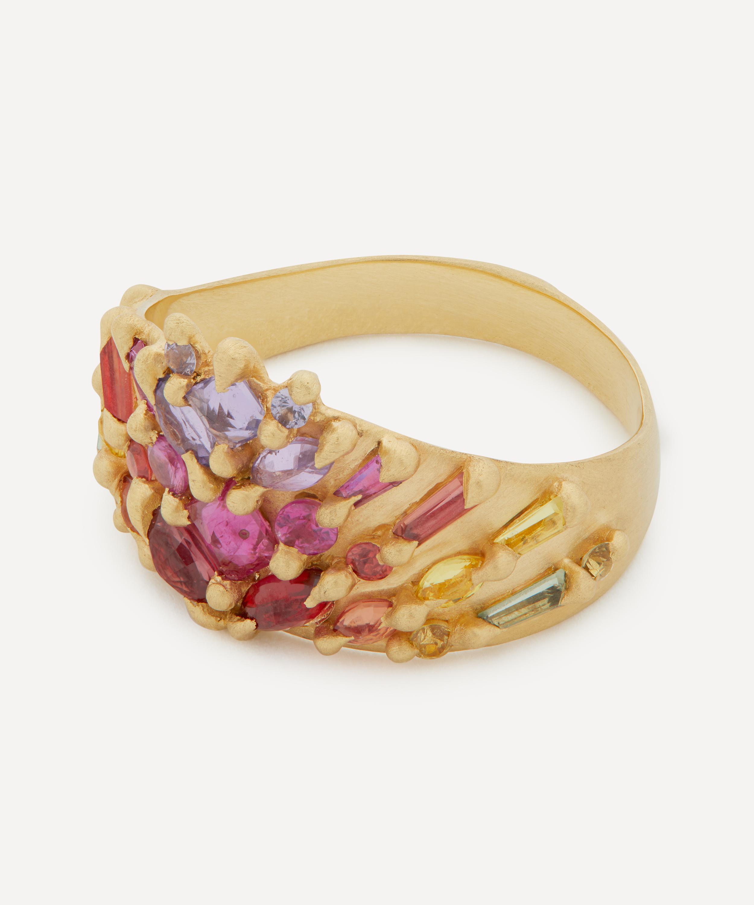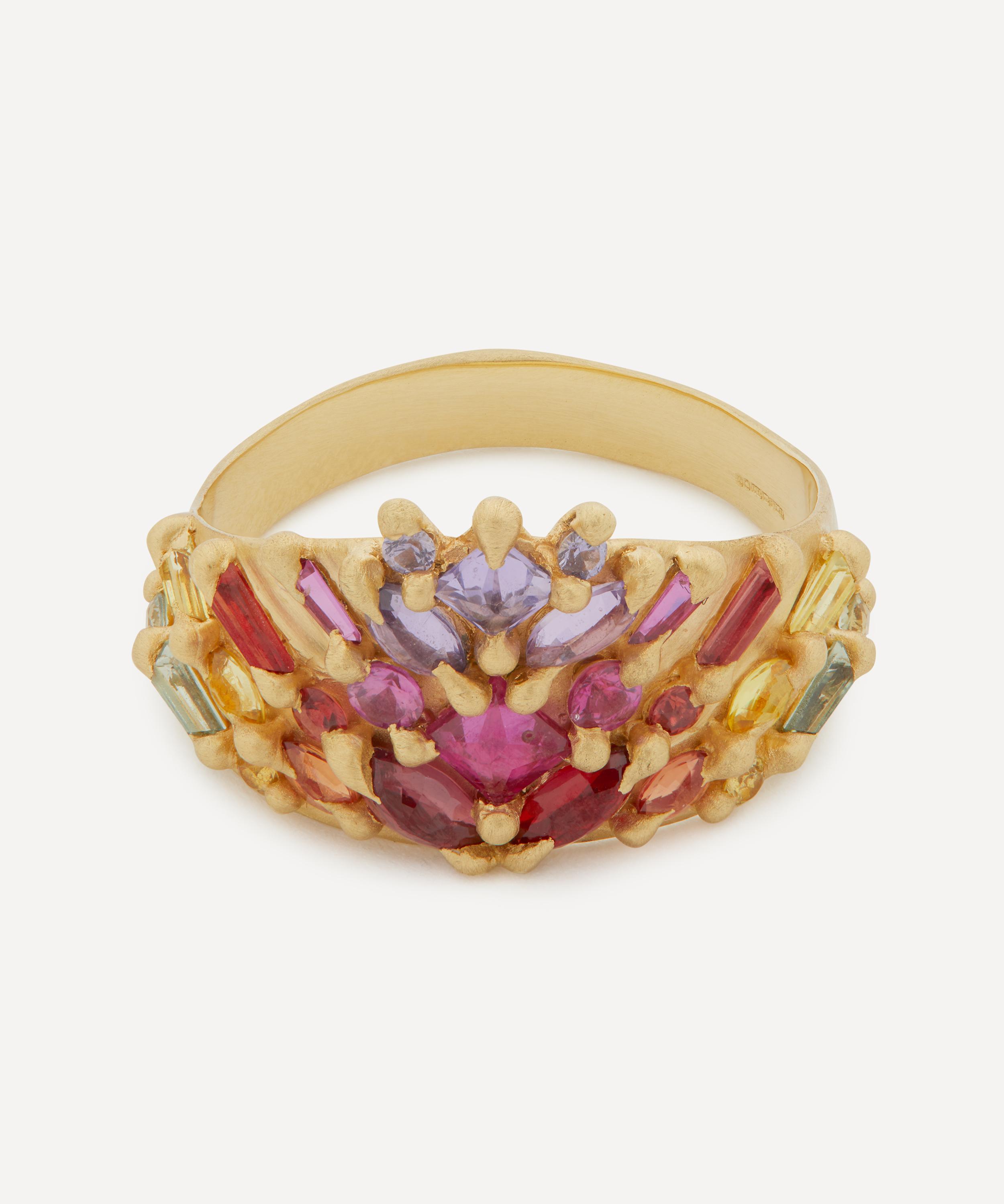 Epitomising the British designer's tough-luxe aesthetic, this one-of-a-kind Shield ring by Polly Wales is bursting with glittering sapphires. Crafted from 18ct gold, it features a wide band with a beautiful array of baguette-cut white diamonds and mixed-cut sapphires in blue, green, and purple, cast-not-set into a flared half shield. Try stacking several contrasting rings together for a kaleidoscopic evening curation.