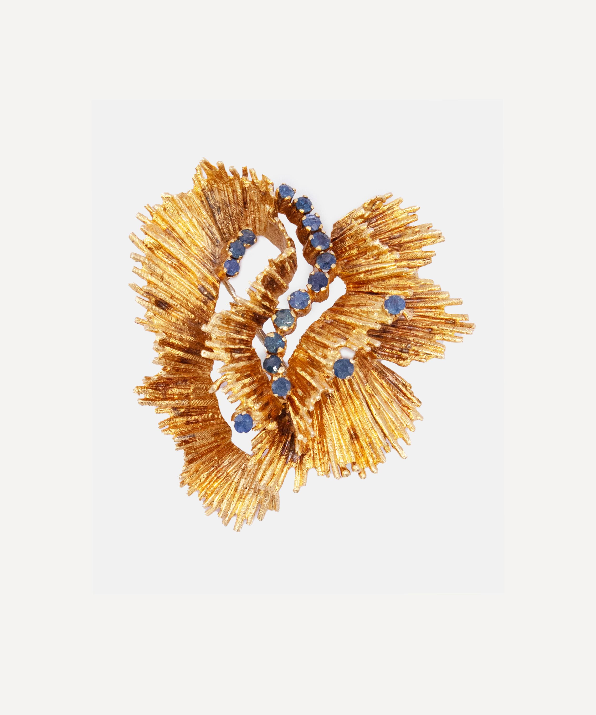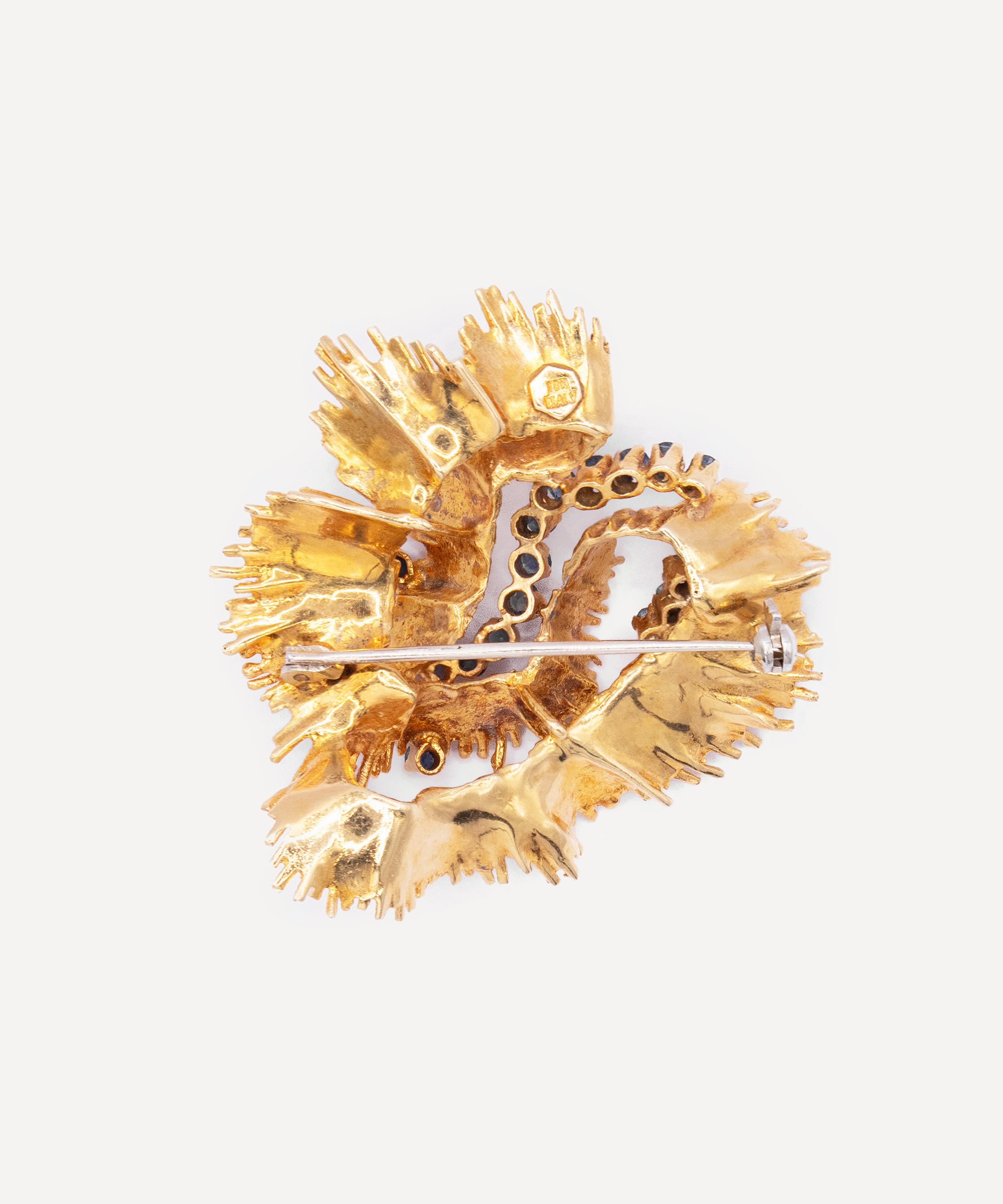 Brimming with character, this vintage brooch boasts a standout piece from antique purveyor Kojis. Crafted from 18ct gold, it features a naturalistic, spray with open work detailing and multiple round-cut sapphires claw set in waves that follow the curves of the brooch. The brooch makes a bold statement, an original brutalist piece. Wear it on the lapels of your favourite blazer or blouse and try teaming it with several other artisanal brooches and pins for a maximalist take on traditional formalwear.