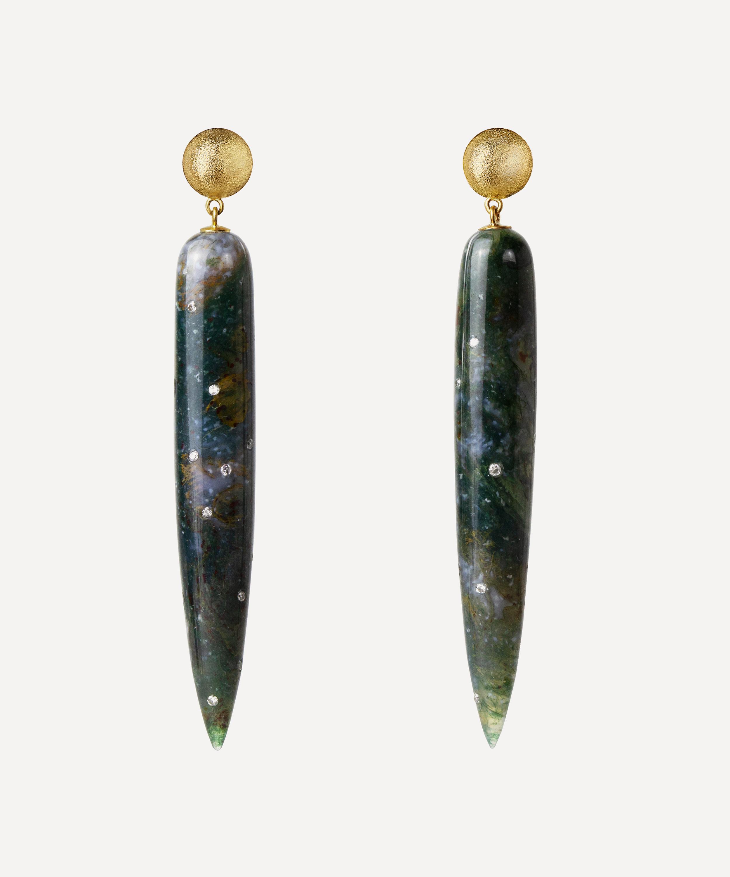 Transform your look with Jacqueline Cullen’s bold and seductive drop earrings. Inspired by the dramatic forces of nature, each earring features a tapered drop composed of a Moss agate stone, adorned with tiny, grey diamonds. Complete with frosted 18ct gold tops, style these beautiful earrings solo, or pair them with small hoops and studs for a layered effect.