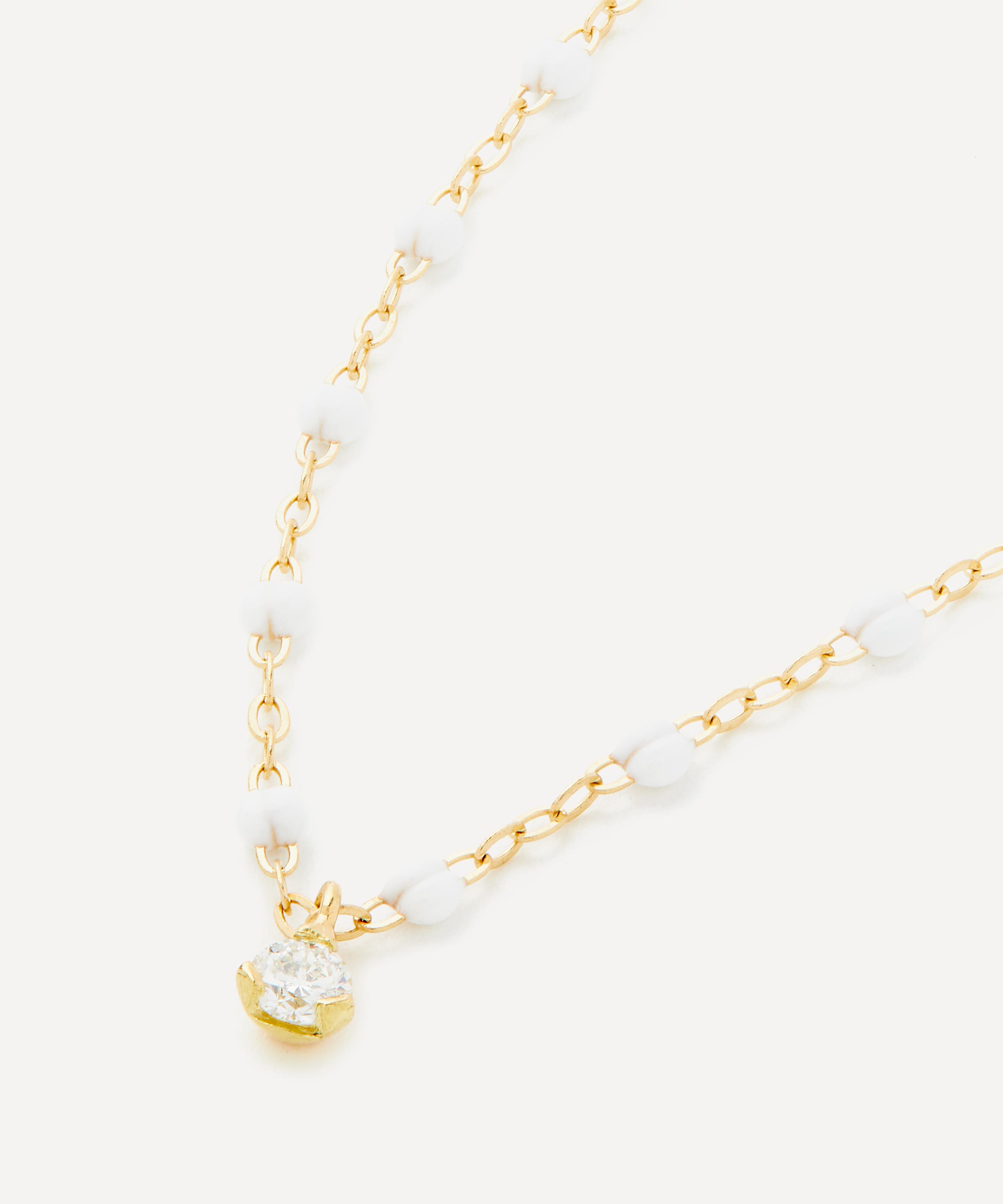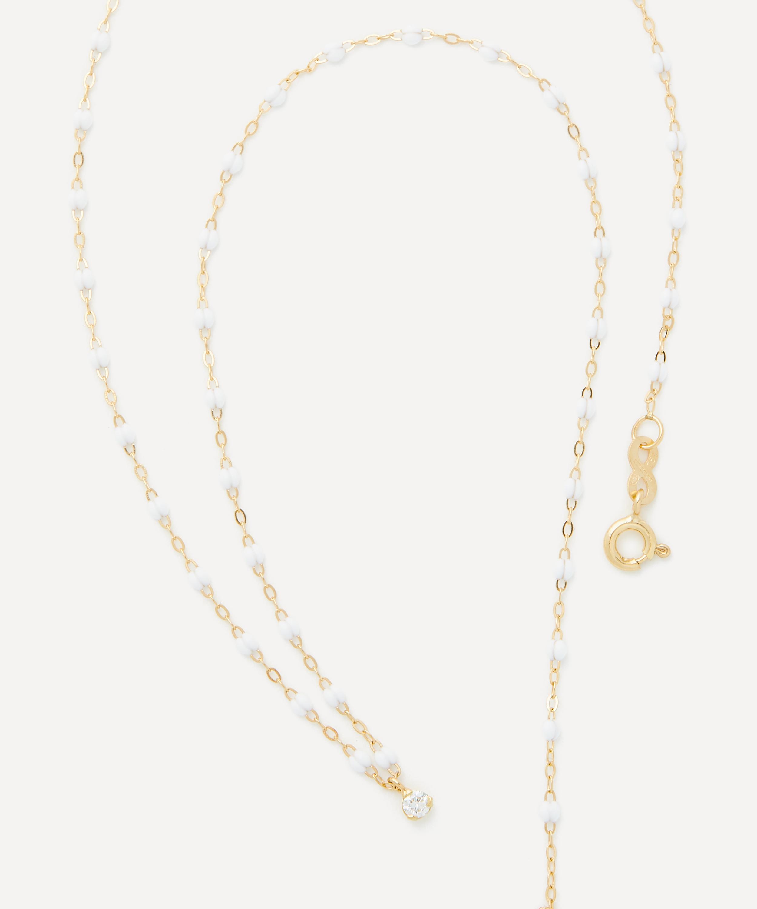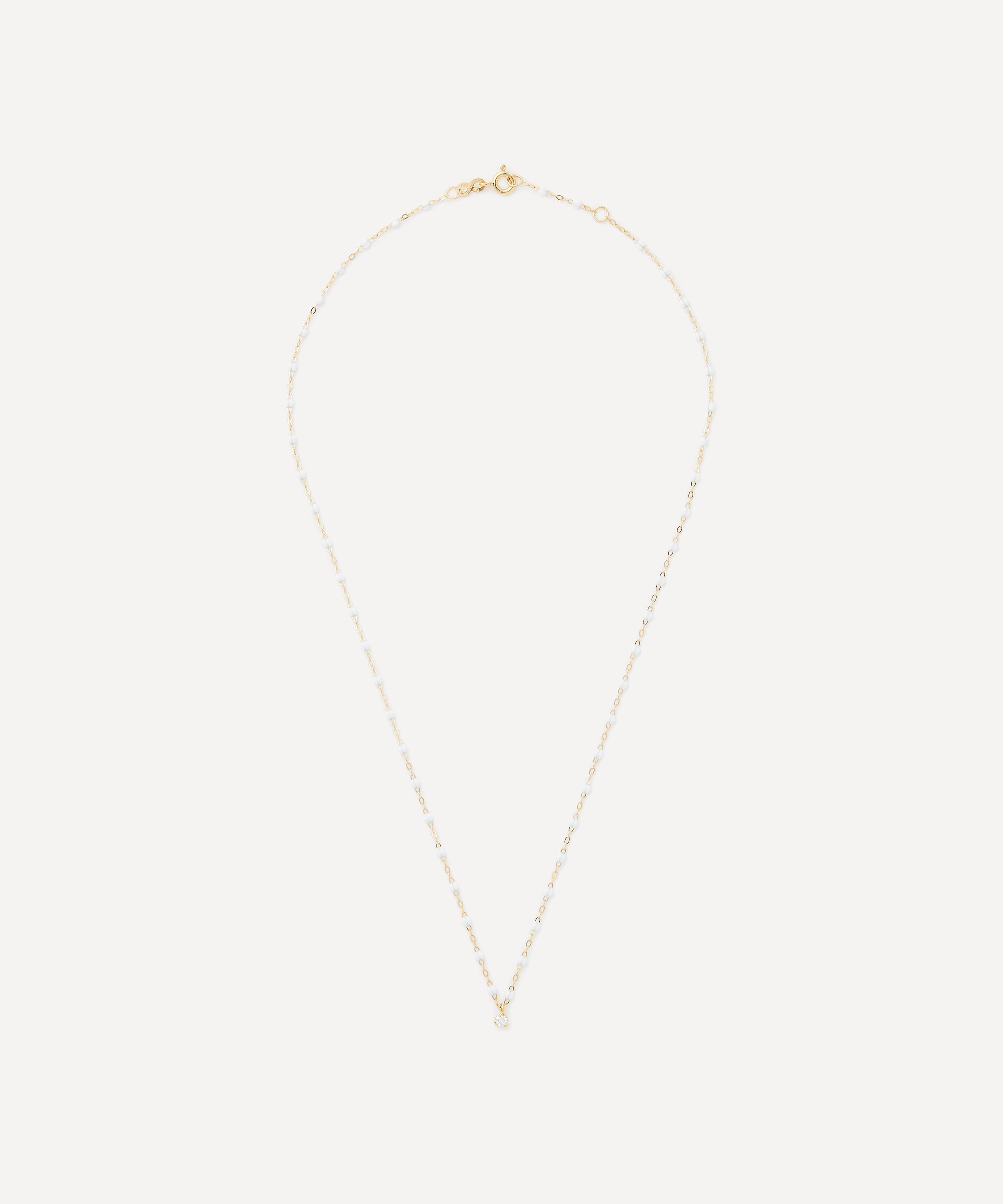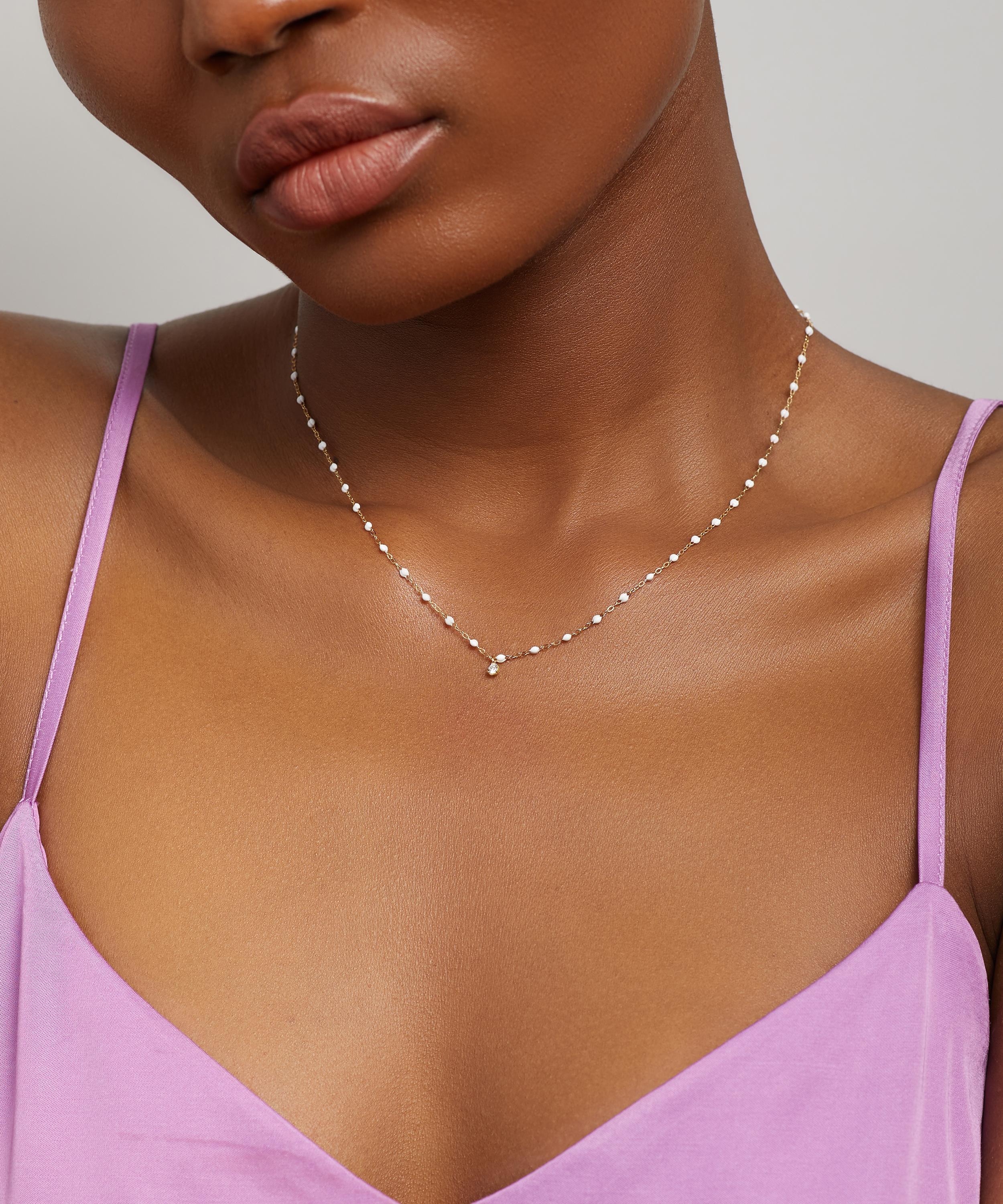 Exemplifying the brand’s signature style, this necklace is made from 18ct gold featuring a classic link chain adorned with white resin beads and a lustrous diamond drop at the centre. Designed to be layered, wear this piece with additional necklaces from the brand for a vibrant curation of colours.