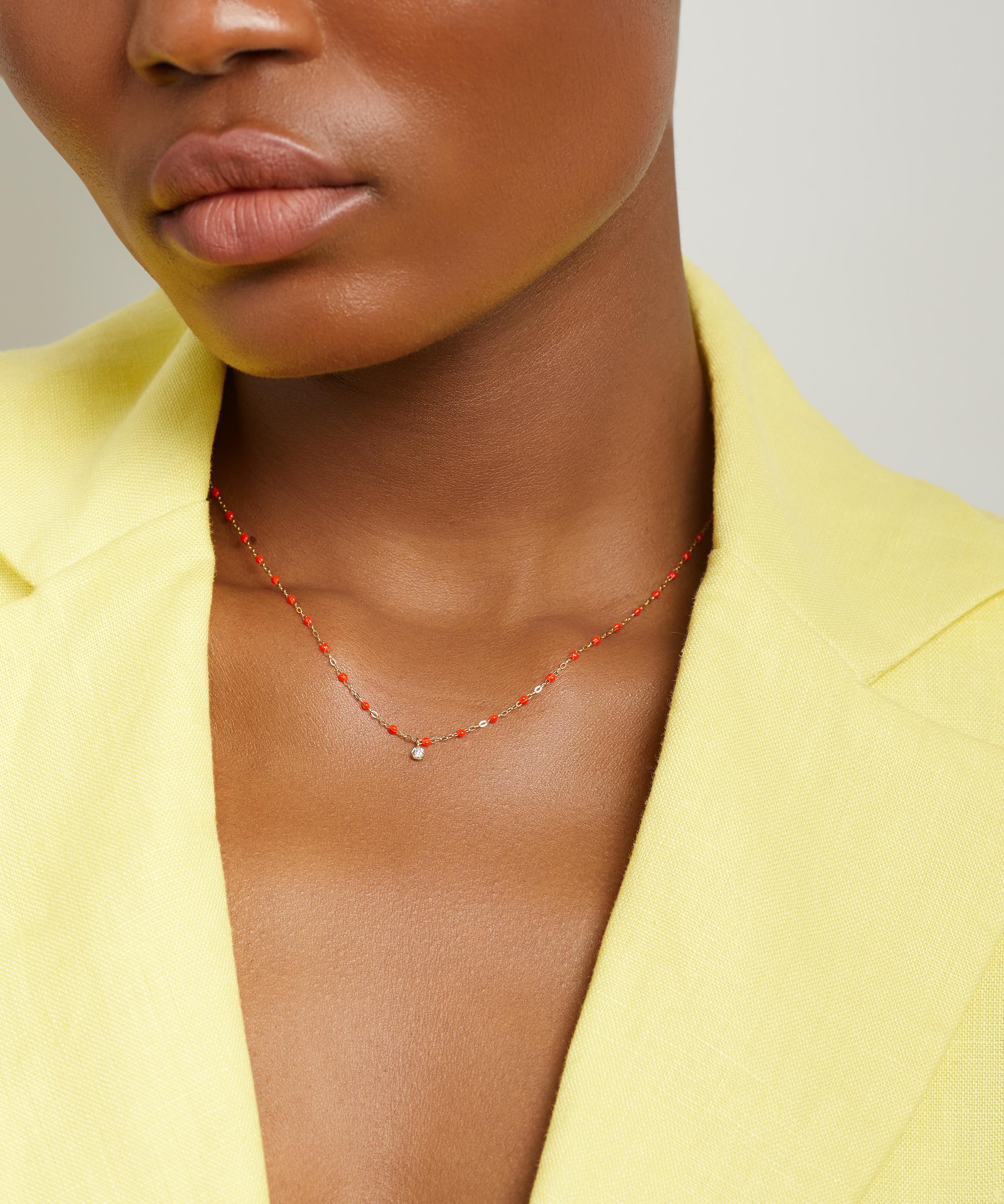 Exemplifying the brand’s signature style, this necklace is made from 18ct gold featuring a classic link chain adorned with coral red resin beads and a lustrous diamond drop at the centre. Designed to be layered, wear this piece with additional necklaces from the brand for a vibrant curation of colours.
