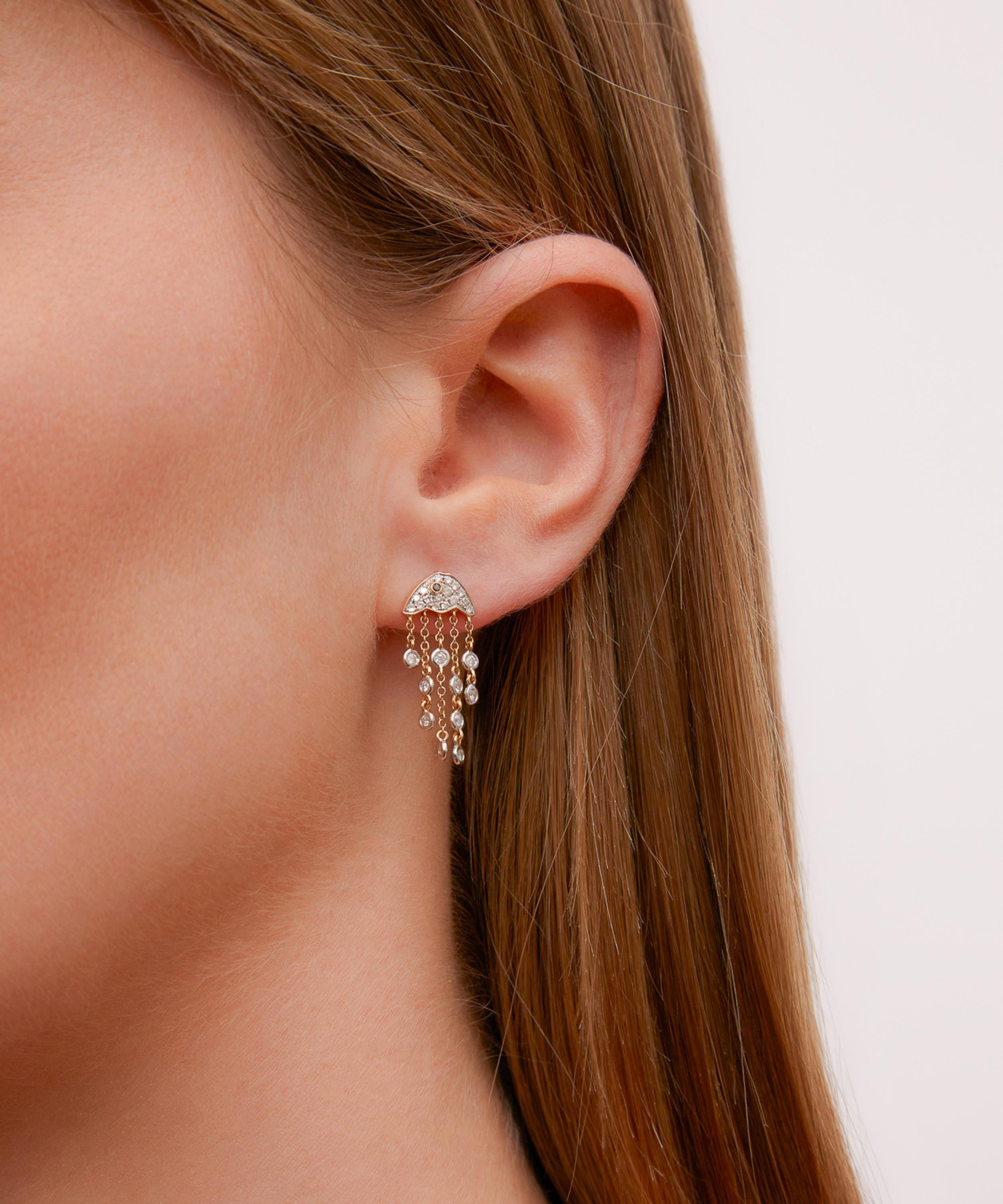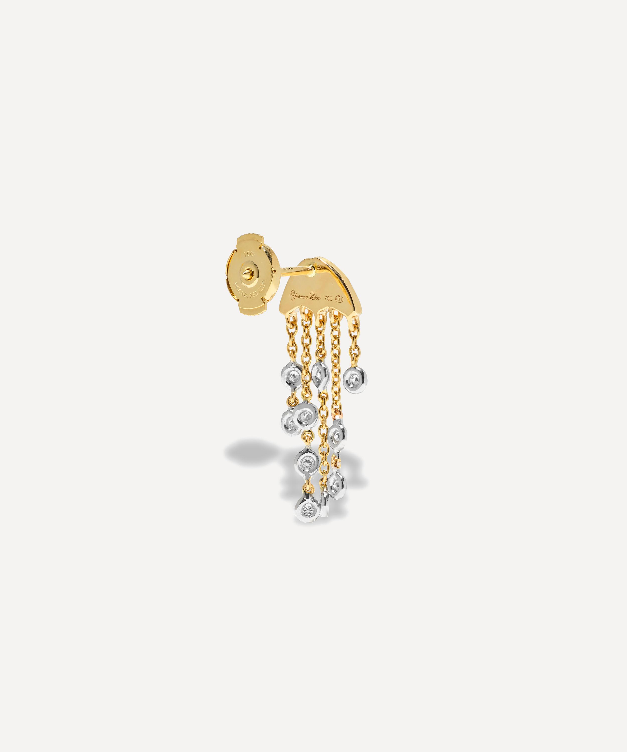 Delve into a world of vintage classics and tie your whole look together with this drop earring from Yvonne Léon. Crafted from 18ct gold, this single earring features a diamond jellyfish design adorned with a tiny black diamond and chain links with grey diamond drops. Style it as part of a curated stack, or get two for a matching pair.