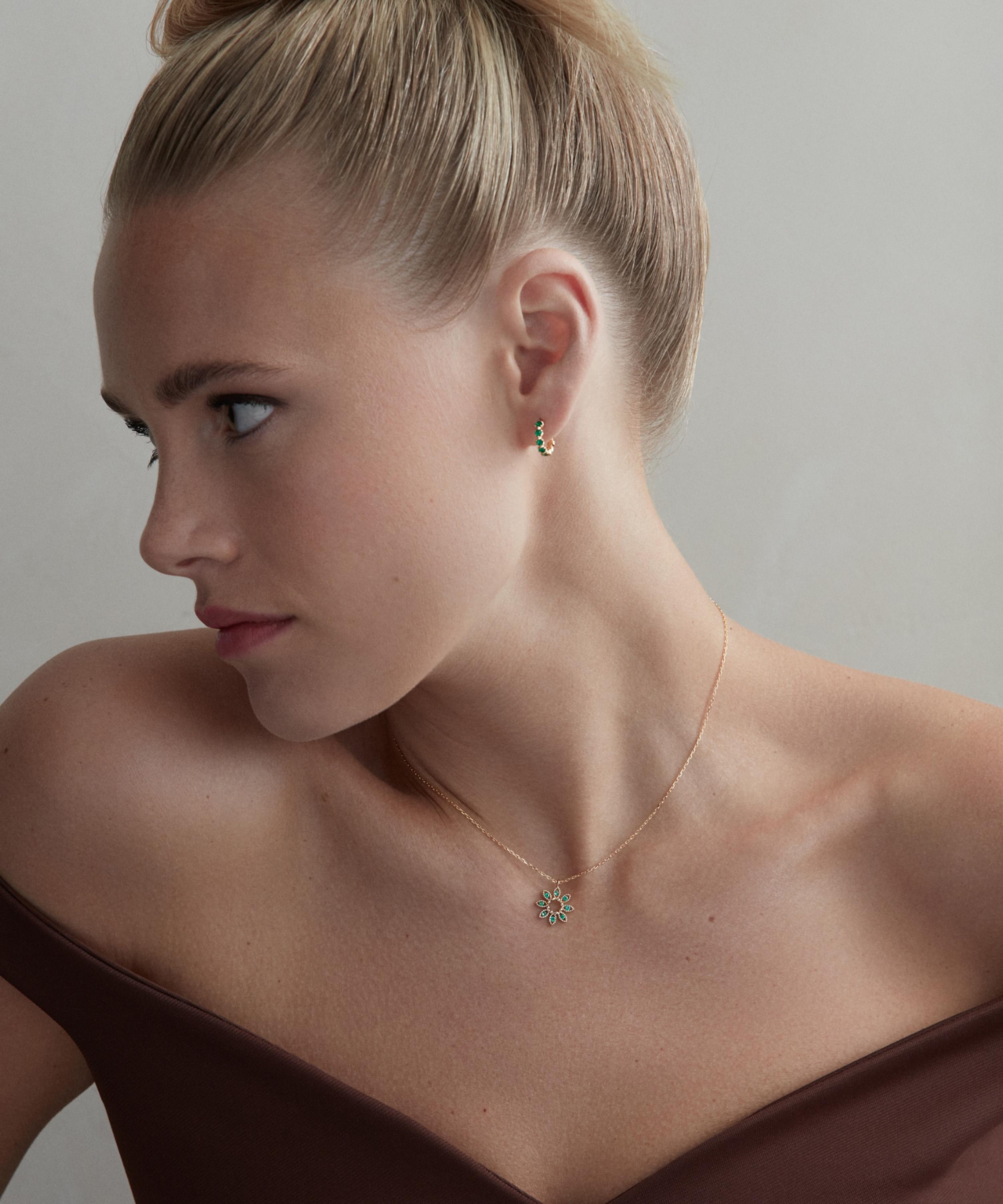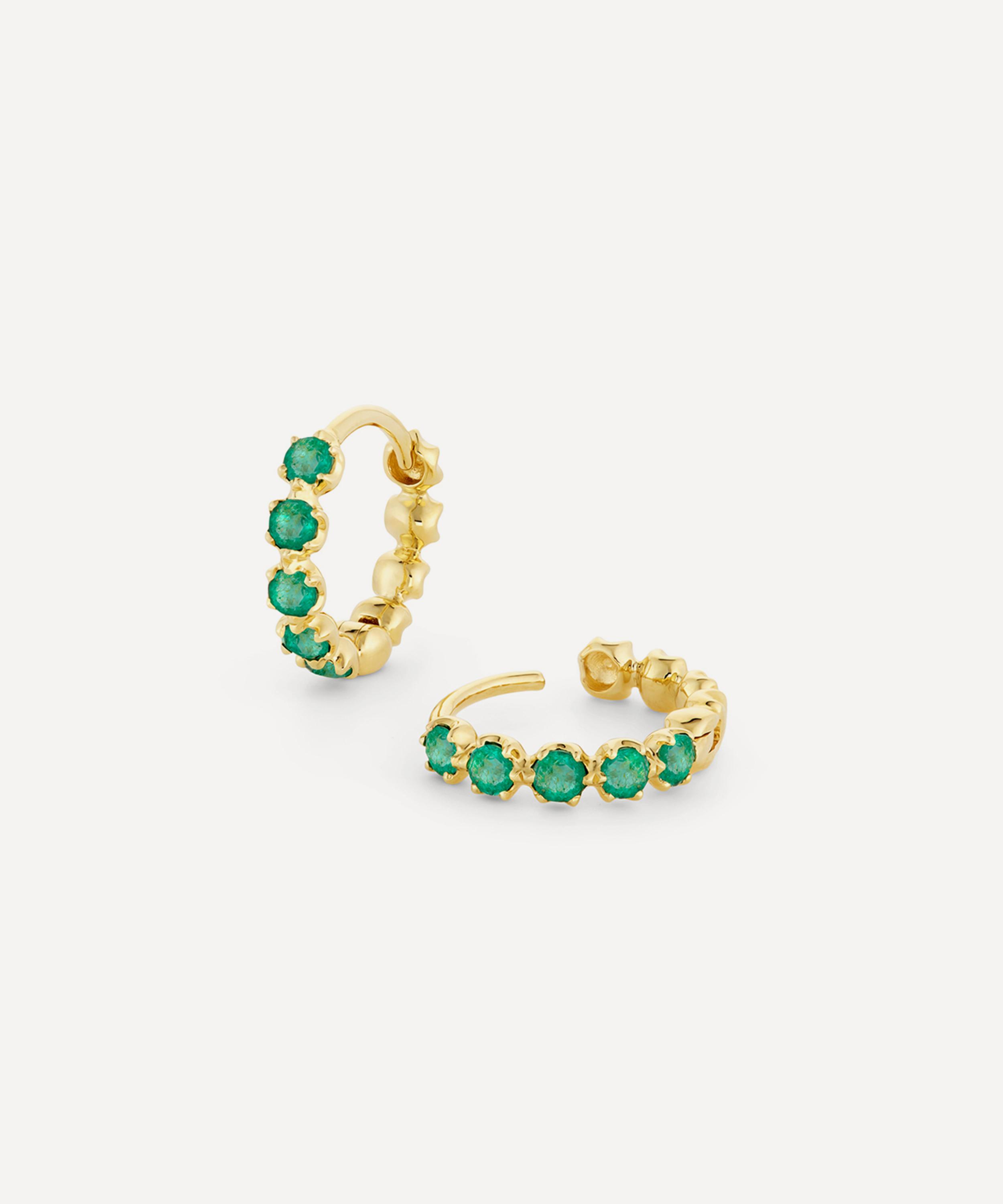 Look effortlessly striking and accelerate the impact of your outfit with the elevating Elyhara huggie hoop earrings from Dinny Hall. Handcrafted from 18ct gold, each hoop is decorated with round brilliant cut emeralds, fitted into half orb settings. Offering a modern twist on early Georgian gem-set jewellery, they style beautifully on their own or stacked with other earrings as part of a brightly-coloured curation.