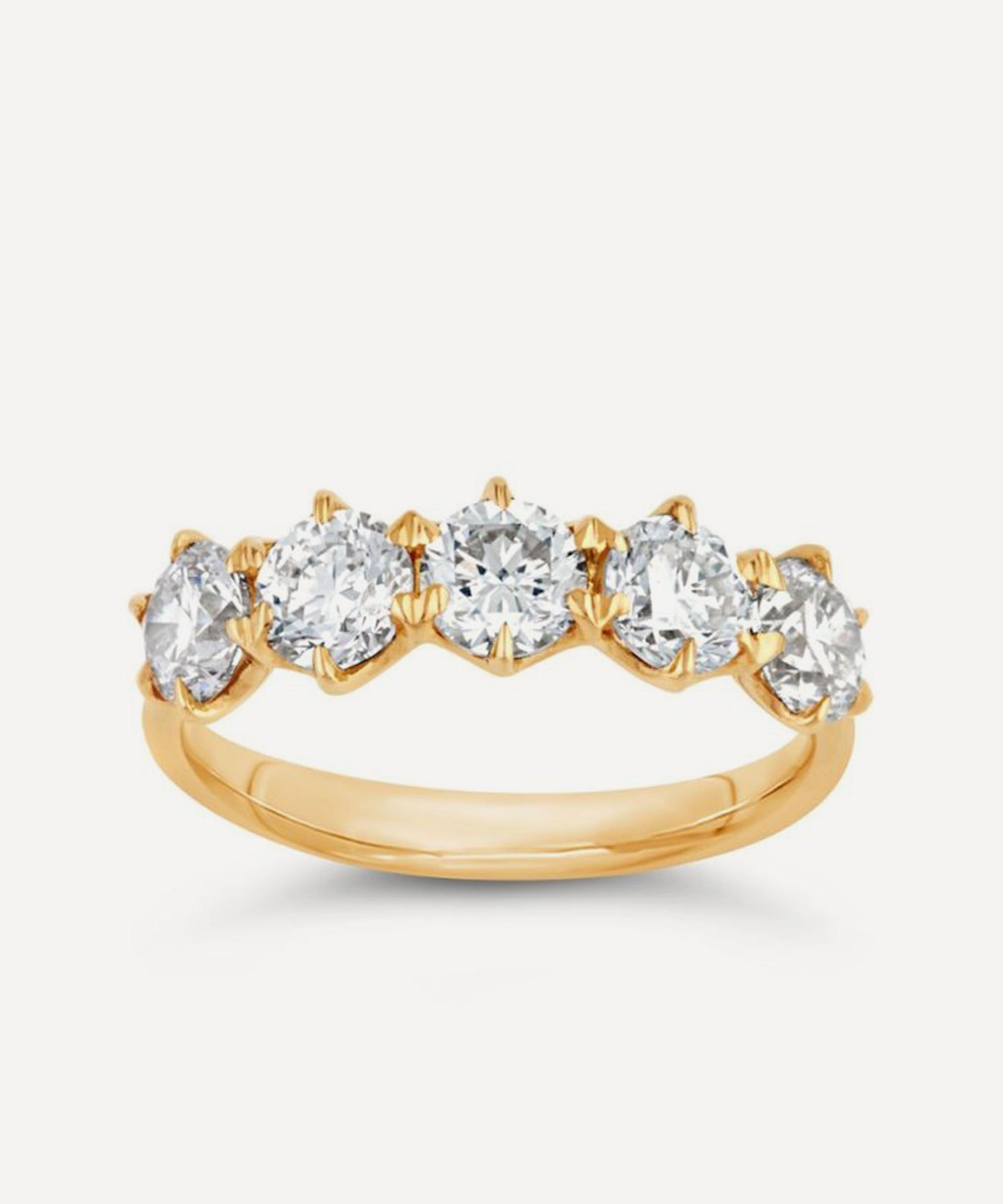 Look effortlessly striking and accelerate the impact of your outfit with the elevating Elyhara Five Stone diamond ring from Dinny Hall. Handcrafted from 18ct gold, it’s fashioned into a slim band adorned with five brilliant cut diamonds. Offering a modern twist on early Georgian gem-set jewellery, it styles beautifully on its own or stacked with other rings.