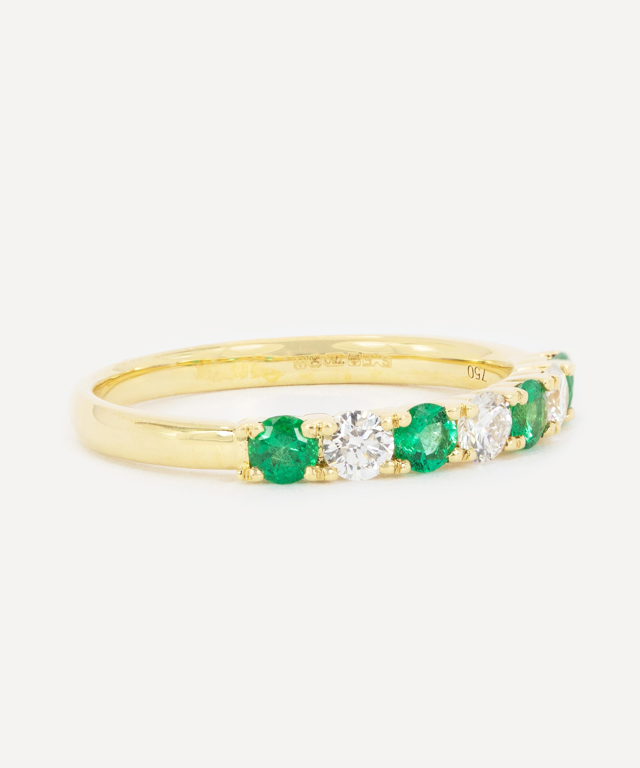 Boasting expert craftmanship, this half eternity ring is another one-of-a-kind piece from Kojis. Crafted from 18ct gold, it’s characterised by a plain, polished band adorned with four round cut emeralds and three round brilliant cut diamonds.