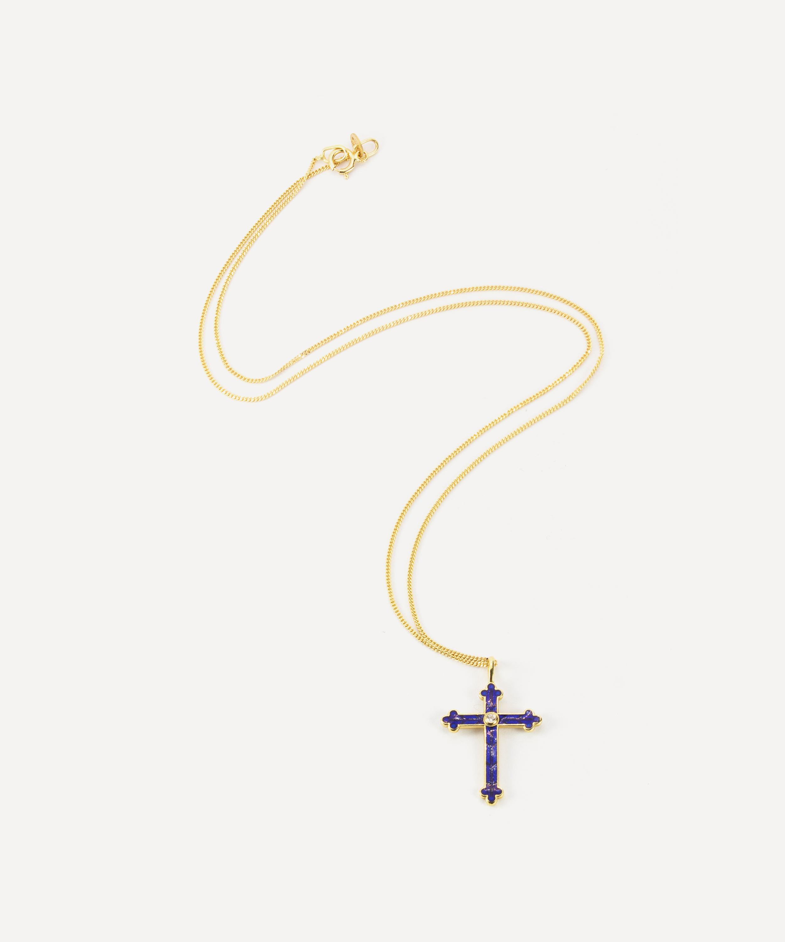 Suspended from an 18-carat gold curb link chain, this necklace features a dark blue enamel budded cross, set with a single diamond in the centre. Offering a modern alternative to the brand's signature elaborate antiques, style it with pulled-back hair and an array of single gemstone studs for an understated evening look.
