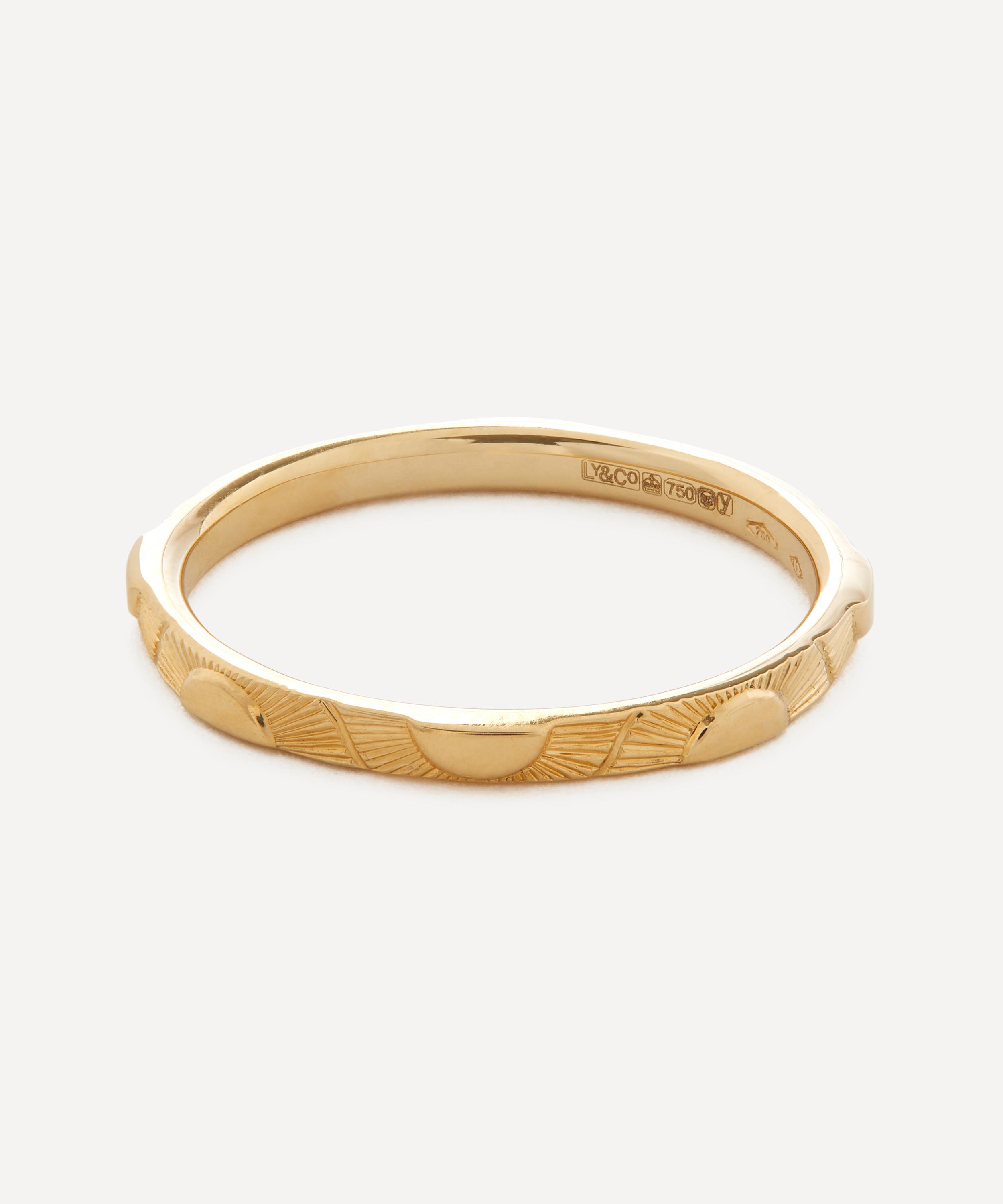 The engraved Sun Pattern wedding band ring from fine jewellery brand Artemer exemplifies the designer’s expert eye for divine compositions. A symbol of love and dedication, this ring is crafted from solid 18ct gold, featuring a slim band adorned with a hand engraved sun pattern. Style it solo, stack it with an engagement ring or team it with other gem encrusted rings for a beautiful curation that’s out of this world.