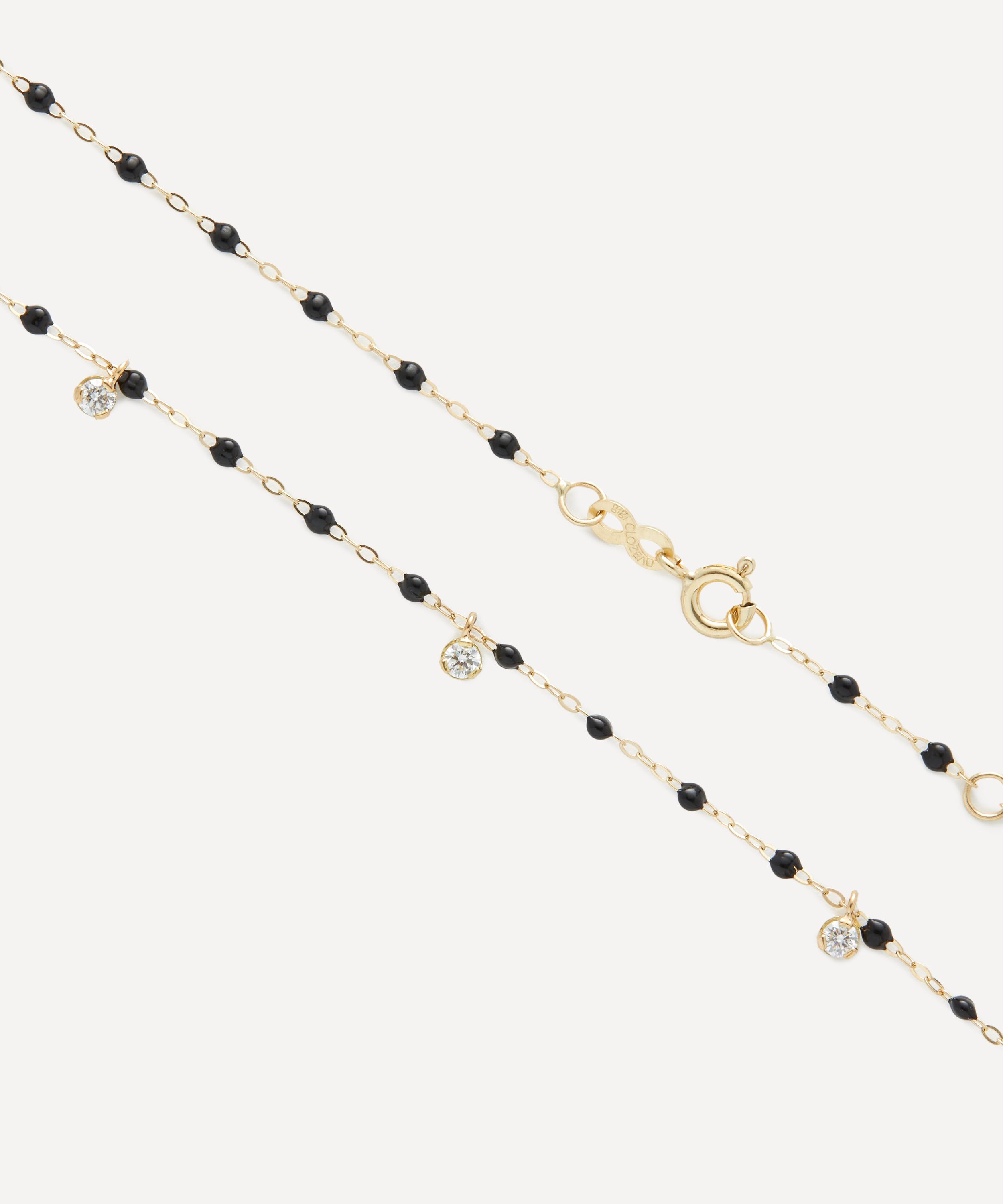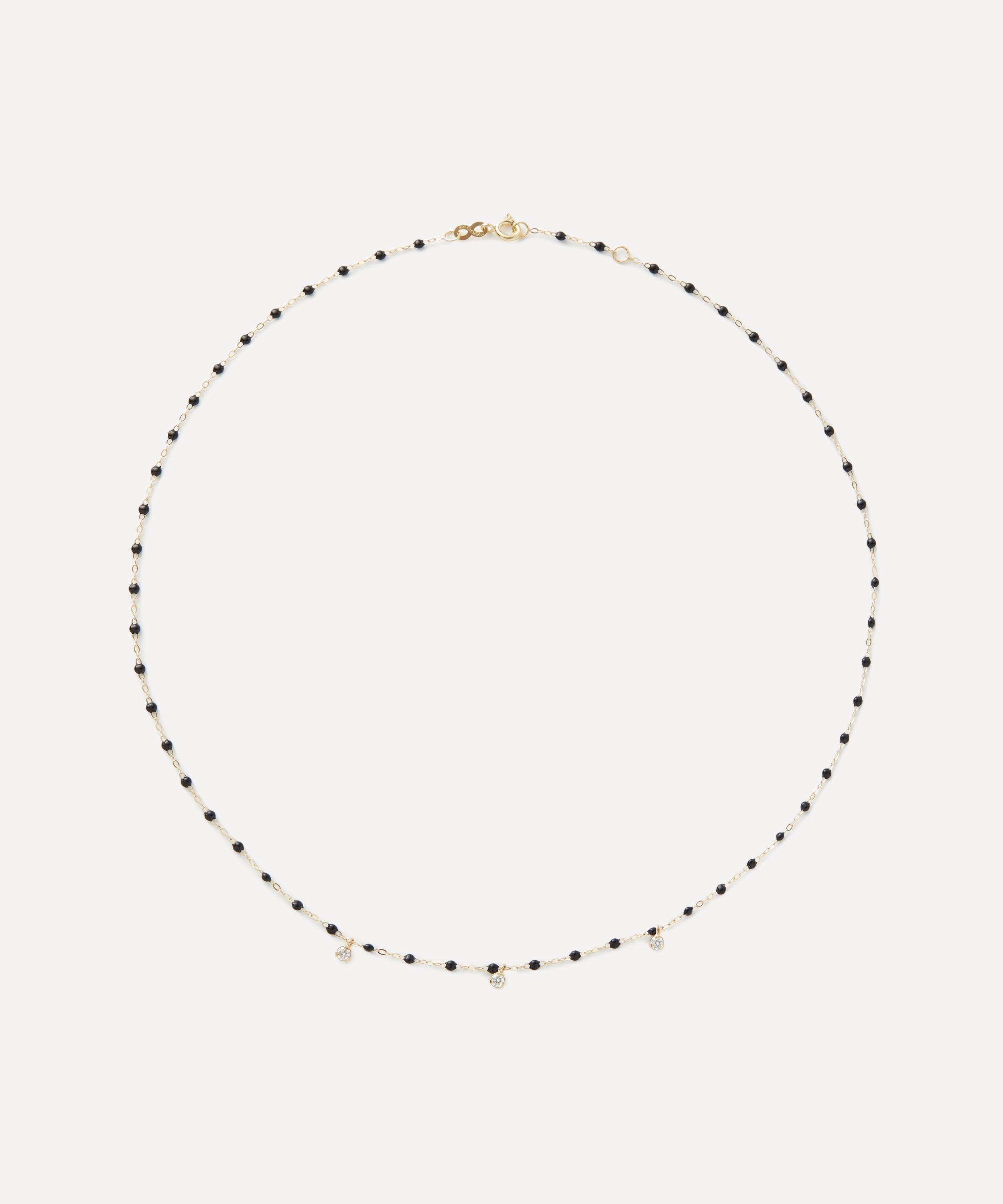 Crafted from 18ct gold, it features a classic link chain adorned with black resin beads and three floating diamonds. Available in a range of different shades, try layering multiple necklace together for a striking stack.