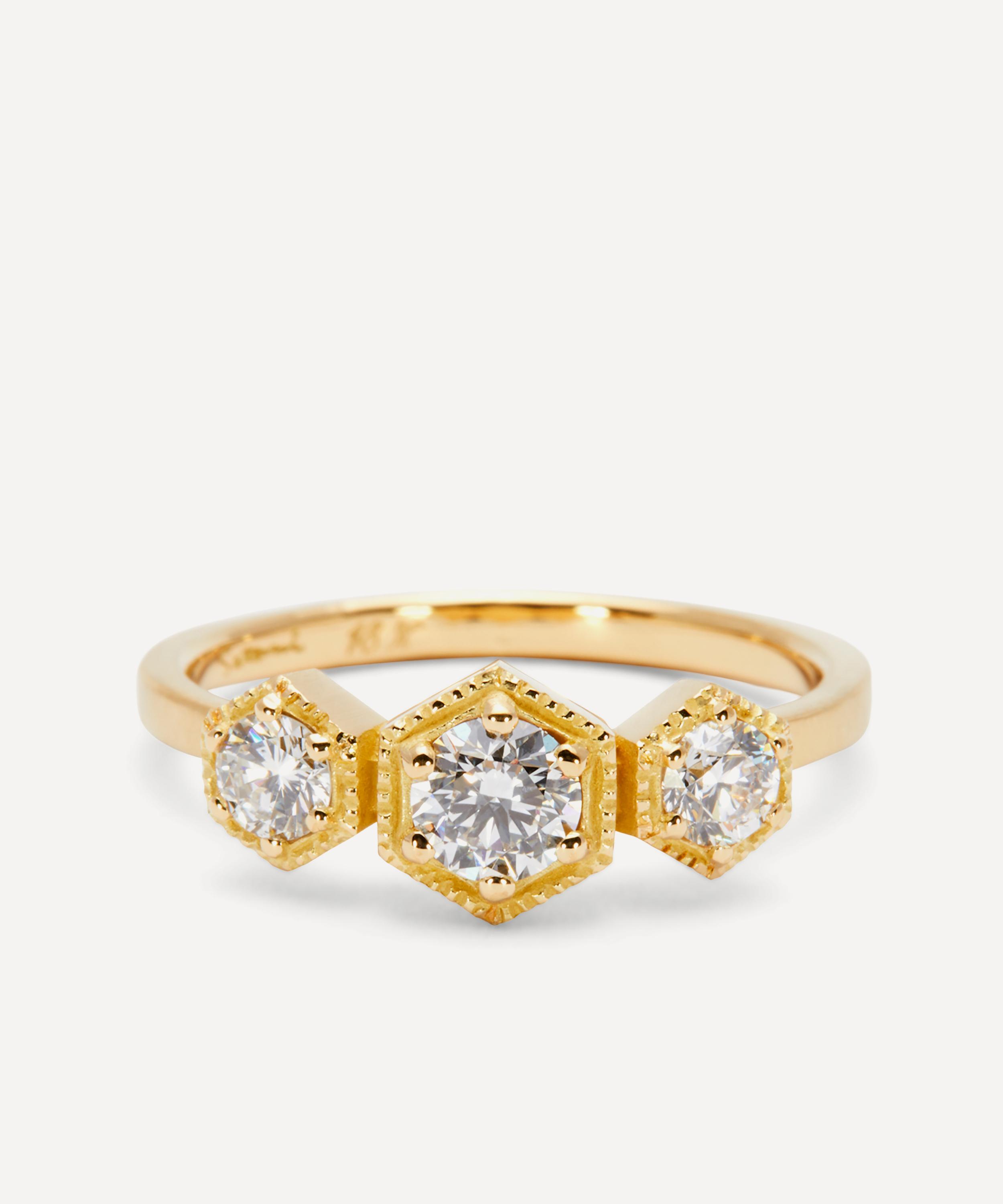 Update your own jewellery collection or express your love and affection towards someone special with this elegant diamond ring from Satomi Kawakita. Inspired by antique jewellery, it features a three-stone configuration composed of brilliant cut diamonds in hexagon cut settings atop a polished band in 18ct gold. Perfect for gifting or to commemorate a milestone, it can be styled solo or worn as part of a stack.