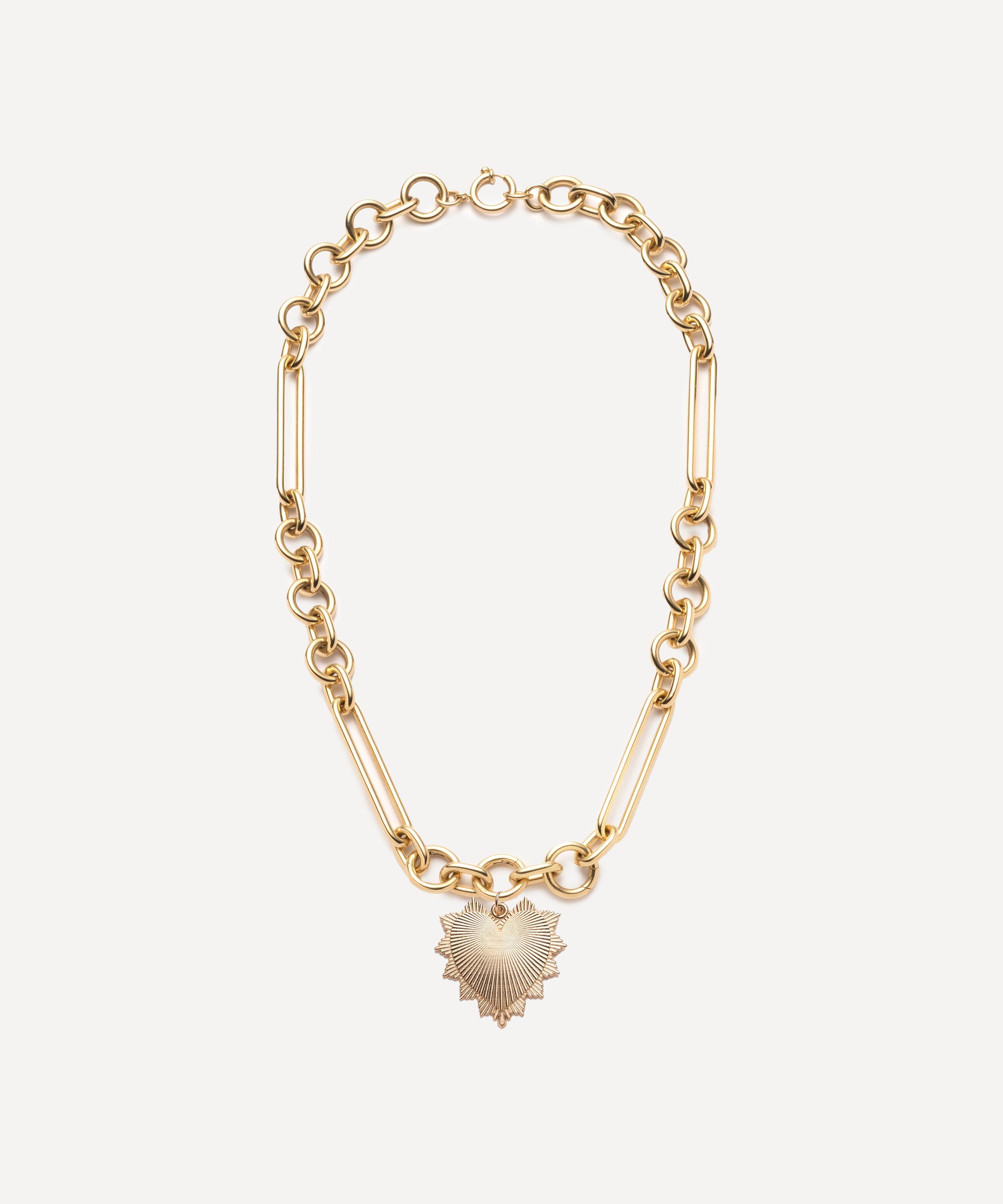 Handcrafted from 18ct gold, it’s fashioned into a mixed chain of alternating round and elongated links, elevated by a decorative heart pendant. The pendant is artfully embellished with sunburst detailing and a sparkling, star set diamond that celebrates the seven types of love defined by the ancient Greeks: Eros (romantic love), Philia (friendship), Agape (universal love), Storge (love between parent and child), Ludus (playful love), Pragma (love founded on duty & reason), and Philautia (self-love). Designed to inspire a journey of self-discovery and expression, this modern heirloom can be worn as it is, layered with other necklaces, or simply as a plain chain without its medallion pendant.