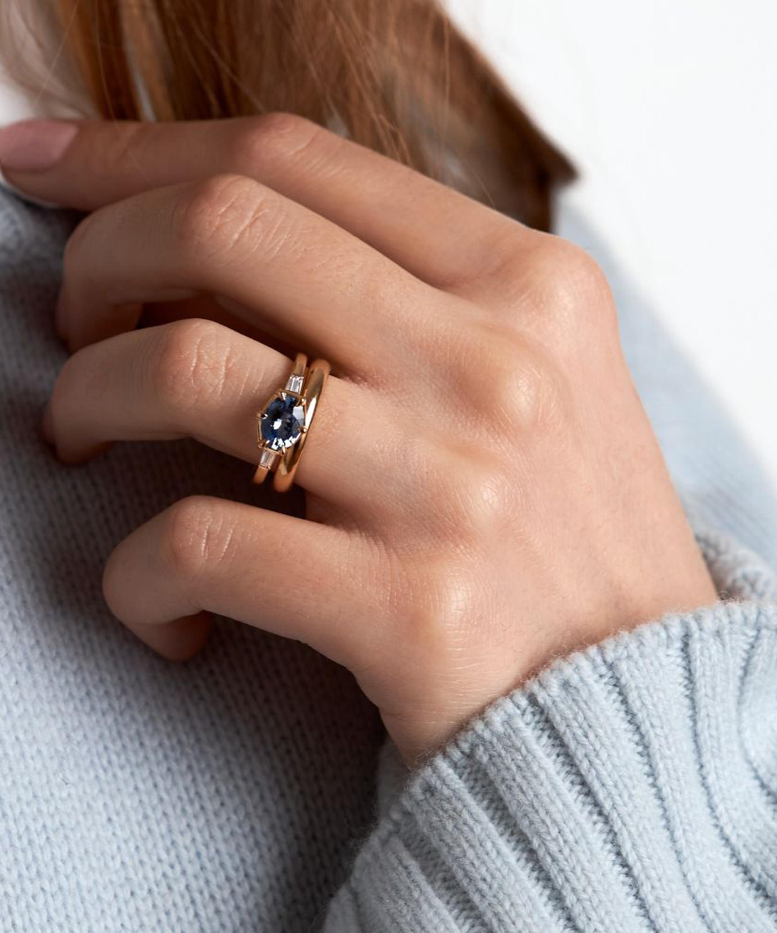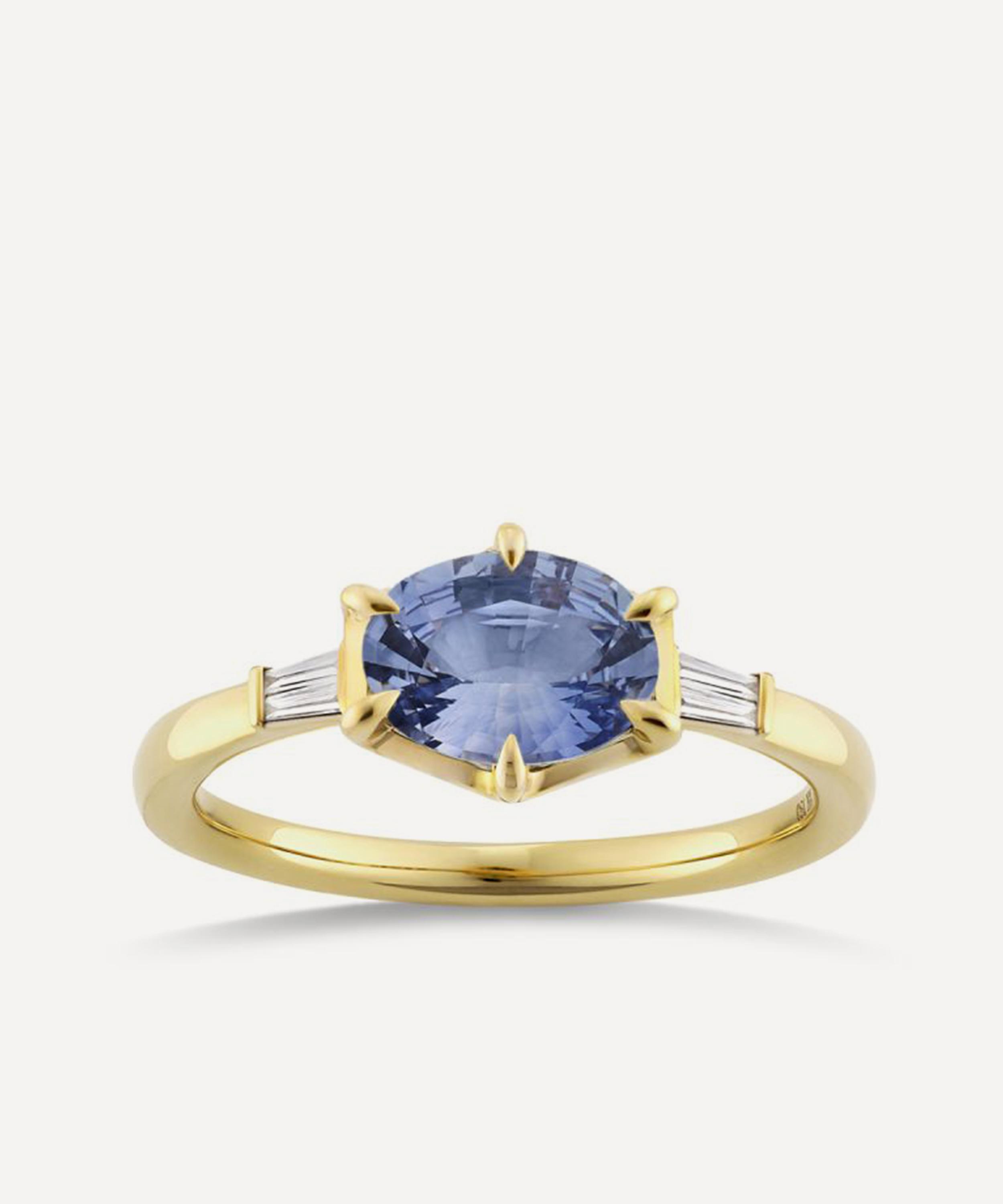 Look effortlessly striking and accelerate the impact of your outfit with the elevating Jenna ring from Dinny Hall. Handcrafted from 18ct gold, it’s fashioned into a polished band adorned with an oval blue sapphire cradled within a hexagonal mount. Paired with tapered baguette cut diamonds, it styles beautifully on its own or stacked with other rings as part of a brightly-coloured curation.