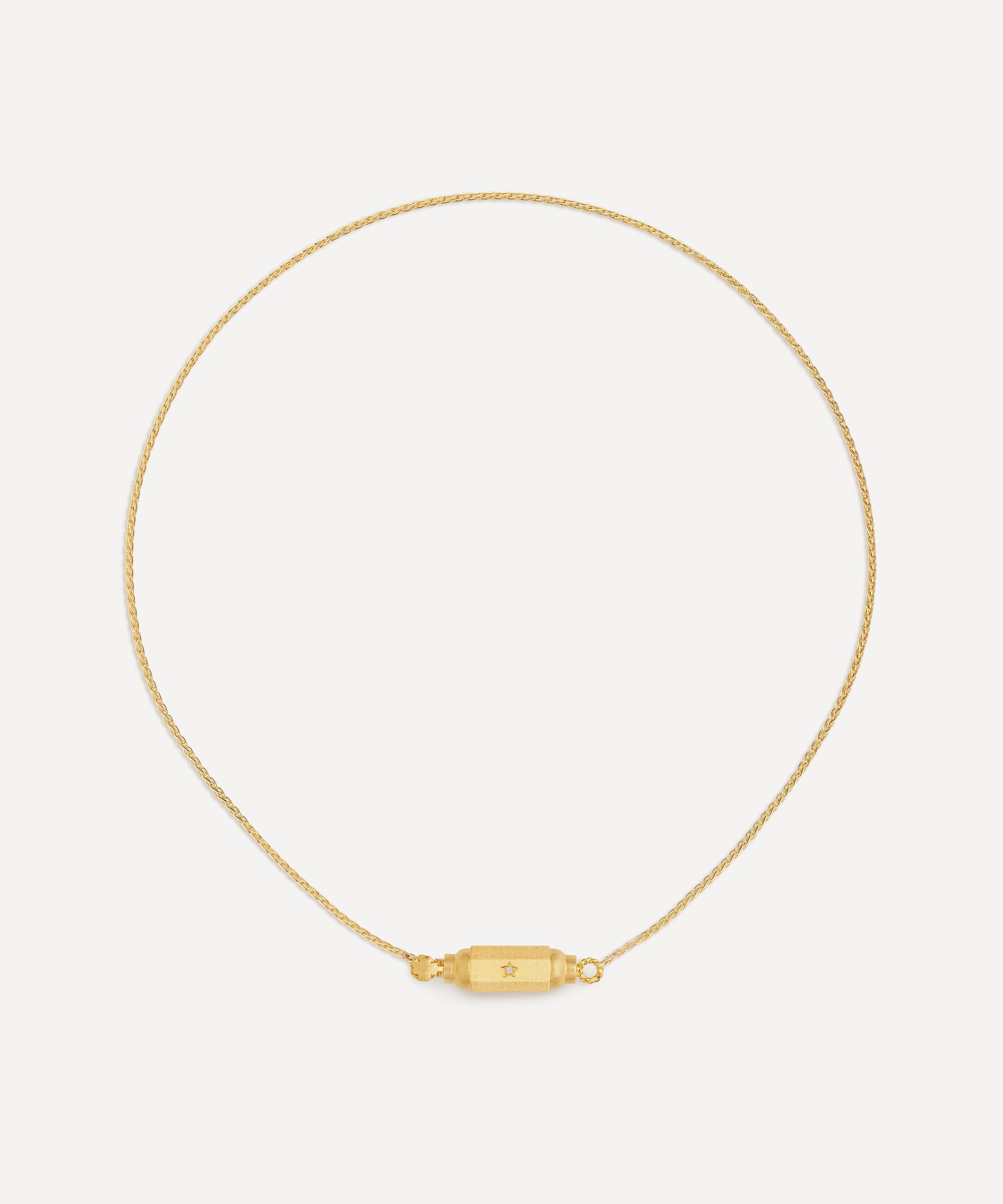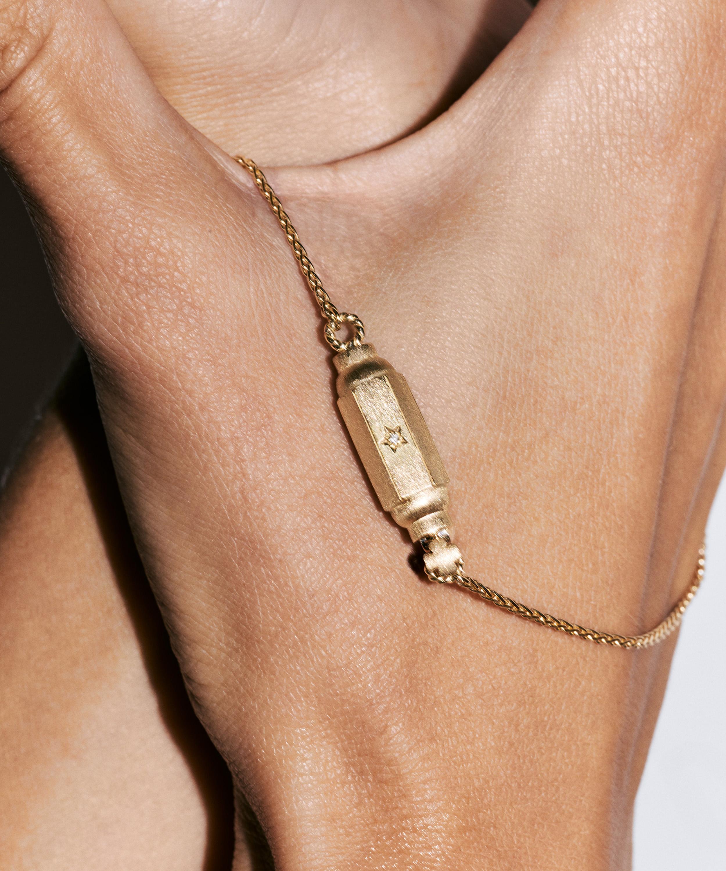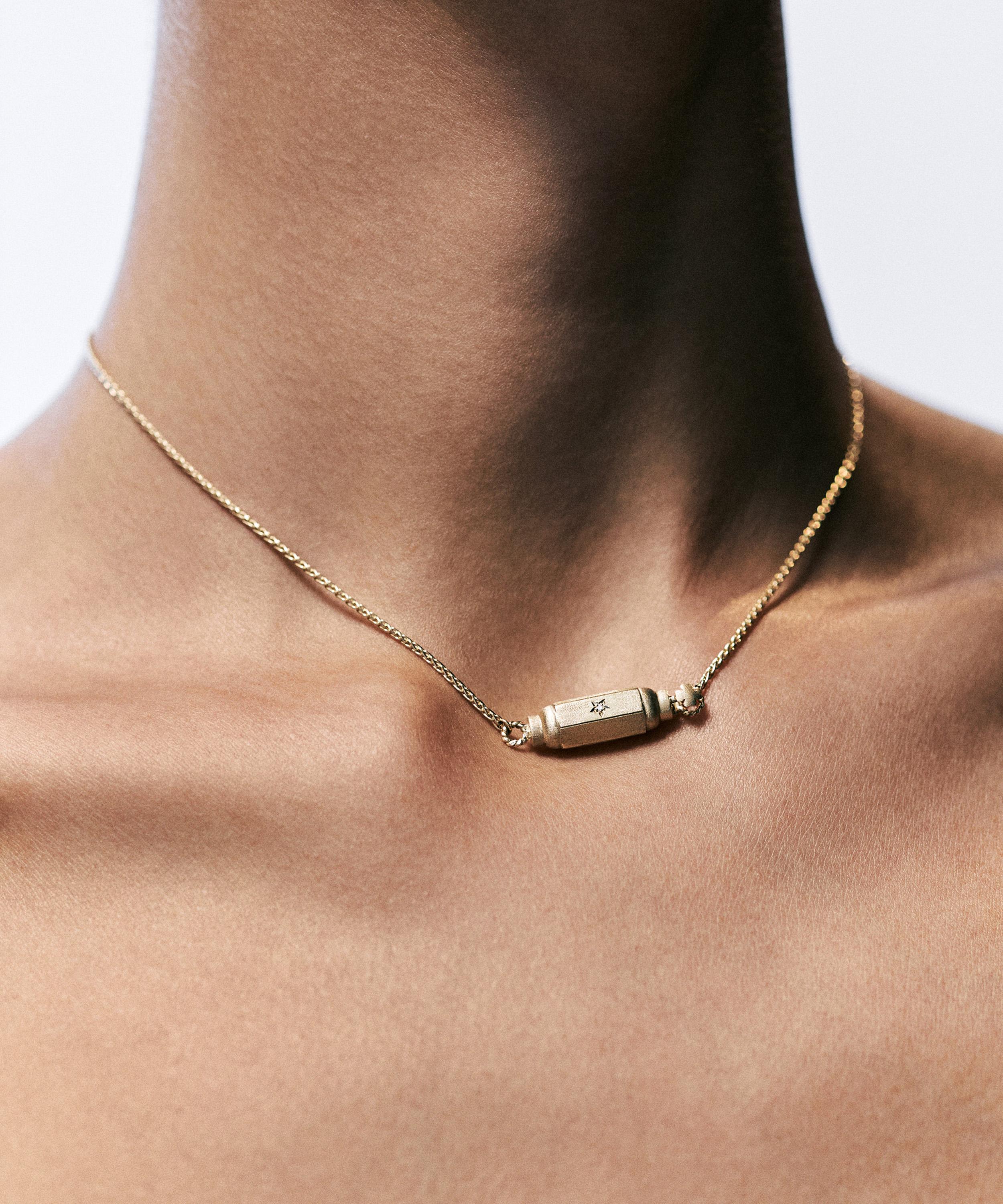 Crafted from 18ct gold, it features a unique Spiga chain elevated by a barrel locket cast in the brand’s signature matte, coco finish with three engraved stars, each set with a tiny diamond. Presenting a true statement piece, this bejewelled necklace shines bright on its own, but looks equally alluring when teamed with one of the barrel bangle bracelets for a stand-out curation of modern heirlooms.