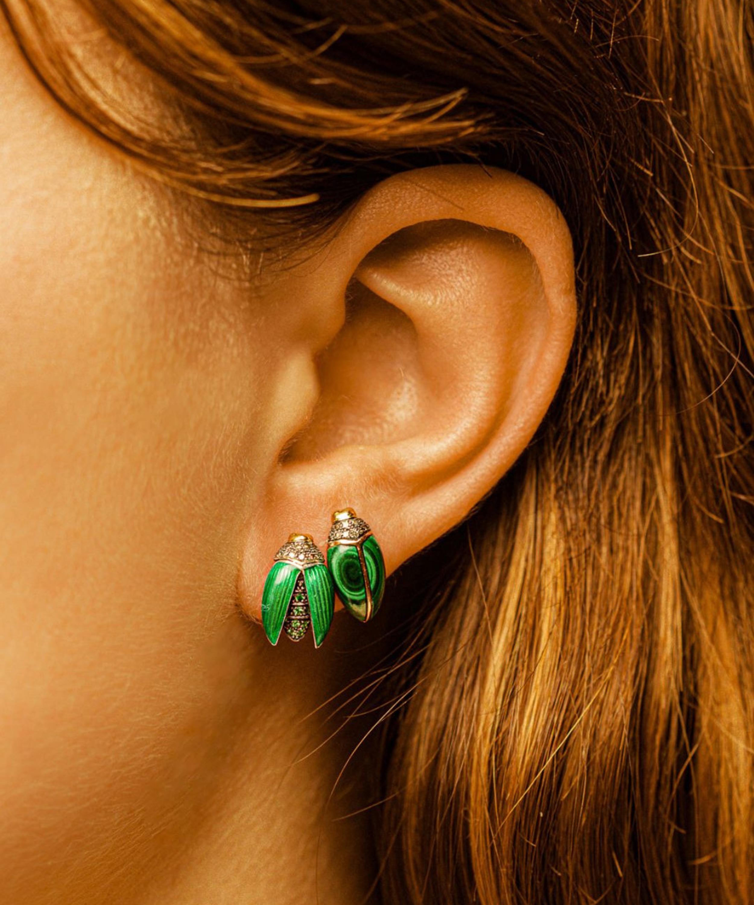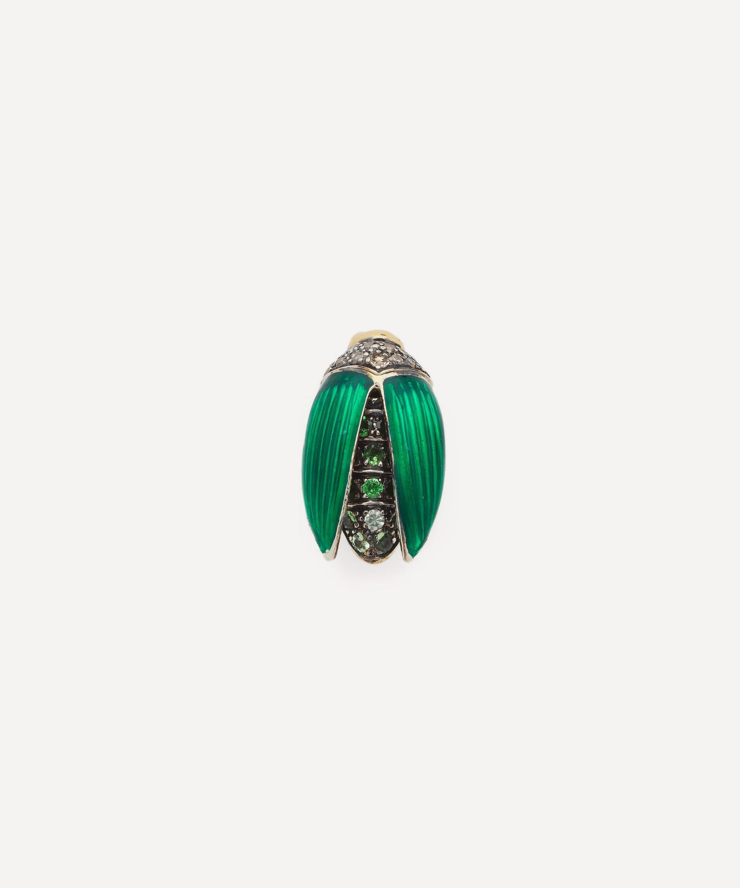Inspired by the auspicious and powerful symbols in Egyptian mythology, this piece captures a scarab beetle taking flight with its stunning green enamel wings. Fashioned in 18ct gold and sterling silver, its sculptural body is embellished with brown diamonds and green tsavorite stones, evoking timeless beauty and meaning. Whether styled in a curated stack, or as a matching pair, wear it as a symbol of your own evolution – untamed, unapologetic, and entirely unique.