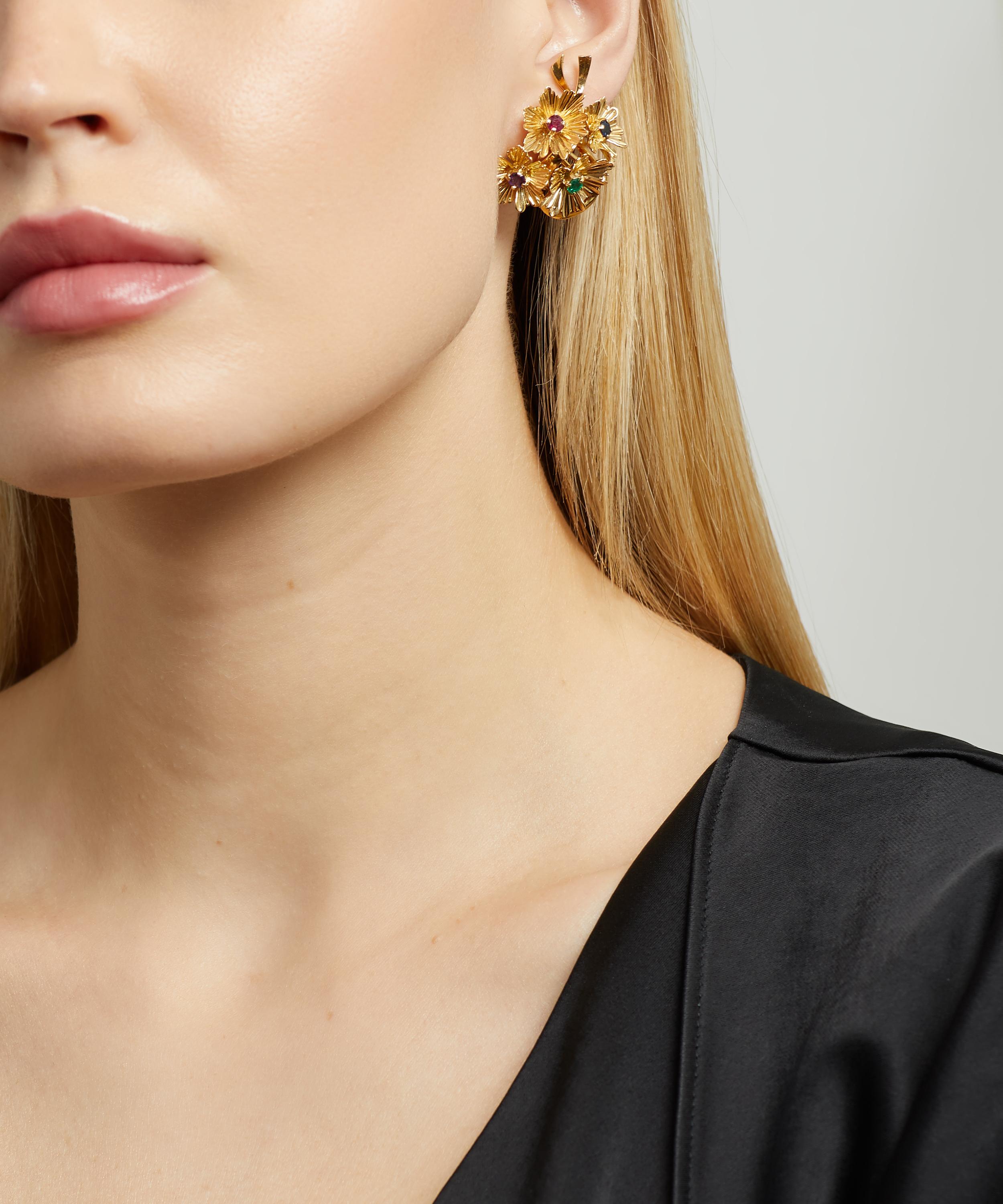 Add a whimsical touch to your accessories repertoire with the Multi-Gem Bouquet stud earrings from Kojis. Crafted from 18ct gold, each of these earrings feature an intricate bouquet of four, textured flowers, each set with a round-cut emerald, ruby, amethyst, or sapphire. Connected by a sculpted ribbon, they offer a charming statement piece – perfect to brighten up a neutral outfit, or play up to the maximalist approach even further.