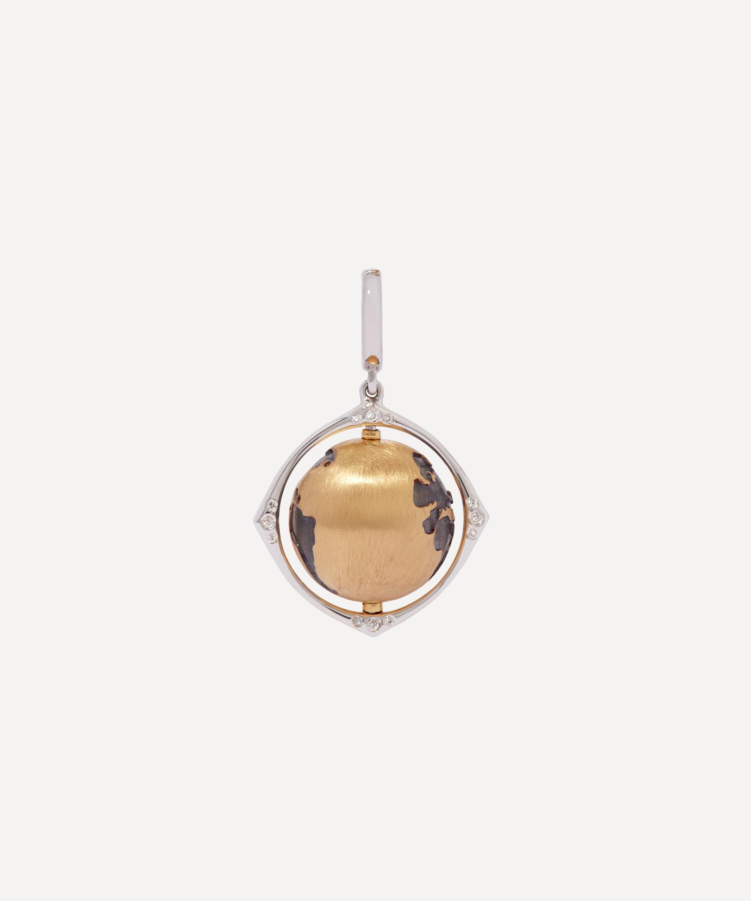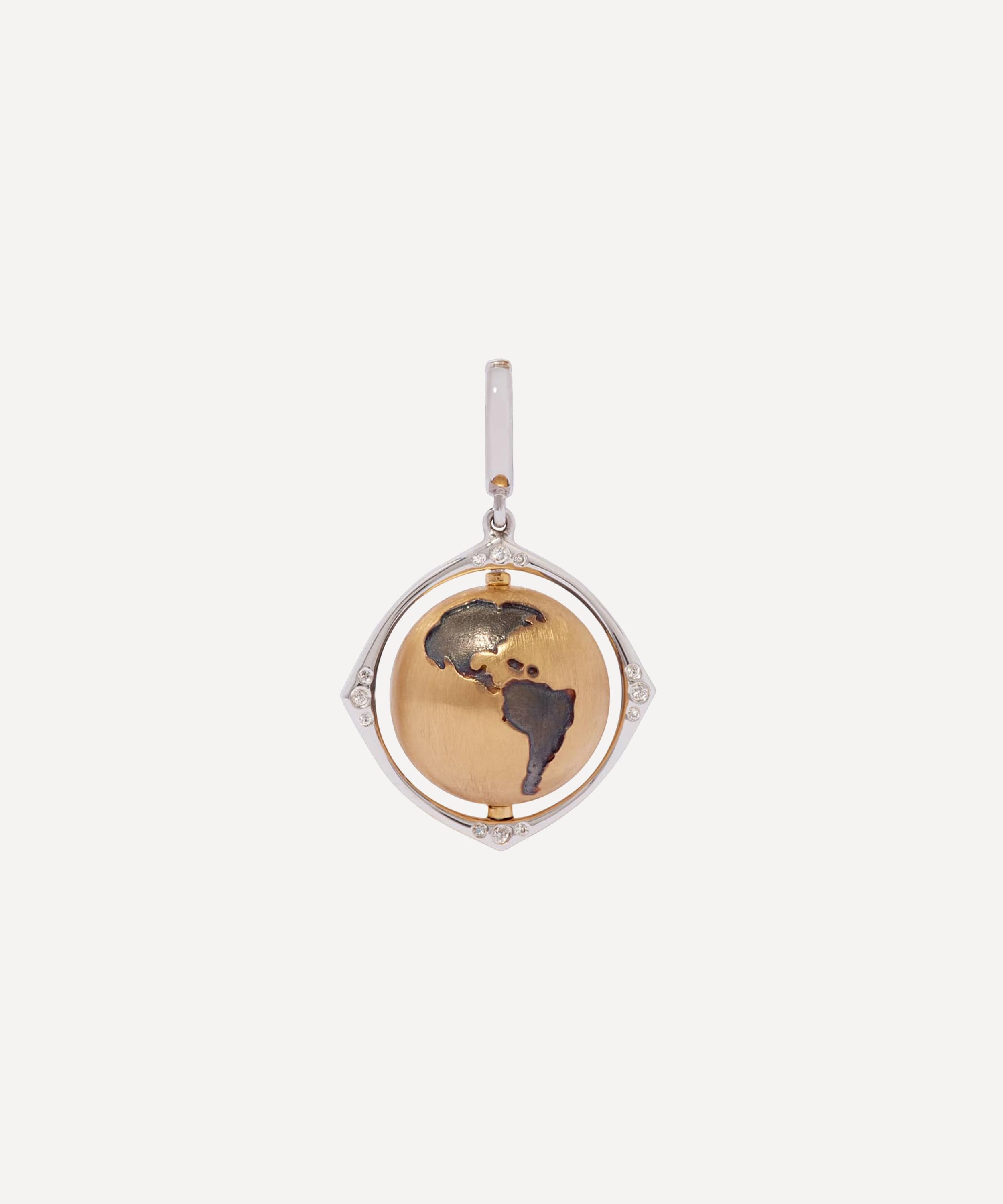 Crafted from solid 18 carat gold, this charm is inspired by Annoushka's larger globe pendant - born from the designer's memory of a spinning globe she had in her nursery as a child. This smaller, satin-finished version is detailed with an intricate black rhodium map and rotates freely inside a polished white gold frame with 24 individually hand-set white diamond accents. Designed to be worn on a fine chain necklace or charm bracelet, it can be styled alone or teamed with your own bespoke curation of symbolic charms.