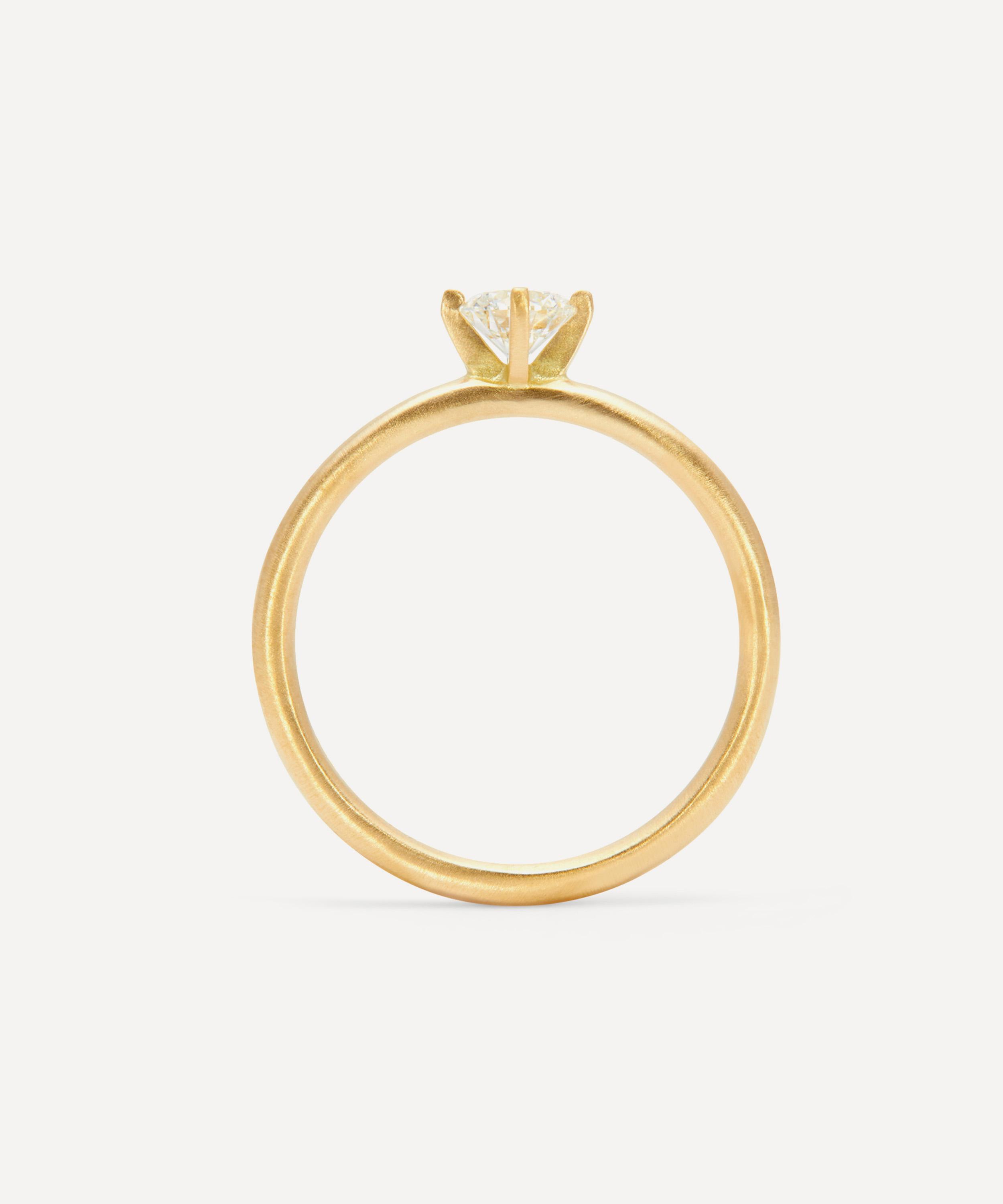 Rendered in solid 18ct gold, it features a sleek, minimal design with a brilliant cut solitaire diamond, fitted into a classic prong setting atop a slim band in a satin matte finish. Partner it with a wedding band or a selection of your favourite rings to build a stack.
