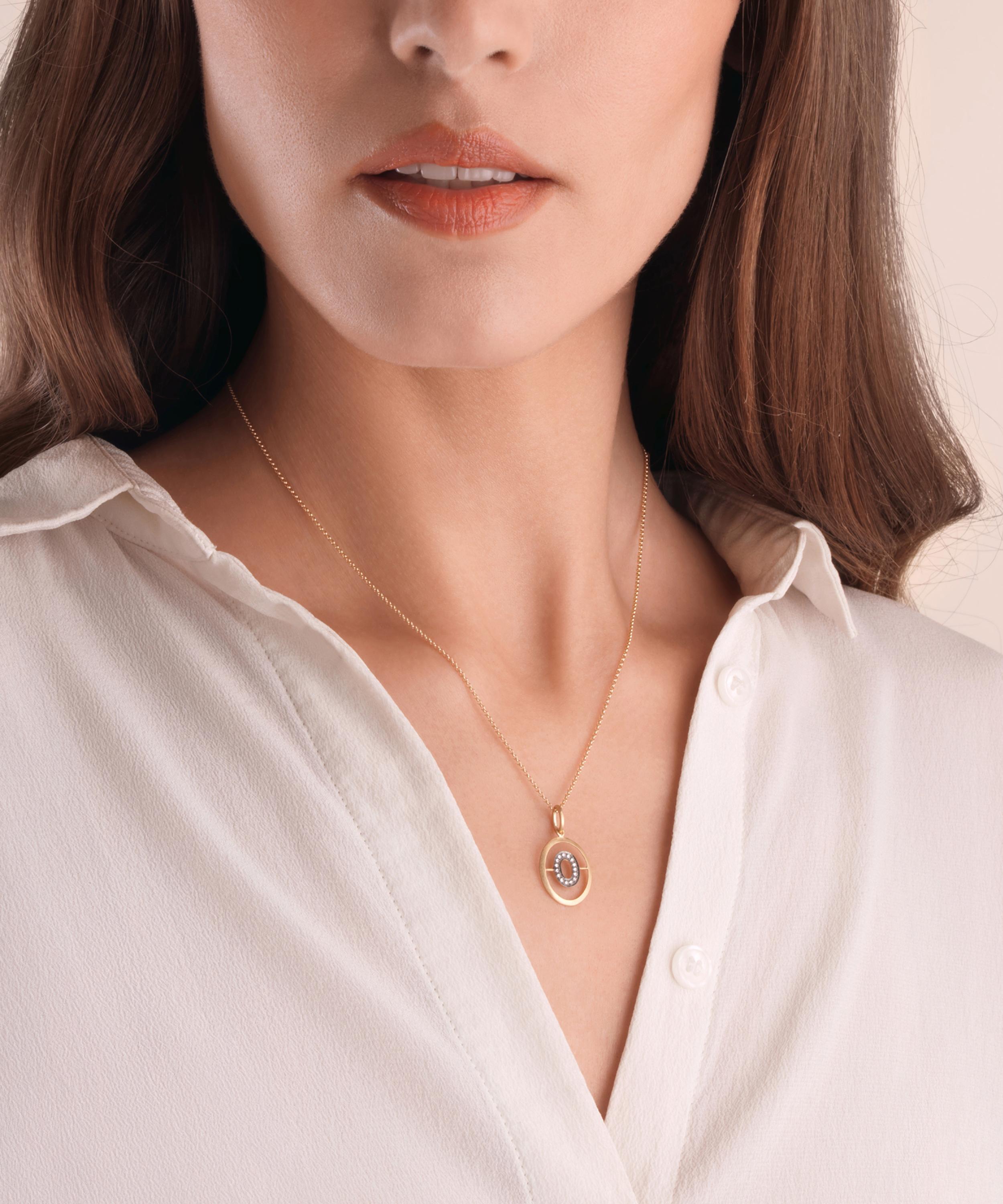 Annoushka offers its signature sophisticated take on alphabet jewellery with the gold Initial pendant – featuring a silver diamond pavé letter fixed inside a gold oval with a soft satin finish.