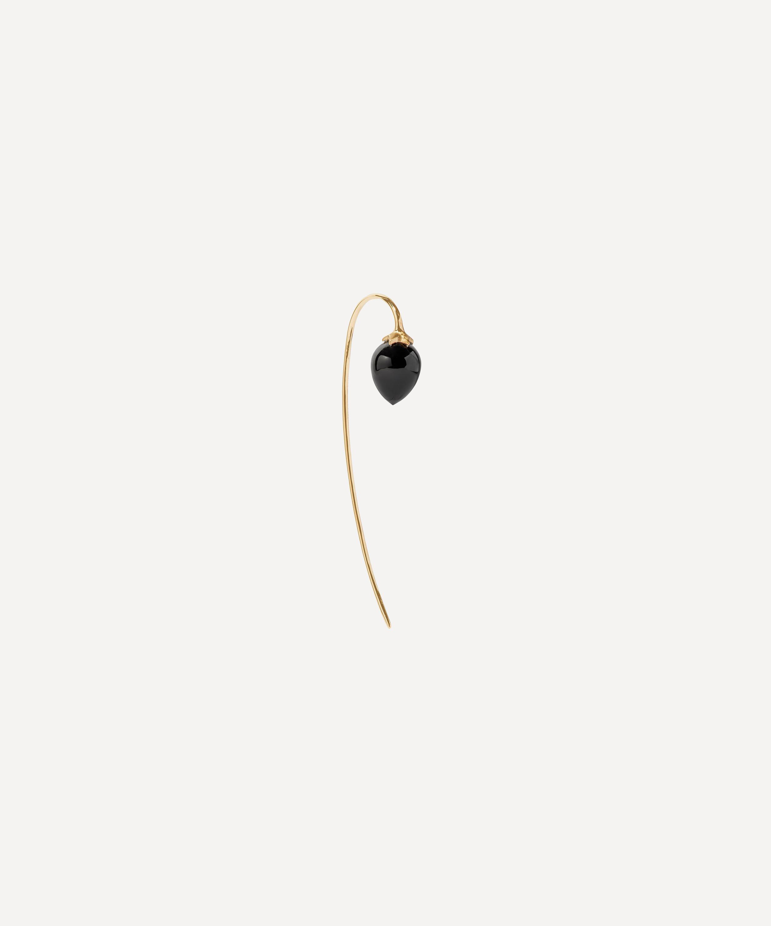 Crafted from solid 18 carat gold, these earrings take inspiration from a collection of colourful seeds from Annoushka's travels to Africa. With a unique hooked silhouette, each one features a cabochon cut onyx seed at the front and a long curved ear wire that sweeps down from behind the lobe. Style them with mismatched gold studs and stacks of huggie hoops for a heavily embellished finish.