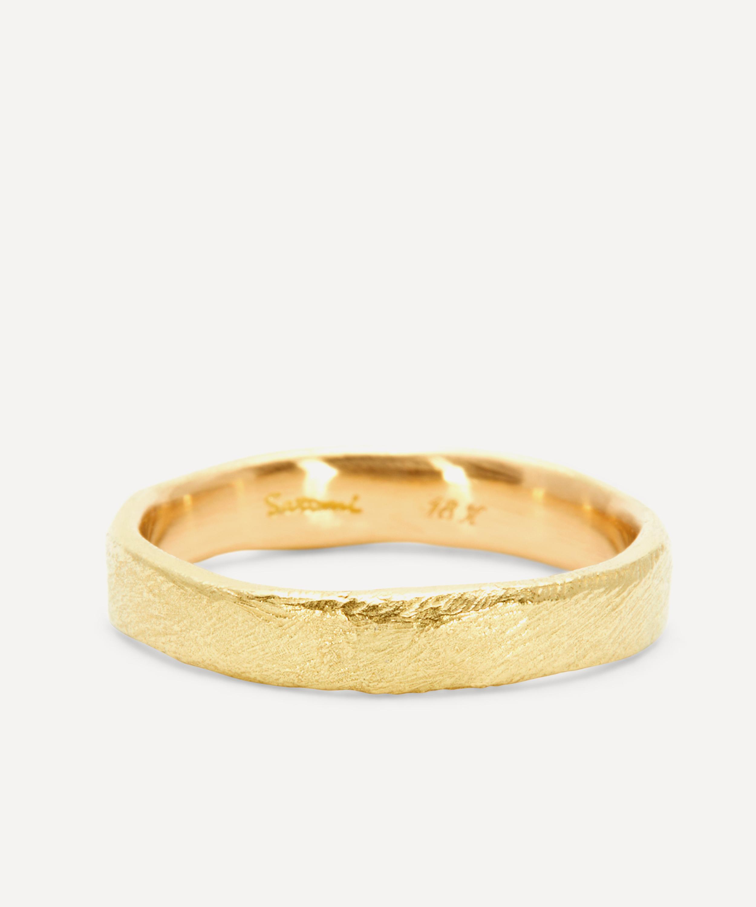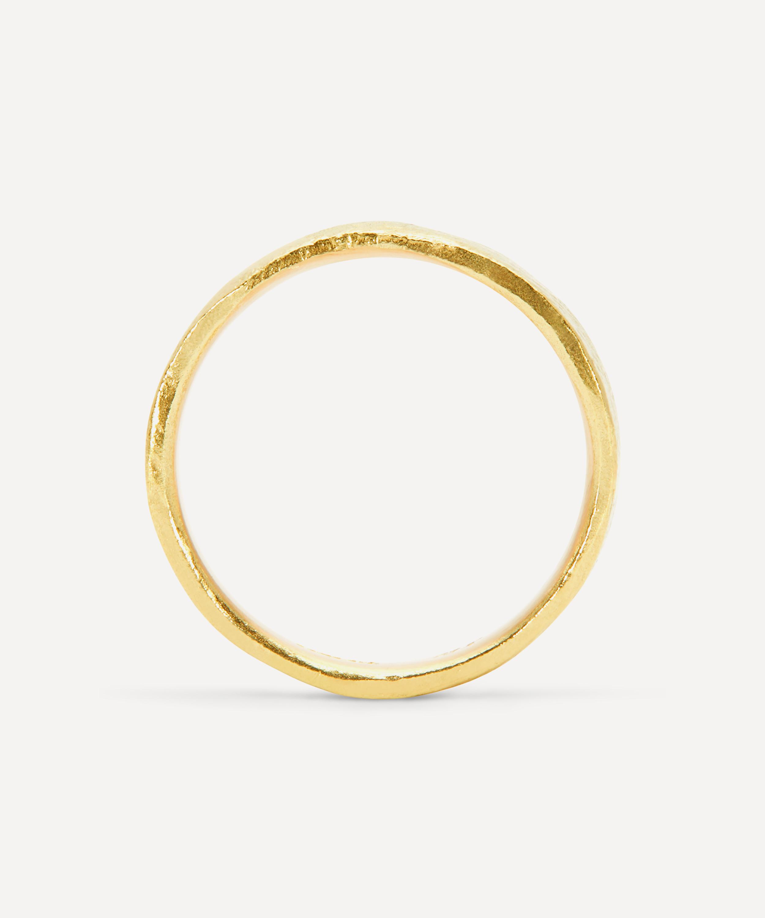 Crafted from solid 18ct gold, this versatile ring features a thin band in an organic, textured finish, offering a rustic yet elegant aesthetic. Exemplifying the designer’s truly timeless approach to everyday jewellery, it can be styled as an everyday piece or as a unique wedding band.
