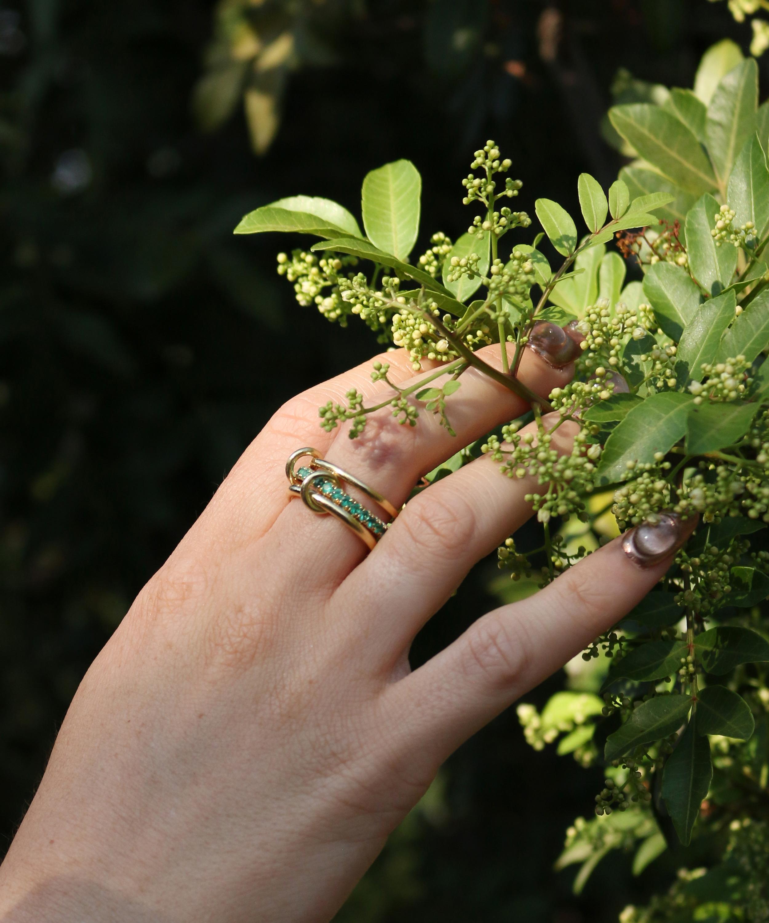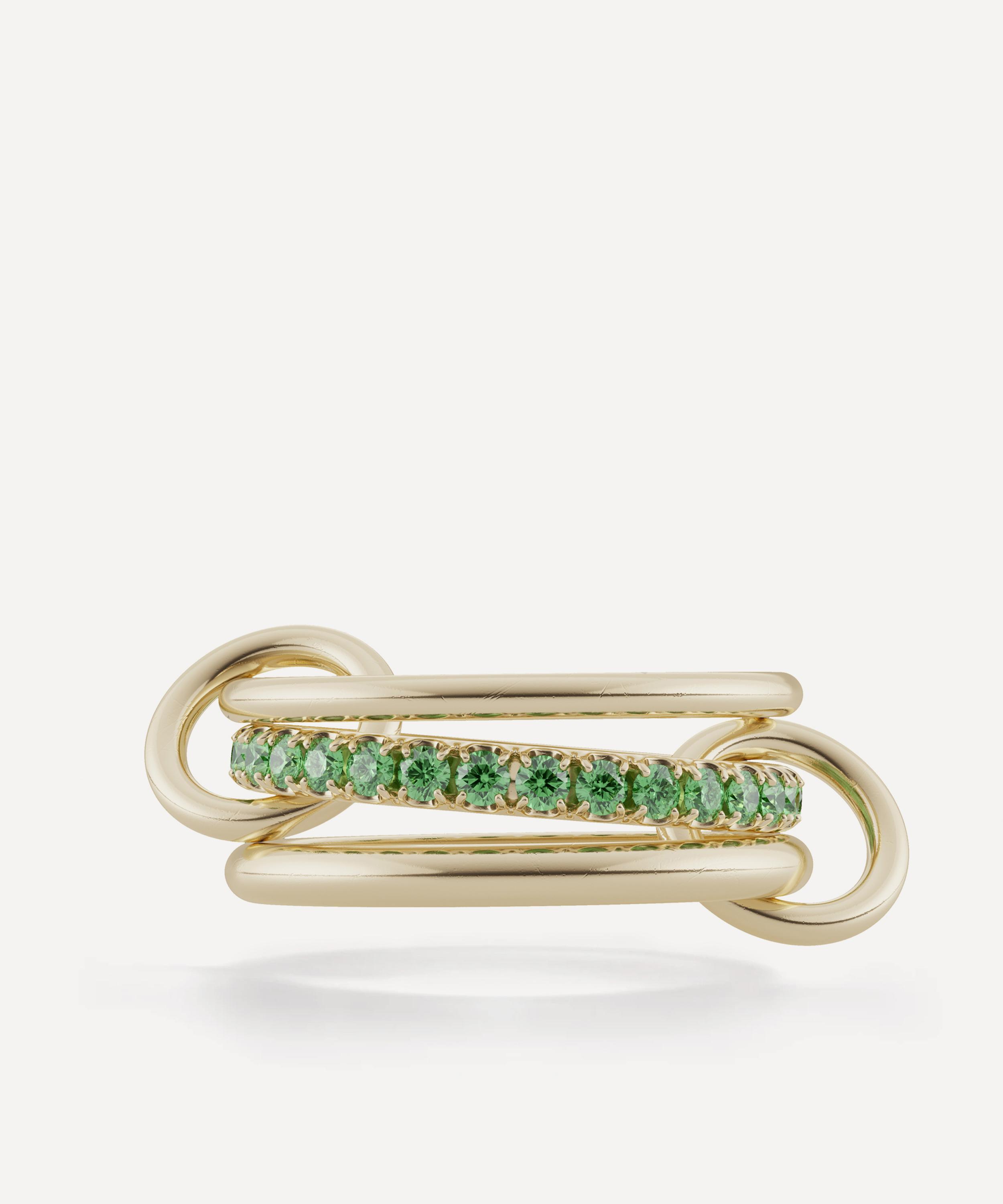 Build the perfect elevated ring stack and create your unique style with the Petunia Emerald ring from Spinelli Kilcollin. Renowned for their clean, conceptual and innovative designs, this contemporary piece features an interconnected silhouette composed of three bands of varying gauges in 18ct gold, one of which is adorned with pavé-set emeralds. Two tactile connectors in 18ct gold link each band together – layer it with other rings, or style it on its own.