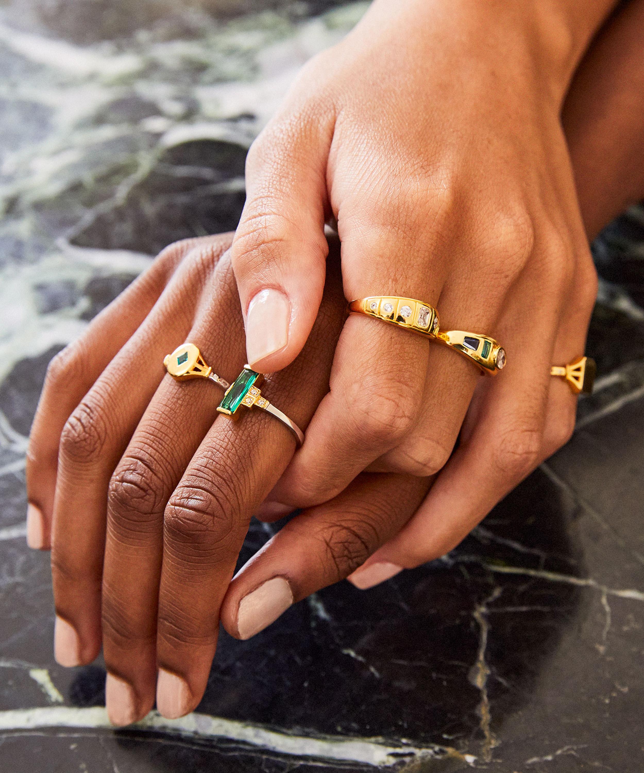 Vibrant gold and green hues come together to form this Art Deco-inspired piece, featuring a baguette cut created emerald on 18ct gold-plated shoulders embellished with sparkling cubic zirconia accents. Set on a silver shank, it’s bound to become a new jewellery box staple – style with the matching earrings and necklace for a coordinated look.