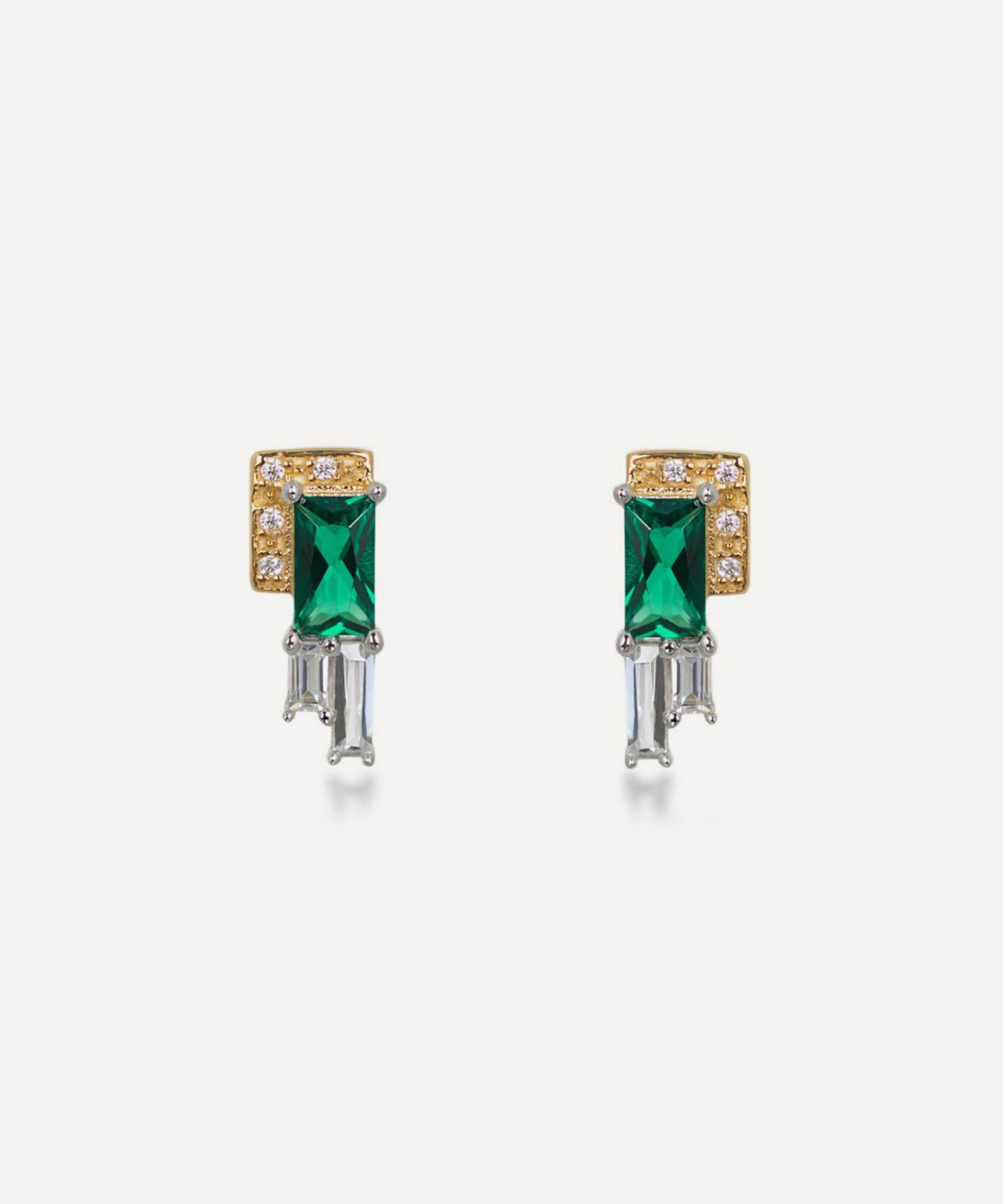 Vibrant gold and green hues come together to form this Art Deco-inspired piece, each earring features a baguette cut created emerald and two baguette cubic zirconia on an 18ct gold-plated setting embellished with sparkling cubic zirconia accents. Bound to become a new jewellery box staple – style with the matching ring and necklace for a coordinated look.