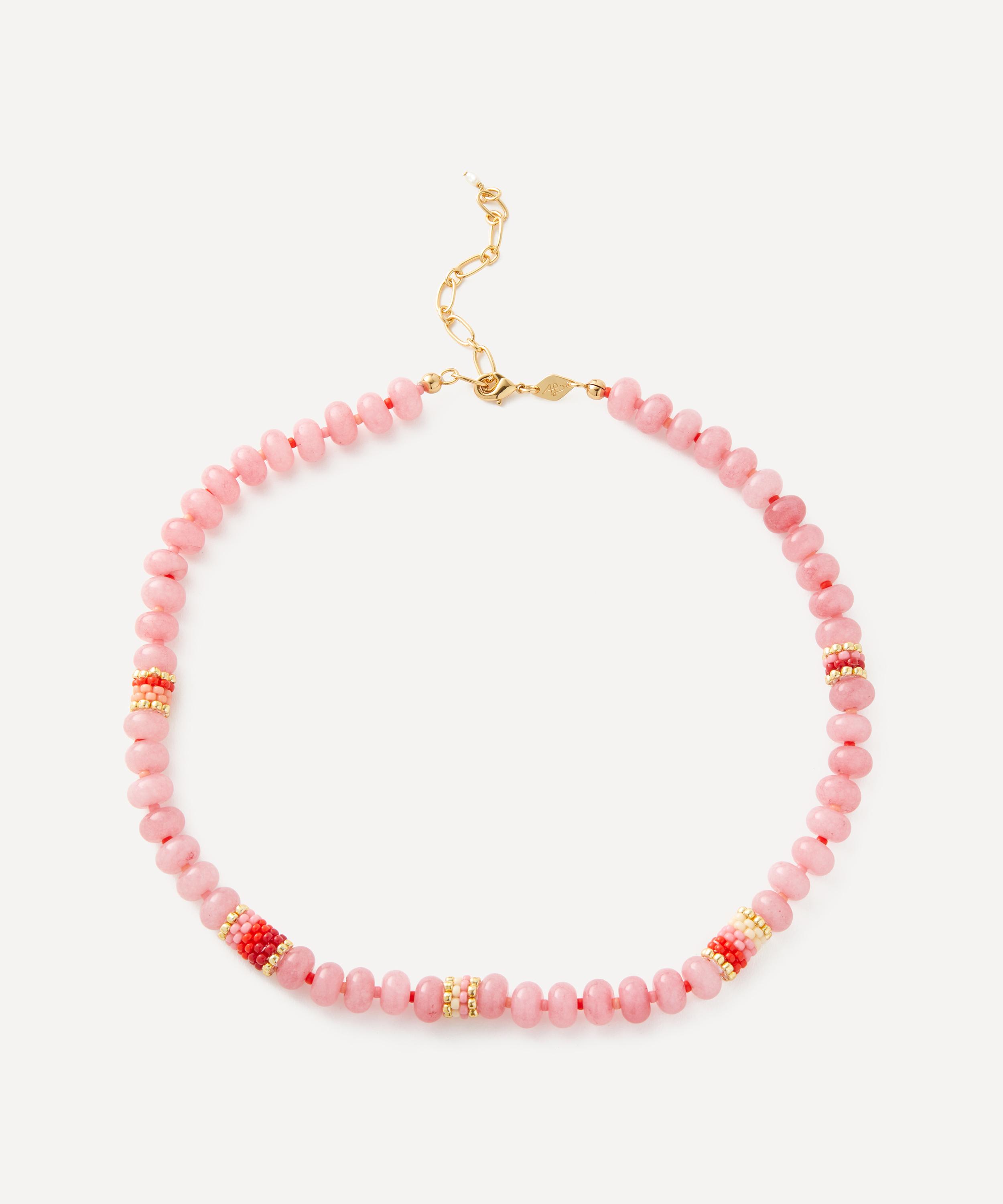 Noting says summer-ready quite like Anni Lu’s Barrel bead necklace – designed to infuse your look with a free-spirited, tropical aesthetic. Handcrafted using the traditional Mexican Huichol technique, it features a string of joyful jade beads, detailed with intricate glass- beadwork and finished with an adjustable chain in 18ct gold-plated silver. Lean into beachy-chic and double up on beaded necklaces, or team this mood-boosting piece with a stack of gold chains and pendant necklaces for a contrasting effect.