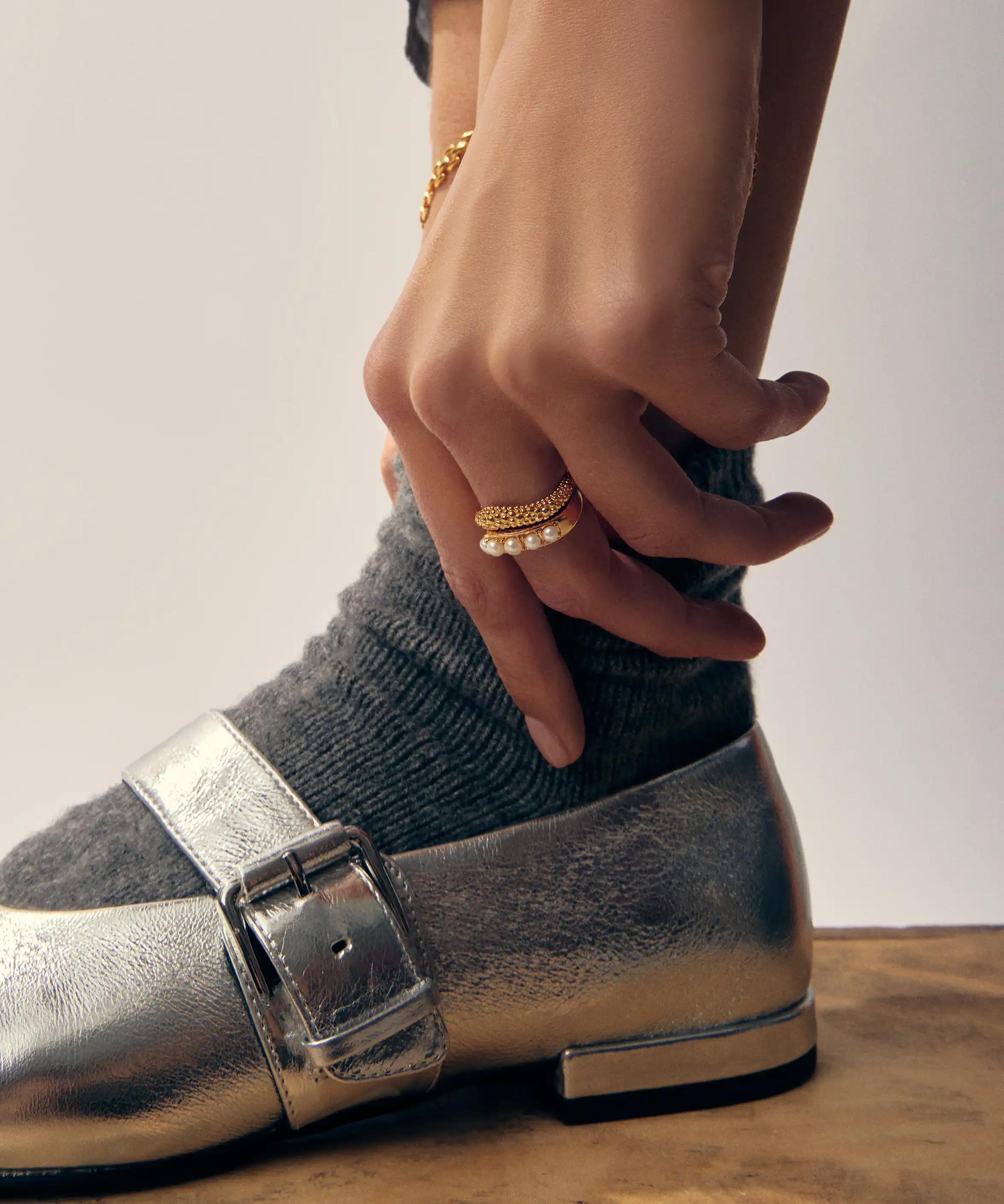 Impeccably crafted from 18ct gold-plated brass, this set is comprised of two coordinating rings, both shaped into a triangle silhouette, but with one in a unique, vintage-inspired design and the other adorned in pearls. Style yours stacked for a dynamic curation shape and texture or wear them separately.